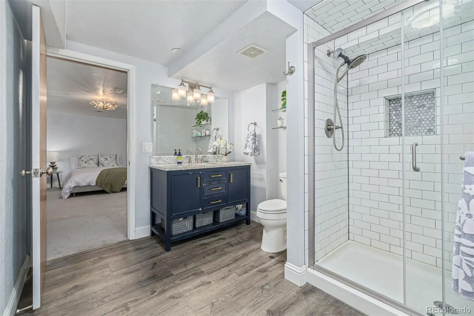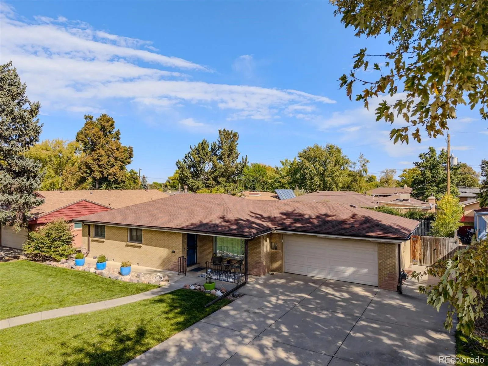Located in the peaceful Bel Aire neighborhood of Wheat Ridge, this brick Mid-Century masterpiece blends classic charm with contemporary updates and is set on a lush, manicured lawn, perfectly situated between Golden and downtown Denver. Upon entering this turnkey home, you are greeted by a bright living room featuring a coved ceiling and a large picture window that fills the space with natural light. Gleaming refinished oak hardwoods extend throughout the main level’s three bedrooms and living areas, leading you to the kitchen with granite countertops, handcrafted cherry cabinetry, stainless steel appliances, a new dishwasher, and deep pantries for ample storage. The dining area’s oversized window overlooks the beautifully maintained, fully fenced backyard—an ideal setting for dining, entertaining, or playing your favorite outdoor games. Relax in the main-floor, spa-inspired bathroom featuring tub-to-ceiling white Moroccan tile, a newly installed marble vanity, and a deep Kohler soaking tub. On the lower level, you’ll find a sizable non-conforming bedroom with new carpet and a luxurious en suite bath with a walk-in shower, Euro glass doors, and a marble vanity. The lower level can also function as a media room, guest suite, or home office. Double paned windows with granite and cherry wood trim provide year-round insulation, while new modern lighting and Lutron dimmers in every room create the perfect ambiance for any occasion. The spacious attached two-car garage offers built-in shelving for storage. The expansive 790 sq ft crawlspace, lined with a reinforced 10-mil vapor barrier, keeps your storage clean and dry. Free unlimited watering of your lawn using the irrigation well. Conveniently located three minutes from I-70 for quick access to the mountains and Golden’s hiking trails, minutes from downtown Denver, Union Station, the 240 acre Crown Hill Park, Highlands, Sloan’s Lake and Tennyson St shopping and entertainment.