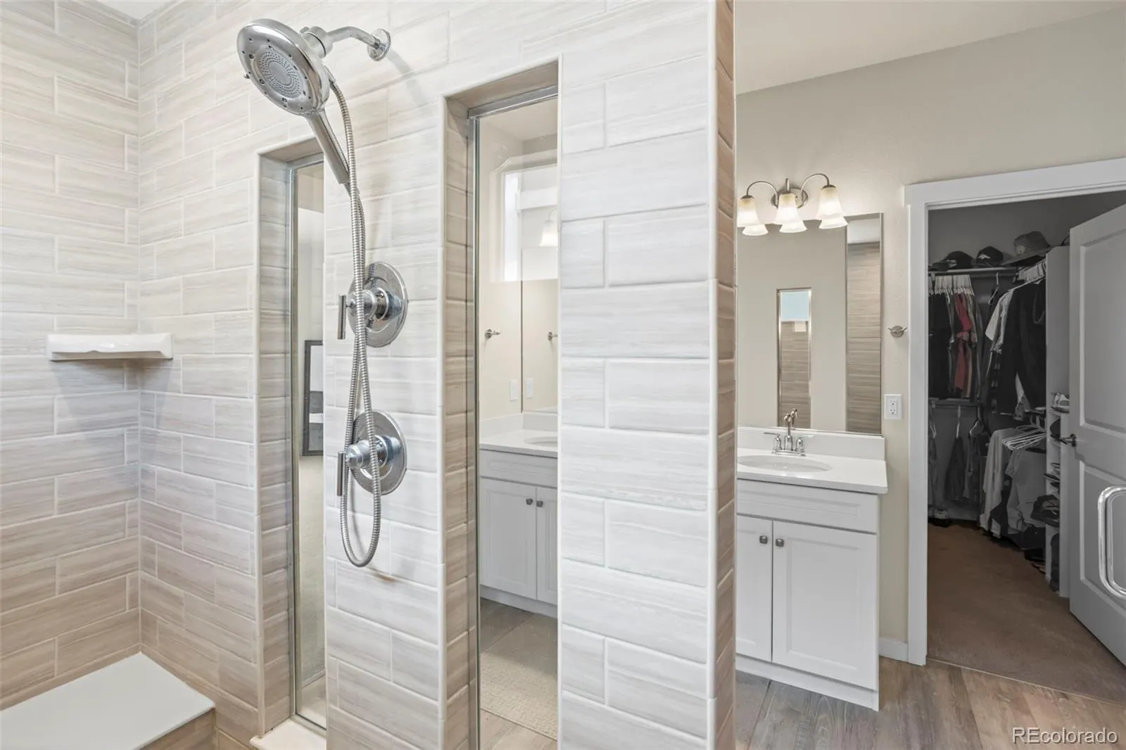 The main-level primary suite is a serene retreat. The primary bathroom features a large shower with dual shower heads, a built-in bench, dual vanities, and a spacious walk-in closet with organizers.