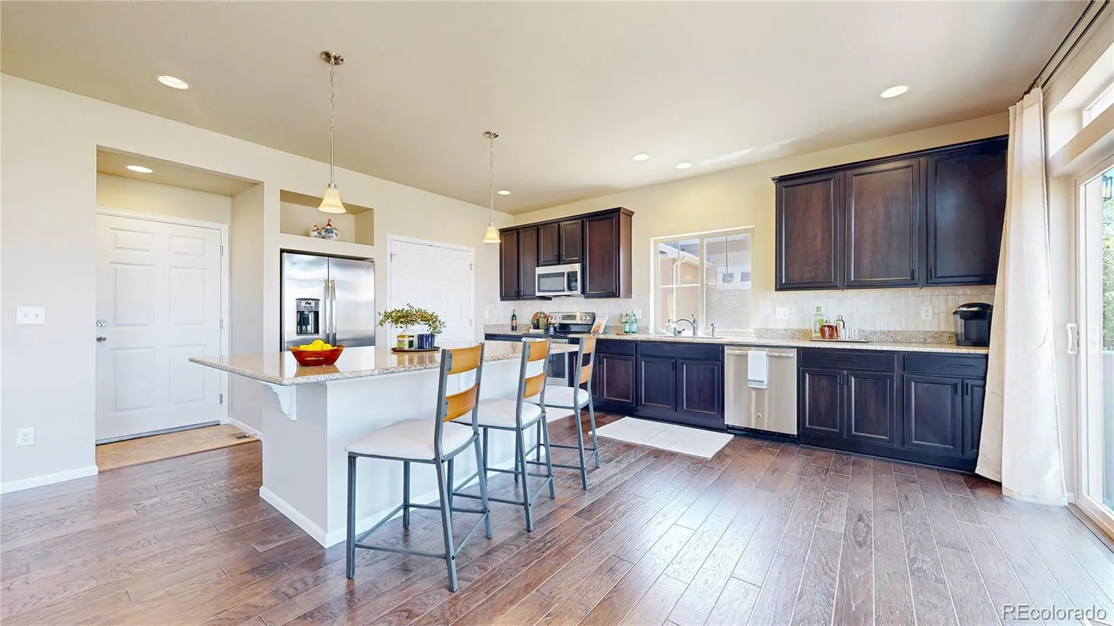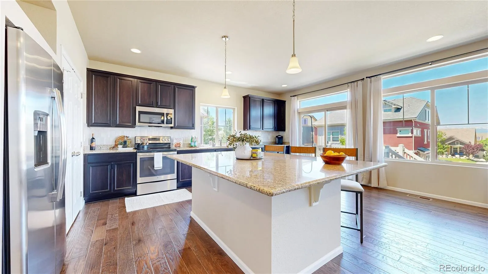 PROTECTED PANORAMIC MOUNTAIN VIEWS of the Front Range from the Master Bedroom! Wake up to STUNNING MOUNTAIN VIEWS for a fraction of what you’d expect to pay for protected views! Nestled in Erie’s coveted Erie Highlands community, this stunning home offers 3 bedrooms and 3 bathrooms of modern living at its finest. The moment you enter, you’re welcomed by an expansive open-concept layout filled with natural light, showcasing designer finishes including wood flooring, soaring ceilings, and contemporary neutral tones throughout. The gourmet kitchen serves as the heart of the home, featuring premium stainless steel appliances, sleek granite countertops, tile backsplash, a spacious island with seating, and ample cabinetry – perfect for both everyday meals and entertaining. The airy great room features a bank of windows that let in amazing light and offer stunning mountain views. A flex room on the main floor offers endless possibilities – set it up as a formal dining area, home office, or creative space to fit your needs. Upstairs, the luxurious primary suite impresses with a spa-like bathroom, and a generous walk-in closet! Two additional bedrooms, an additional bathroom with a soaking tub, and a family room round out the upper level. This home features a 3-car garage, and an unfinished walk-out basement – perfect for any updates you’d like to make. Outdoor living shines with a nice upper deck facing the mountains and a patio below. Residents enjoy access to the exceptional amenities, including a pool, clubhouse, fitness center, parks, and community gathering spaces. Everyone will love the convenience of having elementary, middle, and high schools just minutes away. With its prime location near shopping, dining, endless trails, and easy access to I-25 and E-470, this home offers the perfect blend of suburban tranquility and modern convenience in one of Colorado’s most desirable communities.