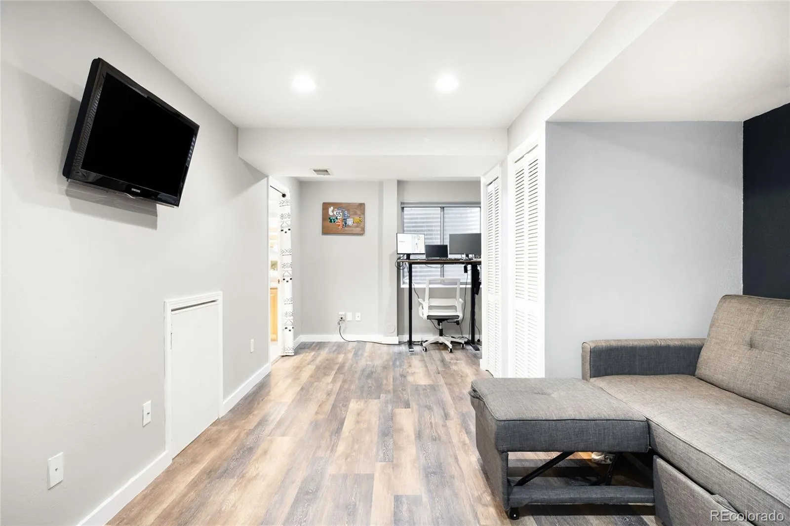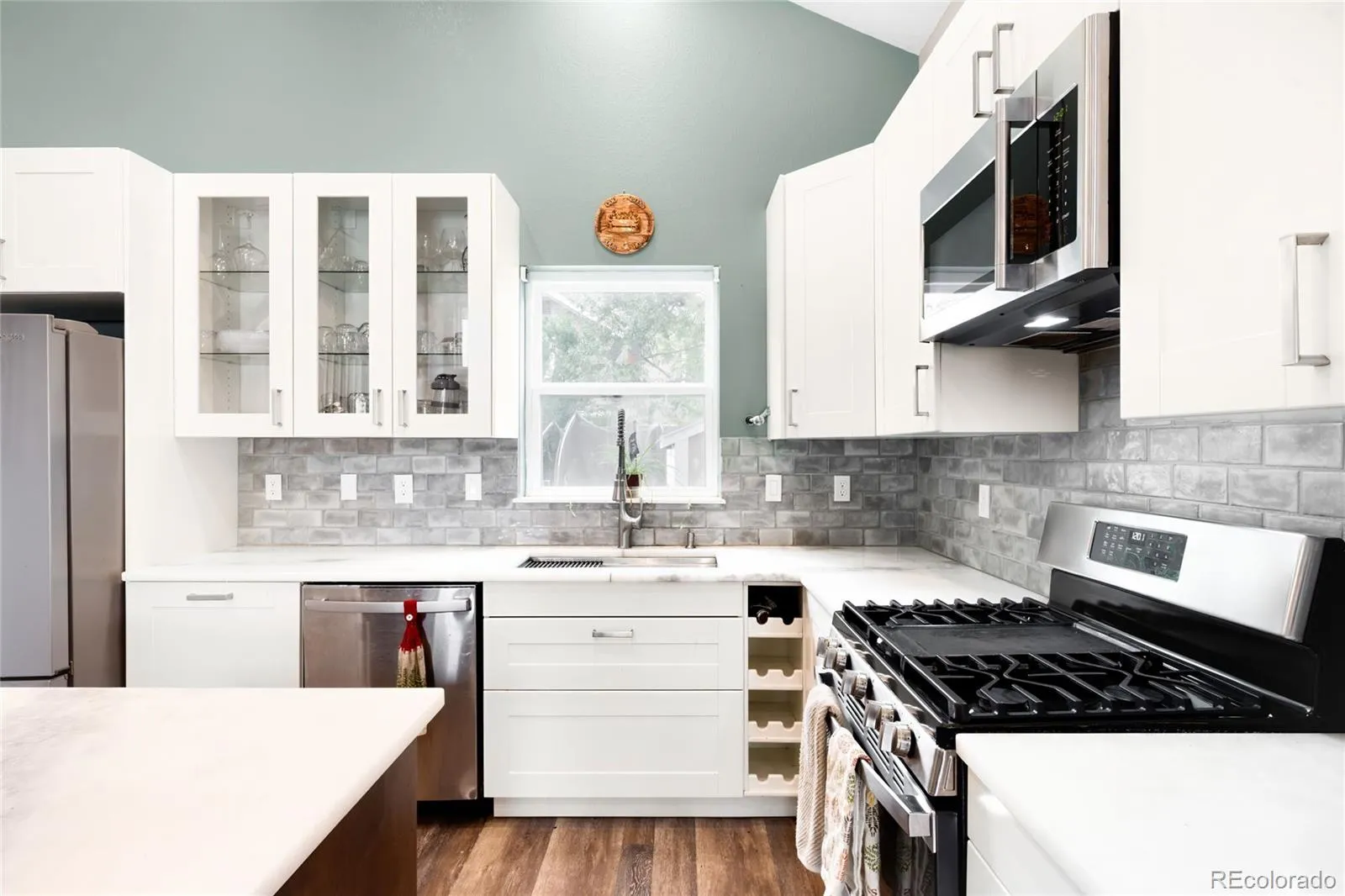 Ideally located on a spacious corner lot in Meadowlake West, this stylishly updated Arvada home blends timeless comfort with modern sophistication. A bright, open layout welcomes residents with vaulted ceilings and an airy flow between the living, dining and kitchen spaces. The recently remodeled kitchen impresses with beautiful quartz countertops, a stylish tile backsplash, stainless steel appliances and a large center island — the ideal gathering spot for guests. Brimming with natural light, the inviting living area features a charming wood-burning fireplace, with a gas setup option available for flexibility. Downstairs, a finished basement offers a rec room or optional fourth bedroom, a ¾ bath and laundry area. Retreat outdoors to a private backyard with a stamped concrete patio, mature trees and a newer shed. With updates including a modern electrical panel, repoured driveway, and upgraded HVAC ductwork, this home is move-in ready in one of West Arvada’s most central neighborhoods.