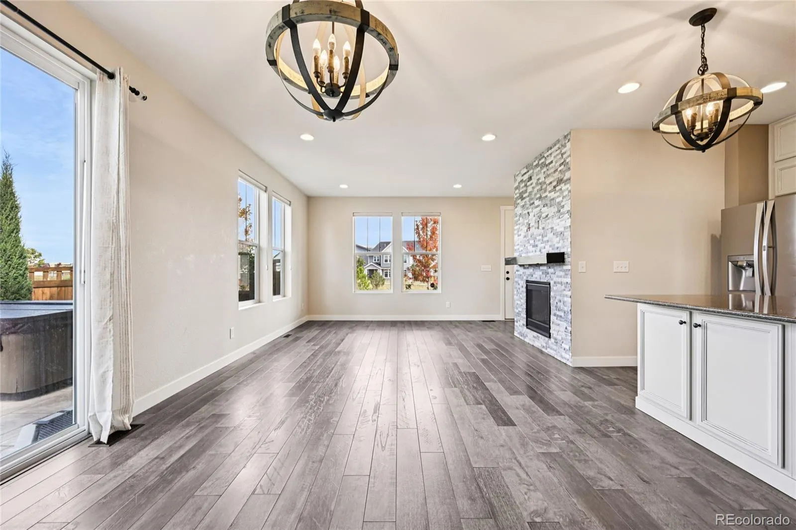 Inside, the open main level offers seamless flow between the kitchen, dining, and living spaces—ideal for both everyday living and entertaining. The kitchen features stainless steel appliances, a large island with breakfast bar, and a sliding glass door leading to the patio for effortless indoor-outdoor living.