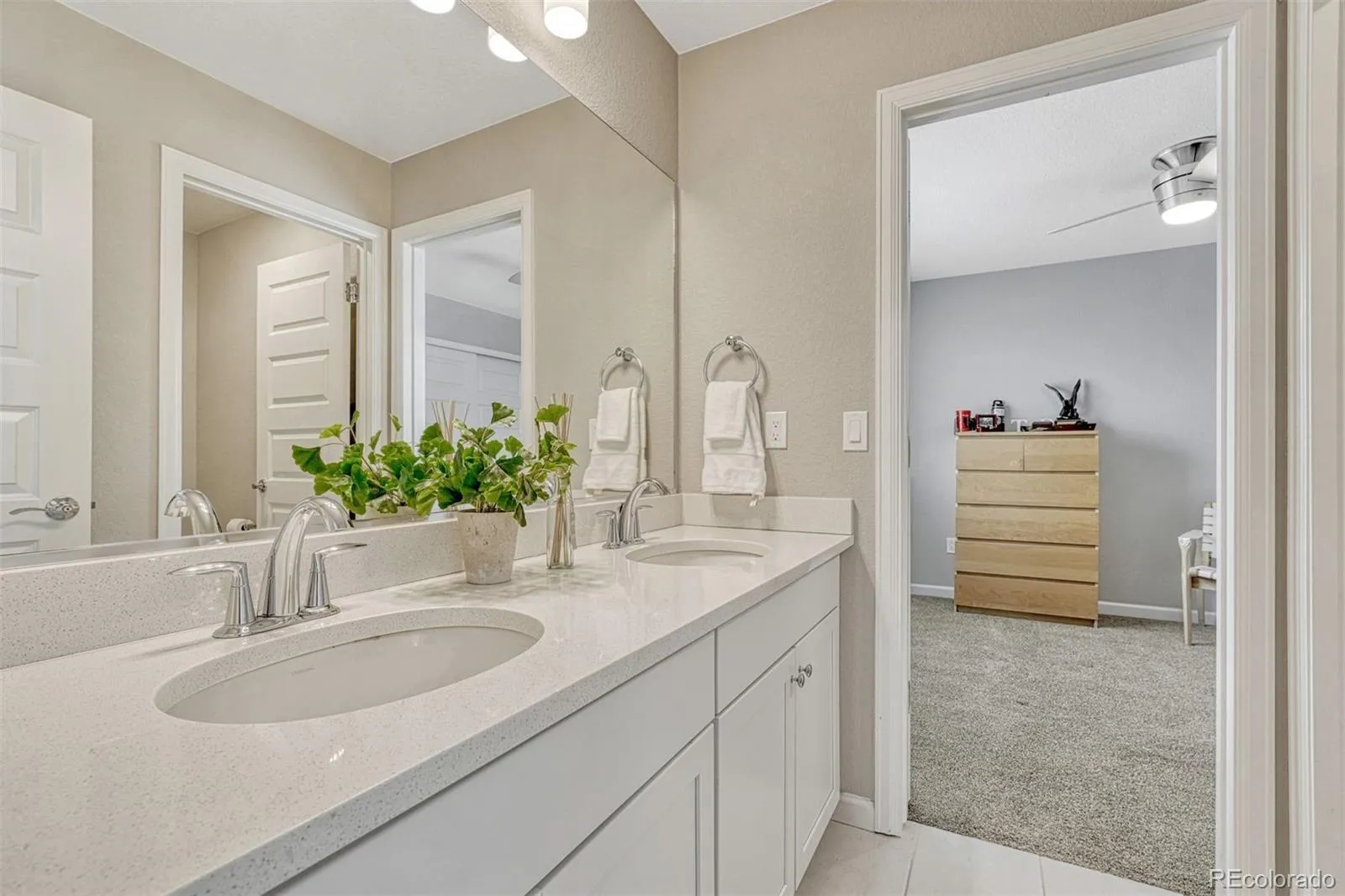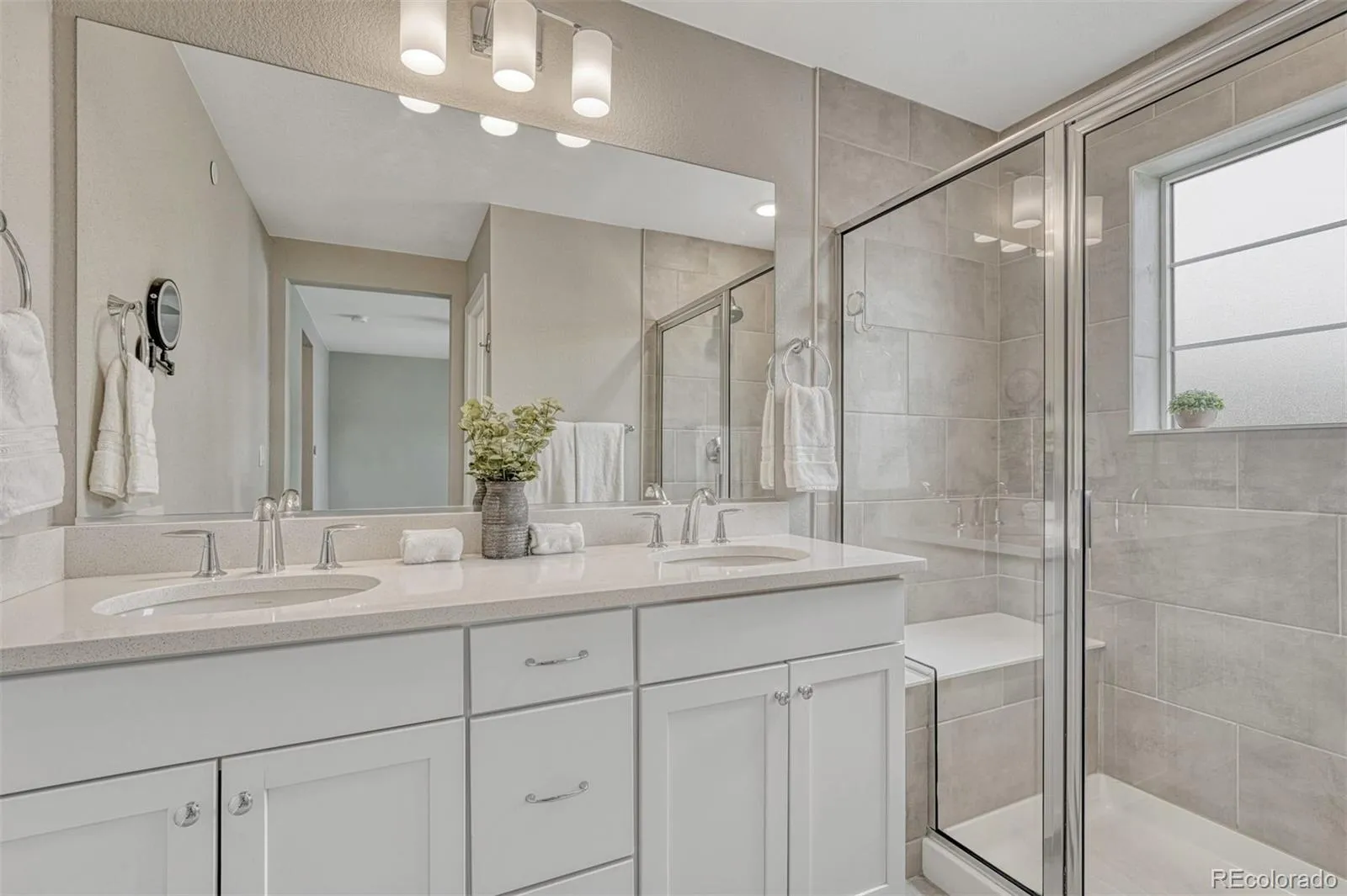 en-suite bath with dual vanities and a walk-in shower. Two additional bedrooms share a full bath and both have ample