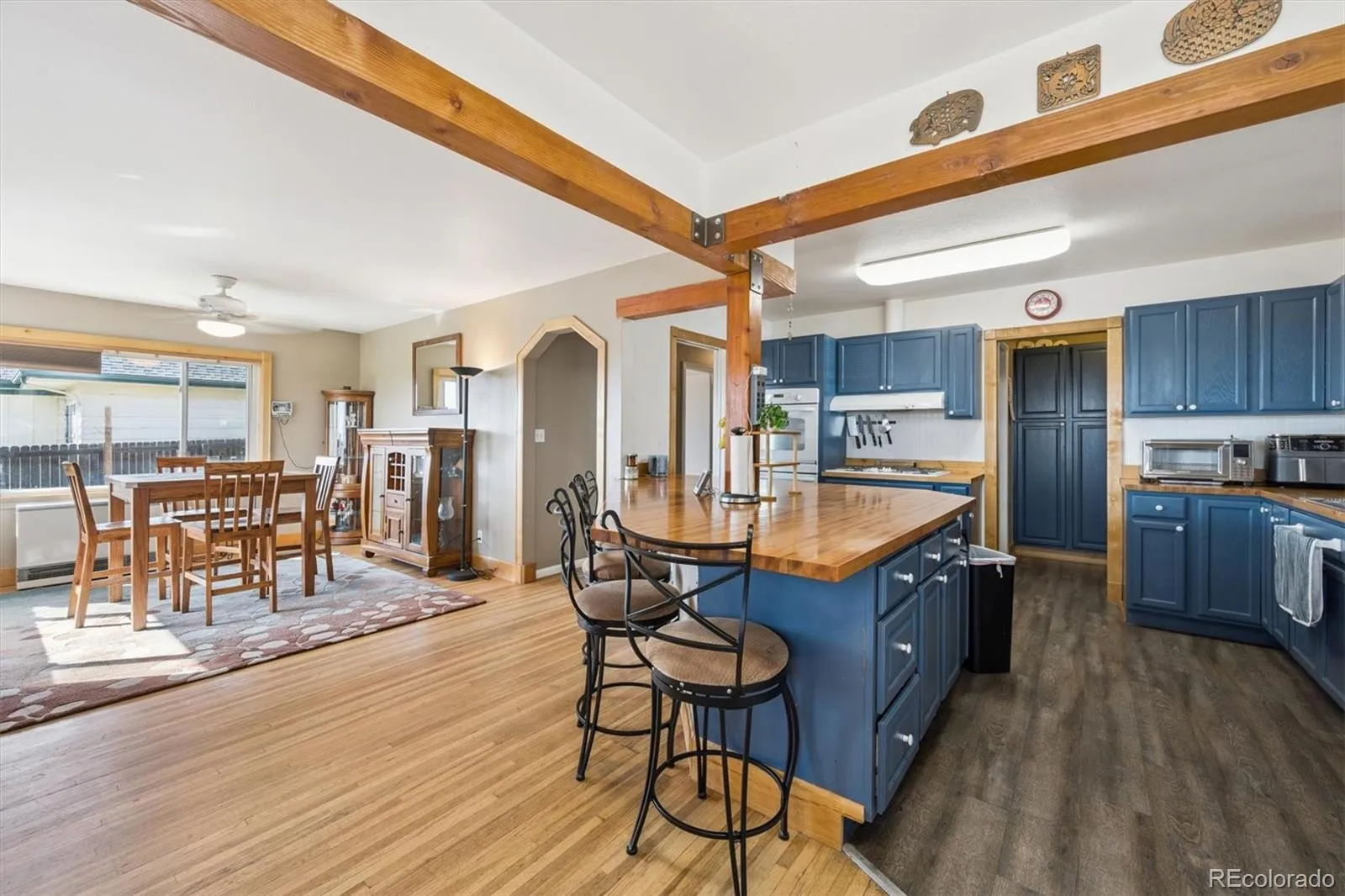 Charming 1958 Mid Century Mod inspired ranch-style home in Arvada with spectacular mountain views! CAR ENTHUSIAST DREAM! This sweet home offers timeless character & thoughtful updates. Step into a bright & sunny kitchen. Nicely updated kitchen is a true highlight—featuring a hardwood floors, wood counters, blue cabinets, and a double oven. Open to the kitchen you’ll find the spacious dining room. The massive family room offers beautiful vaulted T&G ceiling with fan & light, built-in wood shelving, and a flagstone fireplace that anchors the room w/ warmth & character. The main floor features a comfortable primary suite with a private ensuite ¾ bath and access to outside. Large walk-in closet and nicely updated. Bedroom 2 with natural light and wood floors. Bedroom 3 has the potential for adding a conforming bedroom, a great space for a home office, playroom or home gym. Main level laundry offering convenience and functionality. Wonderful bag drop off 3 car attached garage with mud room, powder bath, and lots of storage. Enjoy Colorado evenings in your fully fenced, party house! Huge back patio—complete with a built-in outdoor kitchen, hot tub, large storage shed, water feature, pergola and privacy! Massive 3-car garage and generous RV/off-street parking provide everyday convenience. Seller owns the Solar. Live close to multiple parks, shopping, dining, and outstanding JeffCo schools including Ralston Valley which is a 10 for college prep! And for a little fun, watch the teams practice as you enjoy your mountain views over the playing fields at the high school! You’re a short bike ride to Standley Lake regional park, with small beach area, camping teepees and non-motorized boating for recreation! Don’t miss this amazing home with NO HOA.