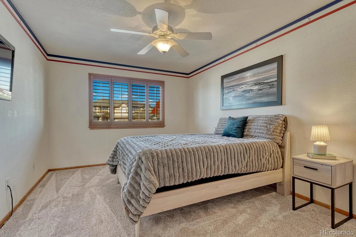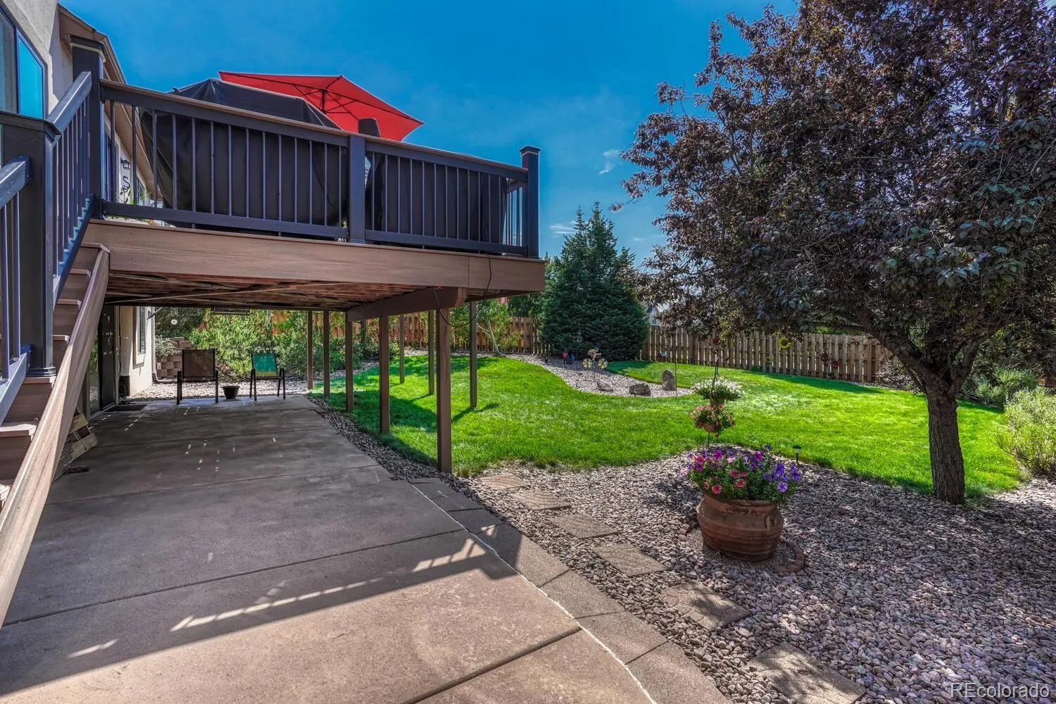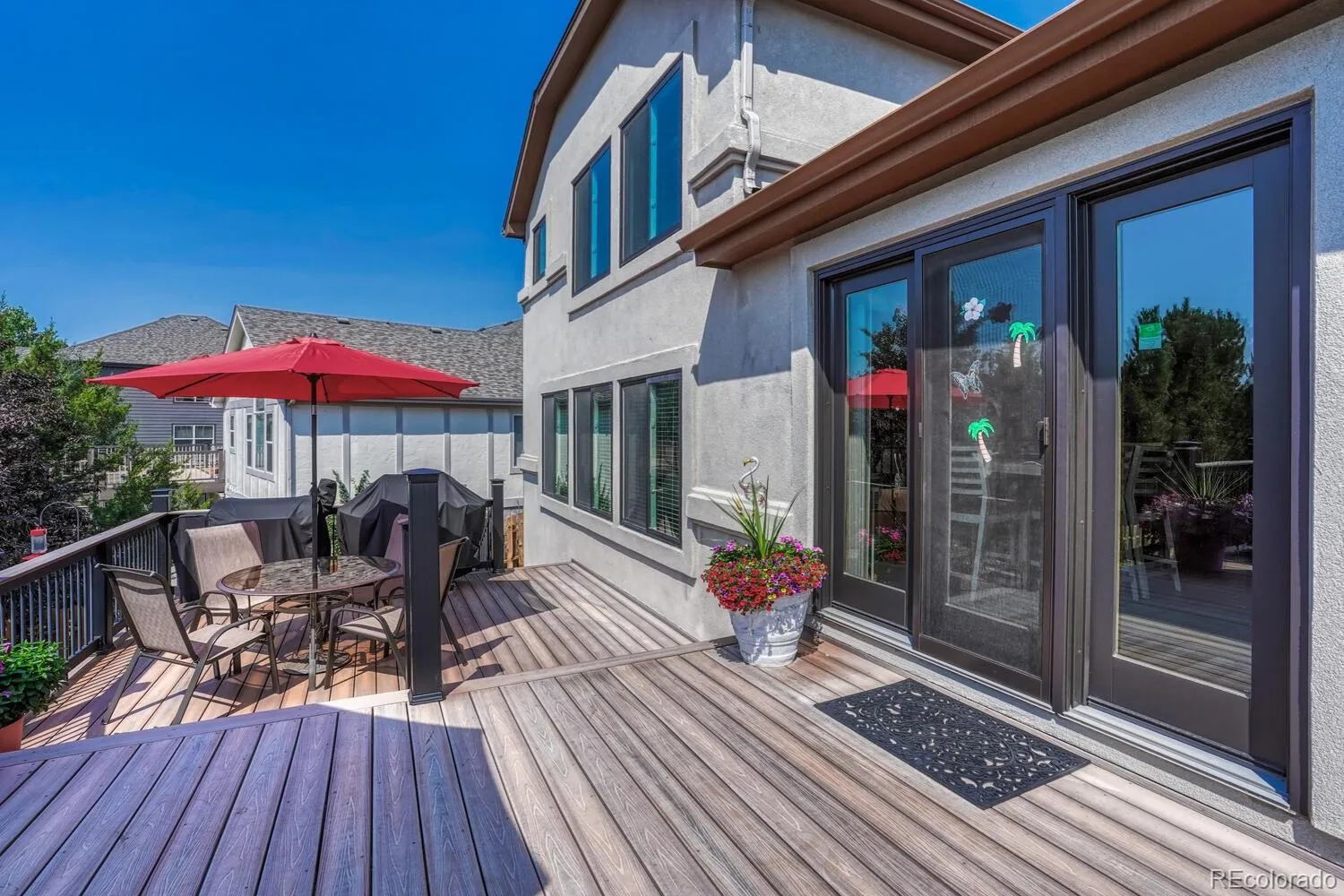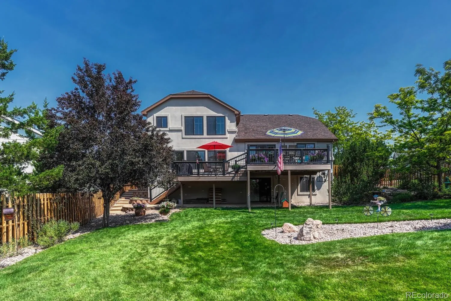 Impeccably maintained and beautifully appointed, this stunning 6-bedroom, 4-bath home offers over 4,100 square feet of elegant living space in a peaceful cul-de-sac location. Adjacent to acres of open space with scenic hiking trails, a creek, and a tranquil pond, as well as tons of restaurants and entertainment, this property perfectly balances nature and convenience. Step inside to soaring vaulted ceilings and an abundance of natural light pouring through upgraded high-end windows installed just four years ago. The open layout flows seamlessly from the formal living and dining areas into a spacious kitchen featuring granite countertops, double ovens, and extensive cabinetry—perfect for entertaining. The kitchen walks out to a sprawling custom deck overlooking pristine landscaping, mature trees, and expansive mountain views. The family room offers warmth and comfort with a cozy fireplace and tons of windows for natural light. Upstairs, the primary suite is a true retreat with breathtaking mountain views, a huge walk-in closet, and a fully remodeled spa-like bathroom showcasing granite counters, dual sinks, a soaking tub, and an oversized glass shower. Downstairs, the fully finished basement is an entertainer’s dream, complete with a 20-foot custom wet bar designed in the style of an English pub—ideal for hosting gatherings or relaxing with friends. Additional highlights include high-end plantation blinds, ample storage in the 5′ tall sealed crawlspace, a huge 3-car garage, and a lush backyard oasis that’s both inviting and low-maintenance. From top to bottom, every detail of this home reflects quality, care, and pride of ownership. Enjoy Colorado living at its finest—peaceful views, convenient to shopping and fun, outdoor adventure just steps away, and an exceptional home ready for its next chapter.