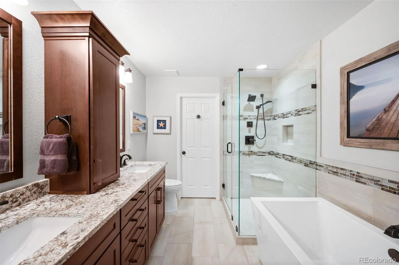 The main floor primary suite is a true retreat, complete with vaulted ceilings, private deck access, a walk-in closet, and a stunningly updated 5-piece en suite bath. The lower level boasts 9′ ceilings, walk-out capability to the patio, two additional spacious bedrooms, second full bathroom, another gas fireplace, and a versatile bonus/storage room—ideal for a gym, workshop, or additional storage.