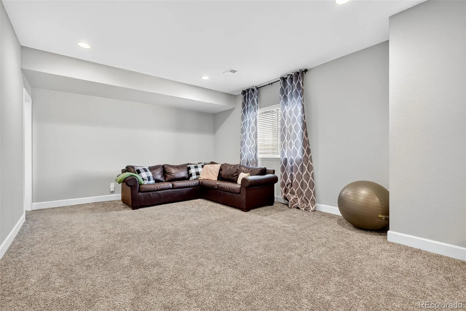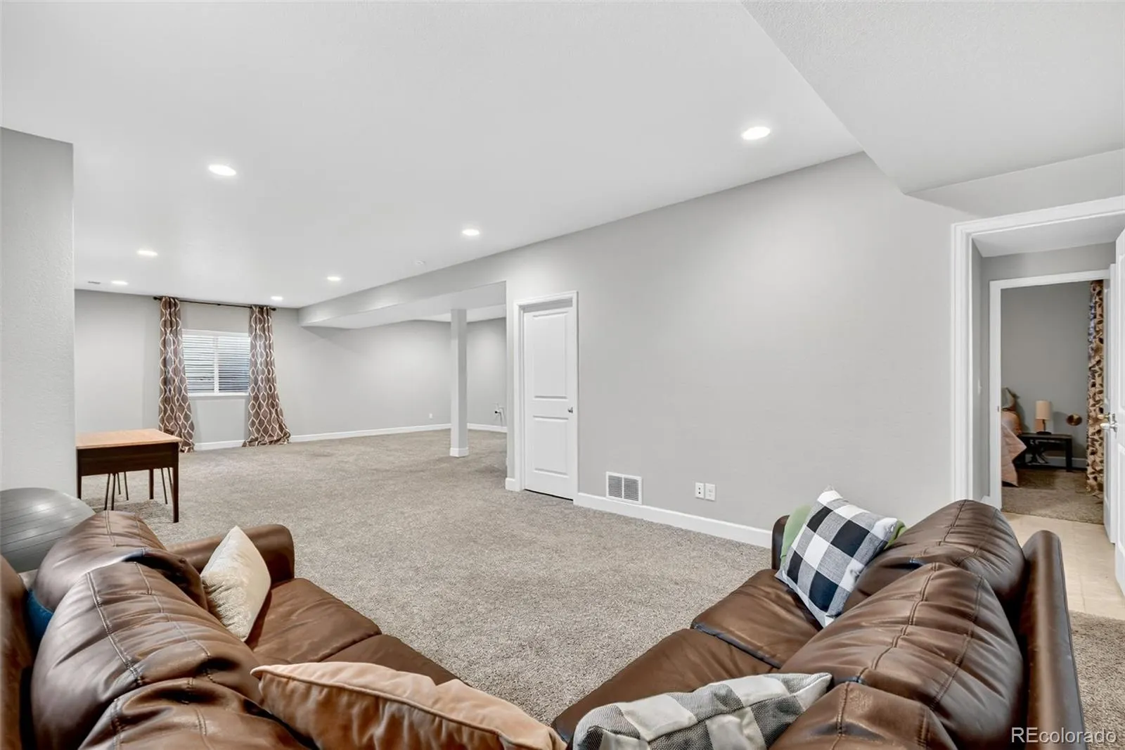 The fully finished basement adds even more living space with a large recreation room, a guest bedroom, and a beautifully appointed bathroom.—