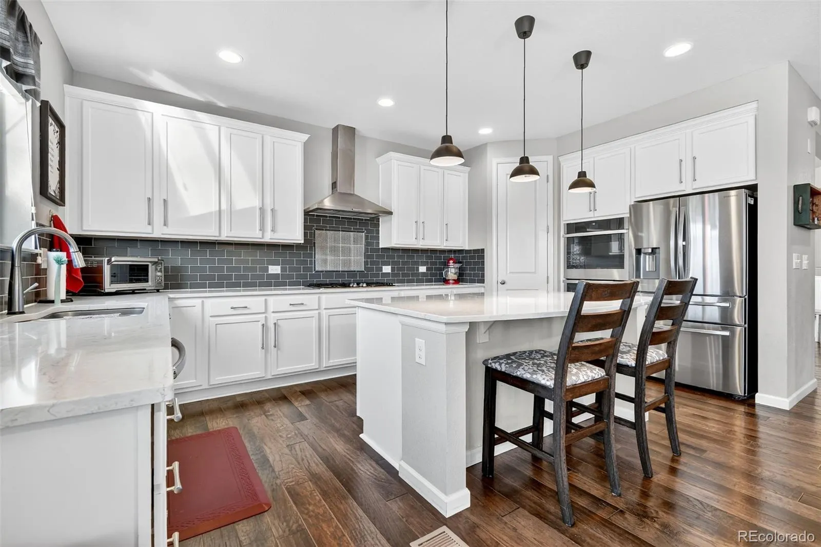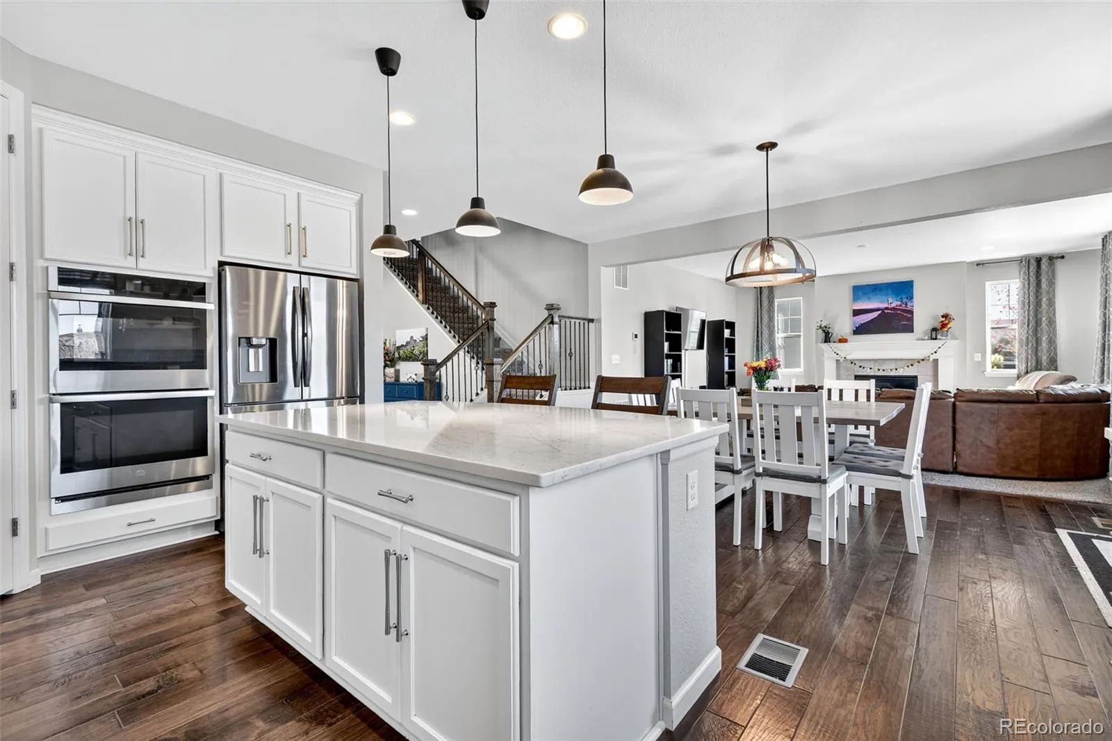 Step inside to a bright and inviting main level featuring rich wood flooring, a flexible front room ideal for a home office or formal dining, and a large living room filled with natural light. The open-concept kitchen is perfect for everyday living and entertaining with its oversized island, upgraded quartz countertops, stylish backsplash, vent hood, and double ovens.—