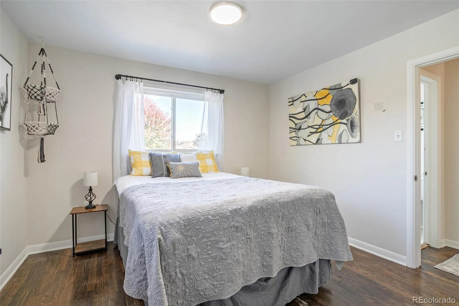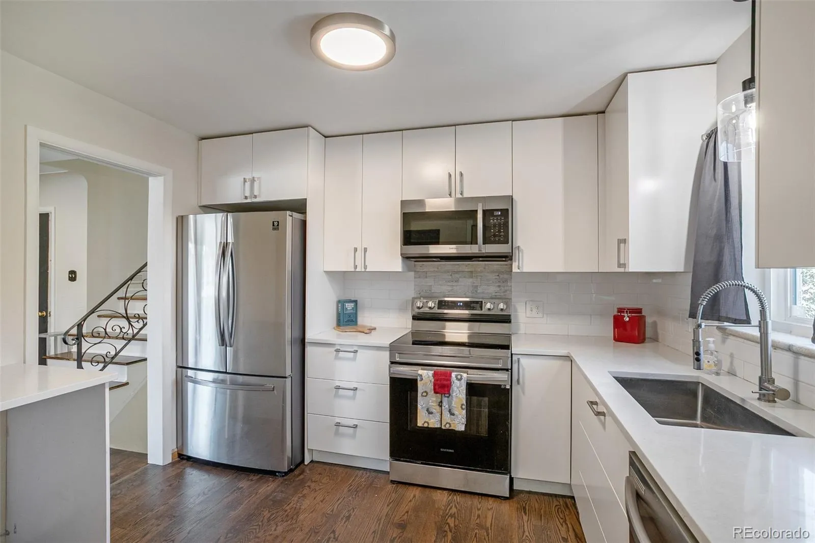 Beautifully updated home on corner lot within walking distance to Harvey Park, featuring a maintenance-free front yard, new LVP flooring, fresh paint, and stylish light fixtures throughout. The remodeled 2020 kitchen with stainless steel appliances, soft-close cabinets, and deep sink flows seamlessly into a spacious living room with original hardwood floors, accent wall, built-in bookcase, and bright eating area.