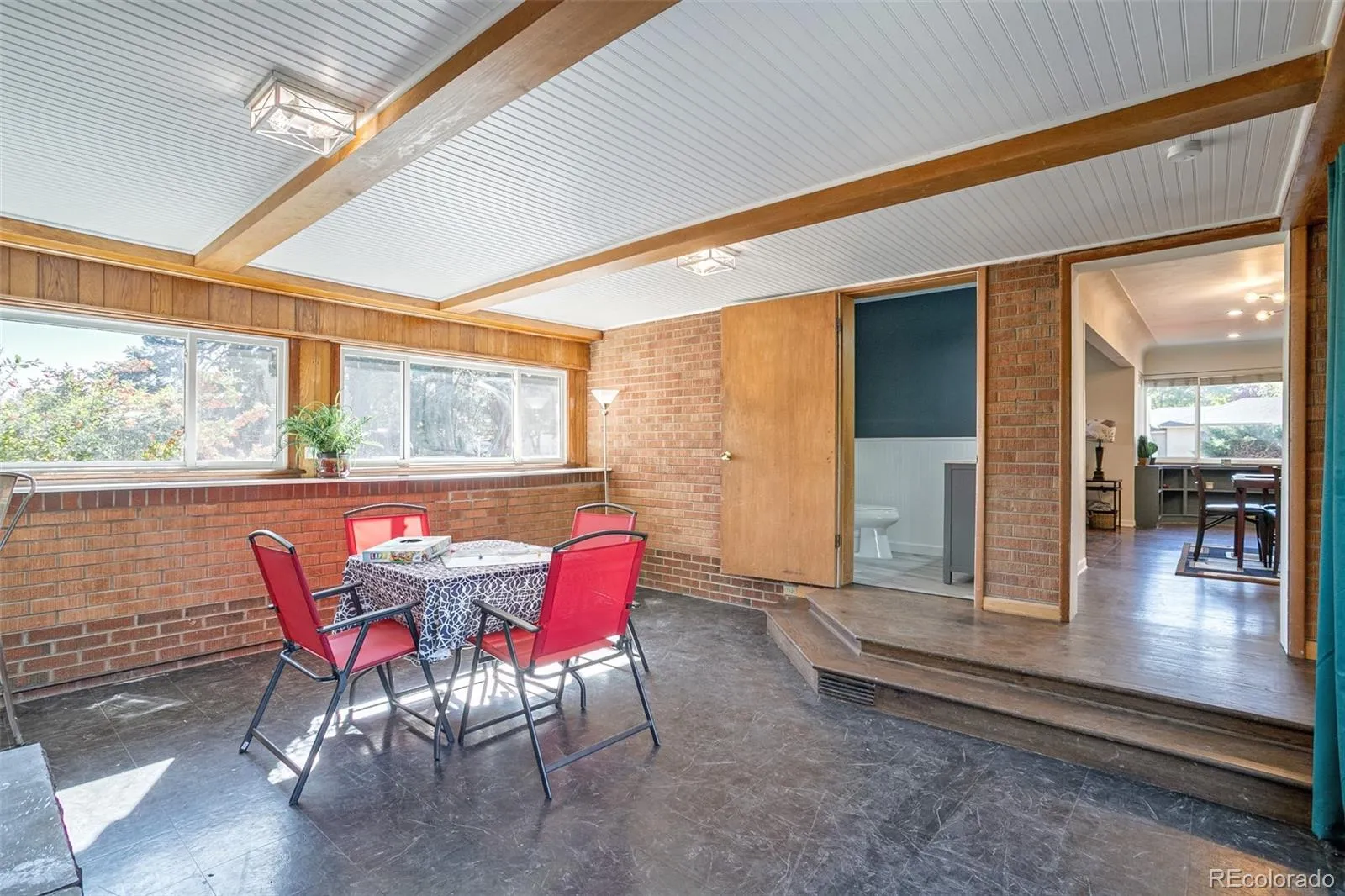 The cozy sunroom features beadboard wainscoting, wood beams, and a gas fireplace, full-wall sliding glass doors open to a patio. A refreshed 1/2 bath doubles as the upstairs laundry. Washers and dryers in both laundry rooms stay with the home.