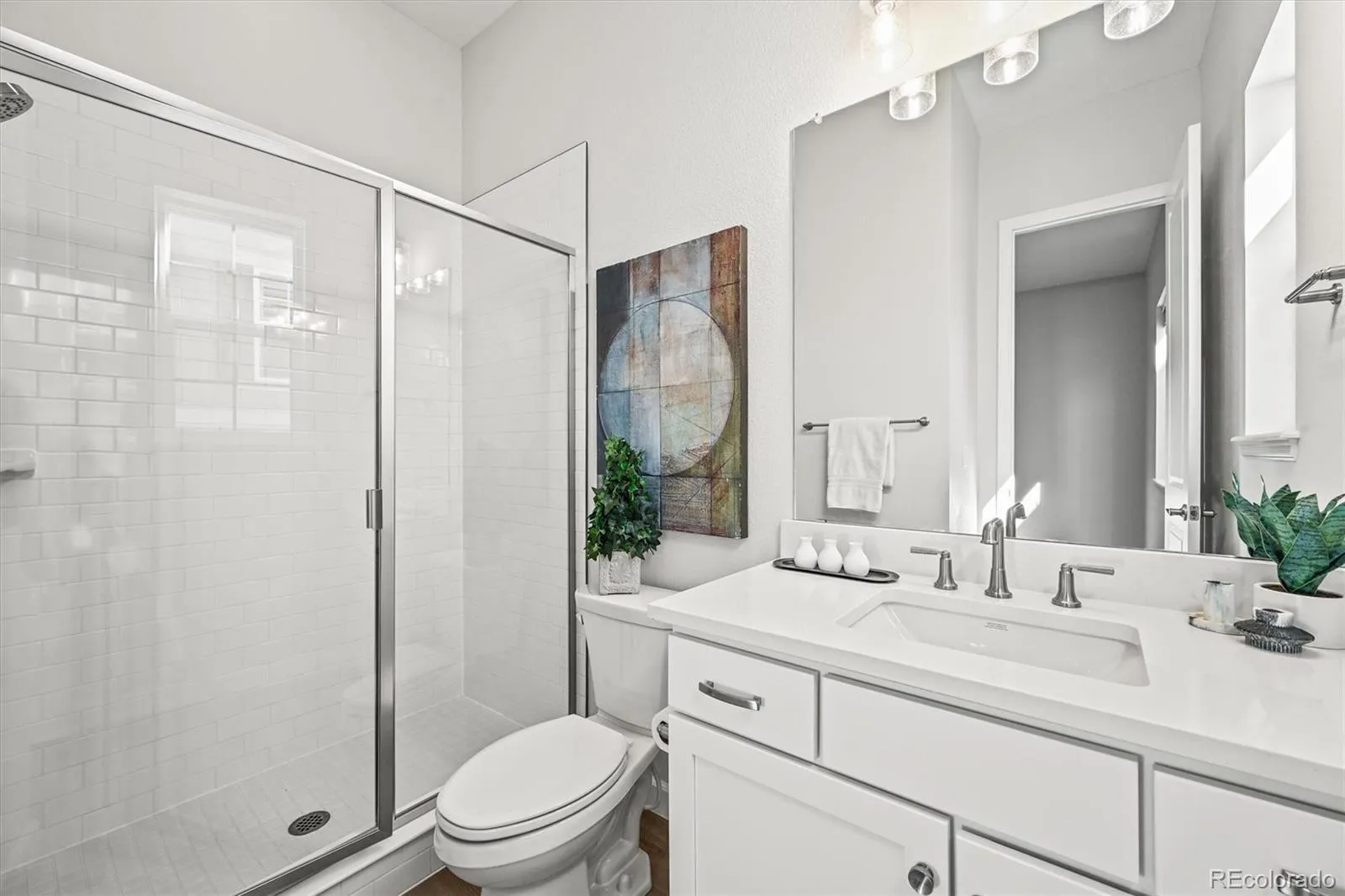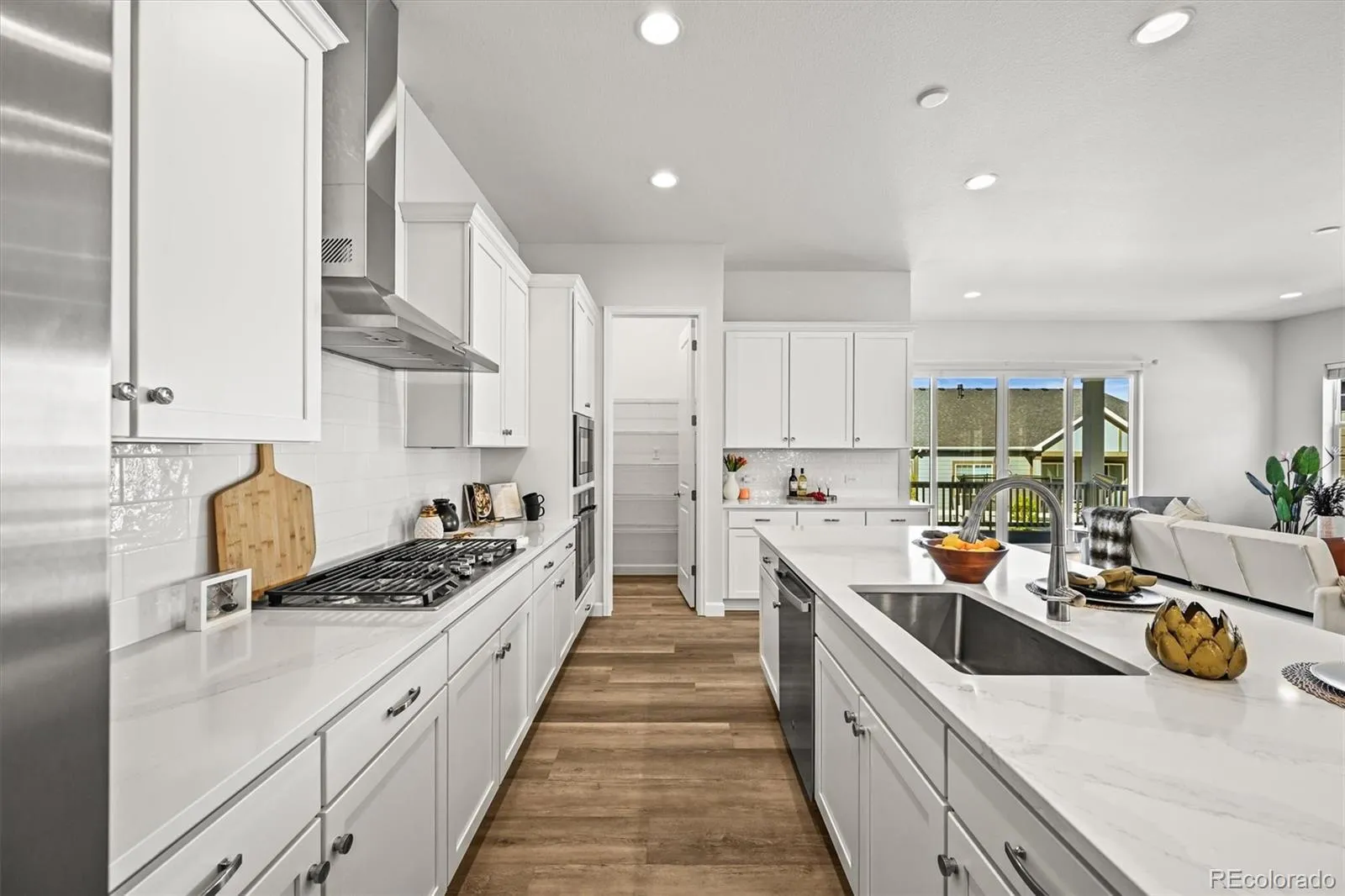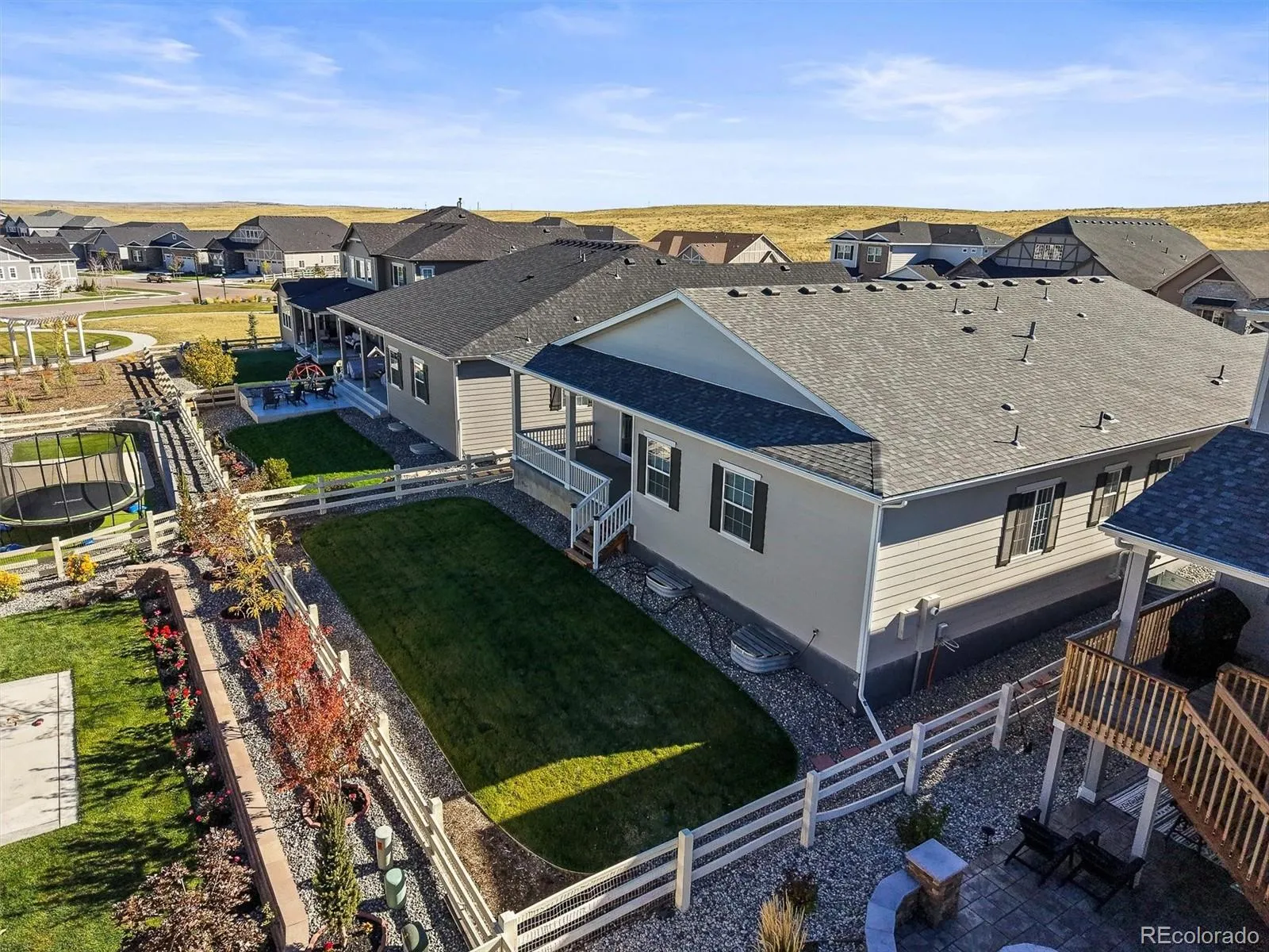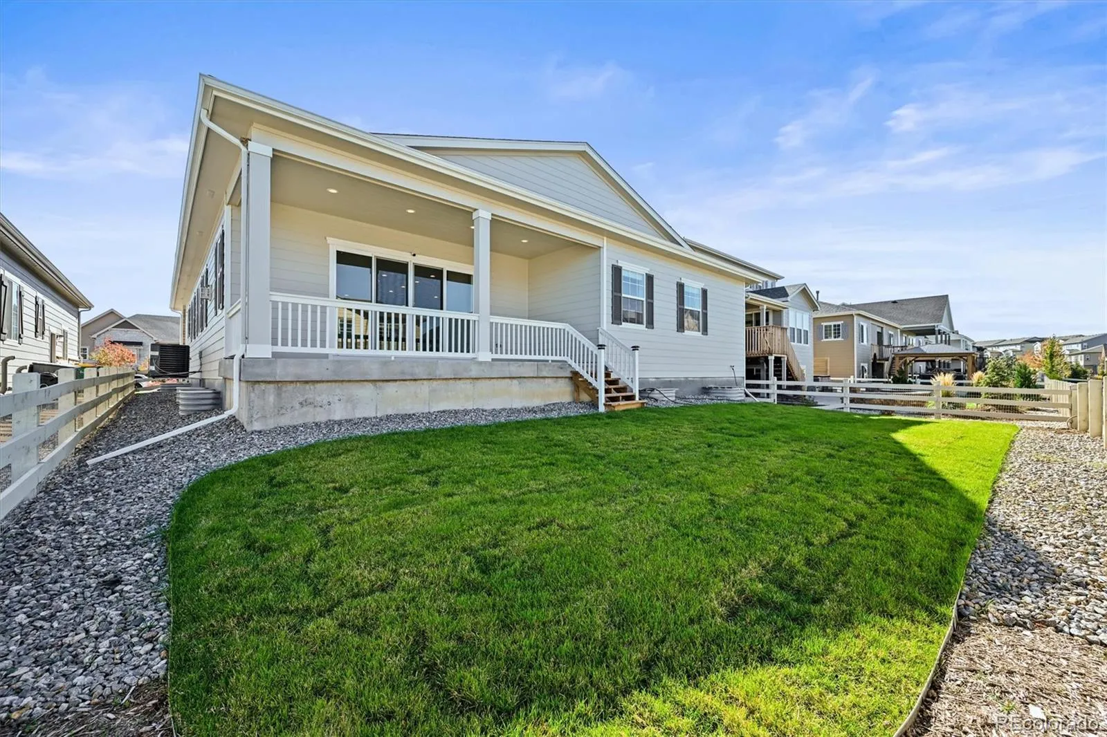 WHY WAIT FOR NEW!? Move Right Into This Like-New Ranch in Sought-After Southshore! Welcome to this meticulously maintained, move-in-ready ranch-style home! Barely lived in and thoughtfully upgraded, this stunning residence offers one-level living, high-end finishes, and exceptional attention to detail throughout. Step inside to soaring 10-foot ceilings, an abundance of natural light, and an open-concept layout designed for modern living. The heart of this home is the gourmet kitchen, featuring gorgeous white cabinetry, an expansive quartz center island, walk-in pantry, and stainless appliances including a 5-burner gas cooktop with sleek range hood. The spacious great room boasts a gas fireplace with custom tile surround and wood mantel, creating a warm and inviting space for relaxing or entertaining. Enjoy the convenience of a dedicated home office with elegant French doors, along with three bedrooms on the main level! The primary suite features a spa-like 5-piece bath, dual vanities, oversized shower, and walk-in closet, plus there is a secondary bedroom with a private bath—ideal for guests or teens, and a 3rd bedroom with nearby access to a full hall bath. The professionally finished basement offers flexible living space with its spacious family/rec room with wet bar, a 3/4 bath, and a bonus room with closet—perfect as a 5th bedroom, exercise area, or hobby room! Outdoor living is just as impressive with a large covered patio, fully fenced low-maintenance backyard, and new sprinkler system—perfect for entertaining or unwinding. Tucked away at the edge of the neighborhood for added privacy, yet just minutes to Aurora Reservoir for water sports and miles of scenic trails. Full access to Southshore’s award-winning clubhouse, pools, fitness center & more. This is luxury, location, and lifestyle—all in one exceptional home. Don’t let this one get away!