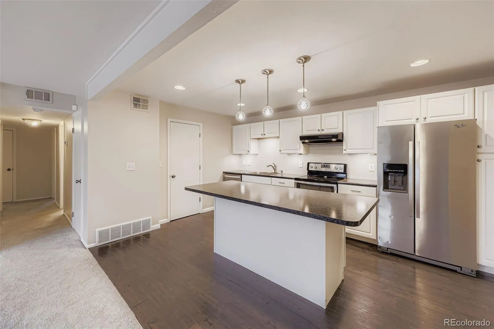 The kitchen features white cabinetry, stainless steel Whirlpool appliances, a huge island with extra storage, and a large closet that can easily serve as a pantry. A new sliding door opens to a brand-new balcony, perfect for sunsets and fresh air.