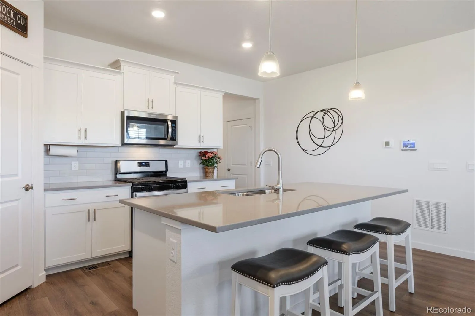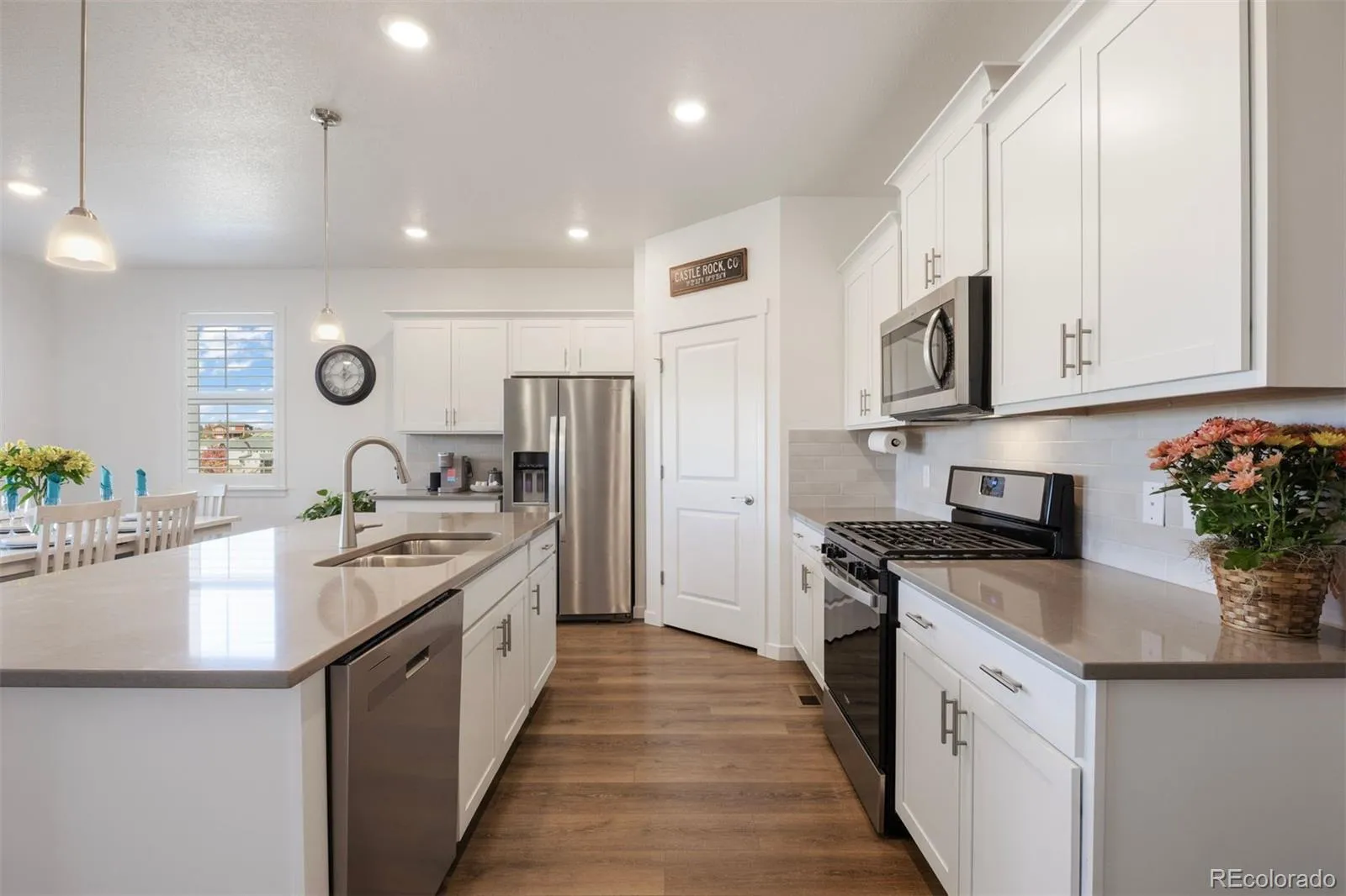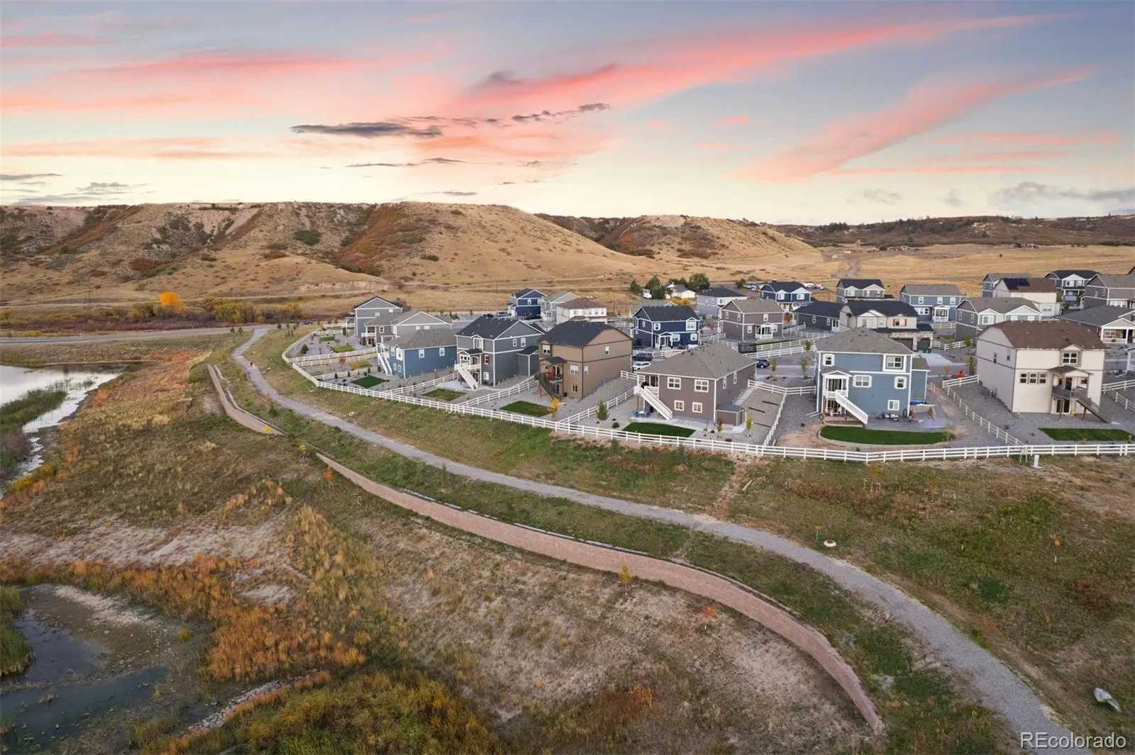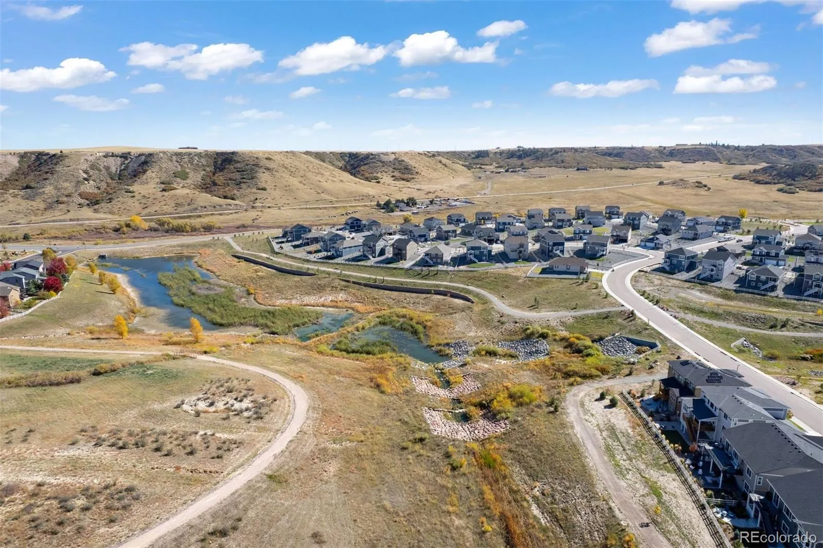 Set on a spacious lot backing to open space, this five-bedroom ranch home captures the beauty of Colorado living. Natural light and open views define the interior, where a bright white kitchen, main-floor primary suite, and finished walk-out basement offer modern comfort. From morning coffee on the deck to afternoons at the Recreation Center—complete with a pool, fitness center, and park—this Crystal Valley home connects every moment to the landscape that surrounds it. As you arrive, views of the open space immediately capture your attention, framing a charming front porch that sets the tone for what’s inside. Step through the front door to a bright hallway that flows into the kitchen and living room. The kitchen shines with white cabinetry, a large quartz island with breakfast bar seating, Whirlpool appliances, a stainless steel undermount sink, pantry, and a perfect nook for a coffee bar. The dining area comfortably seats 4-6 and opens through sliding doors to the walk-out deck, where meadows and rolling hills stretch into the distance. The family room feels warm and inviting, centered around a SimpliFire remote-controlled gas fireplace with tile surround, while plantation shutters throughout the home add style, privacy, and light control. The main-floor primary suite offers both brightness and calm, with open-space views and an ensuite featuring dual sinks, a walk-in shower, private water closet, and walk-in closet. Three additional bedrooms share a full bath, while the laundry room connects conveniently to the two-car garage. The newly finished walk-out basement adds an extra bedroom, full bath, and a spacious recreation room ready for entertaining or relaxation—complete with more natural light and scenic views. Outside, a storage shed and low-maintenance yard with a small grassy patch make upkeep simple. Overlooking meadows, hills, and a pond that attracts local wildlife, this home captures the very best of peaceful Colorado living. OPEN HOUSE SAT 10/18 1–3pm