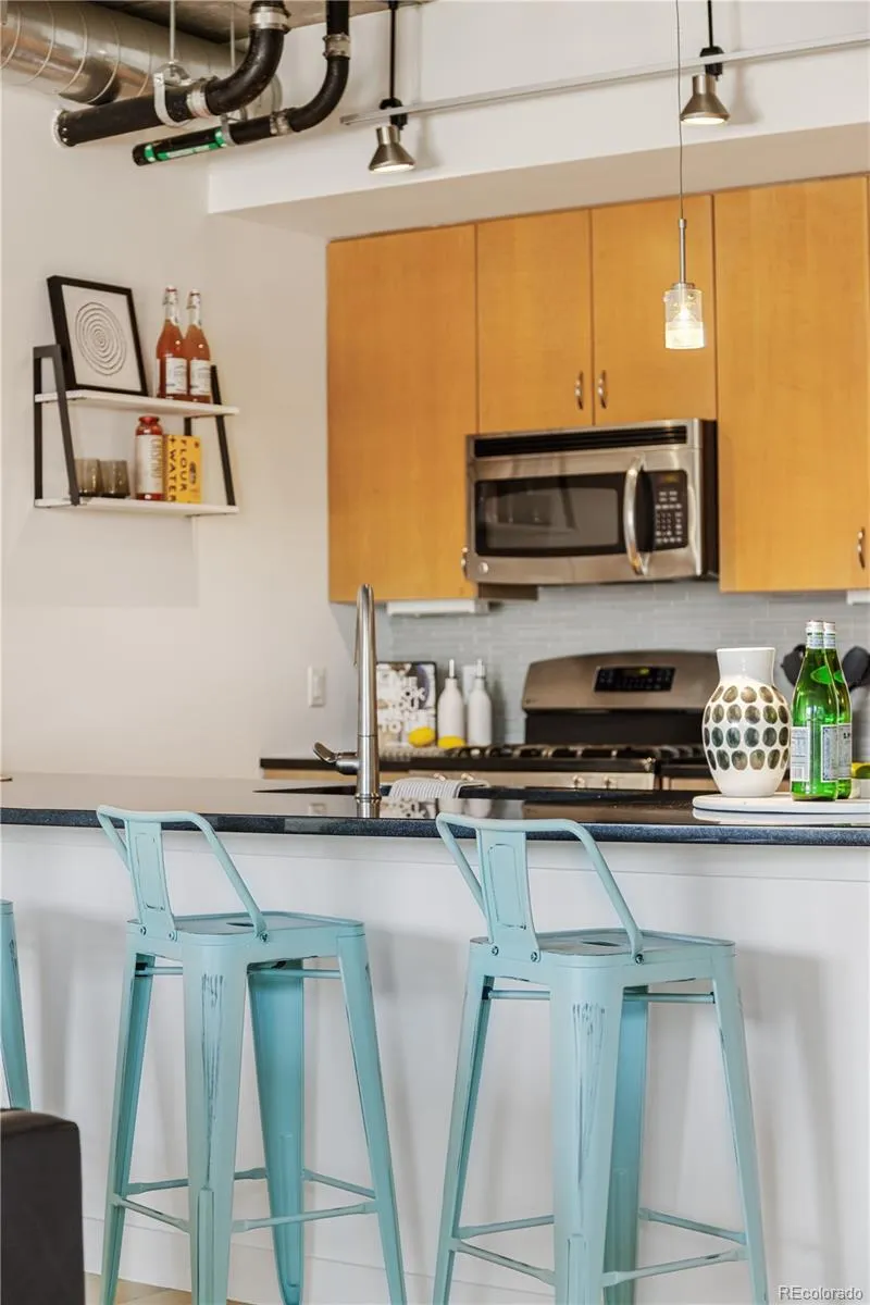 Experience the best of downtown Denver living in this beautifully refreshed one bedroom one bath loft in Zi Lofts, perfectly positioned on the fifth floor overlooking the historic Breckenridge Brewery building, now home to the Cherry Cricket. This residence blends modern finishes with classic urban character, featuring an open concept layout filled with natural light and freshly painted interiors that create an inviting, move-in-ready atmosphere. The kitchen is designed for both entertaining and everyday living with granite countertops, a large island, and stainless steel appliances including a refrigerator, oven, microwave, dishwasher, and disposal. The spacious living area opens to a private balcony with protected views of the Ballpark district, offering the perfect spot to relax or enjoy the city lights. The primary suite includes a generous walk-in closet and a full bath with modern fixtures and clean finishes. Convenience abounds with a same-floor dedicated storage space and an oversized parking spot located right next to the elevator for effortless access. All furniture is negotiable, giving buyers an easy turnkey opportunity. A recently installed Butterfly security and video access system enhances privacy and provides secure, modern entry to the building. This 848 square foot loft combines comfort, style, and an unbeatable location surrounded by Coors Field, Union Station, Riverfront Park, RiNo, Ball Arena, and some of Denver’s best restaurants, coffee shops, and boutiques. Zi Lofts remains one of the city’s most desirable boutique buildings, offering a rare blend of quiet sophistication and proximity to everything that makes downtown Denver vibrant.