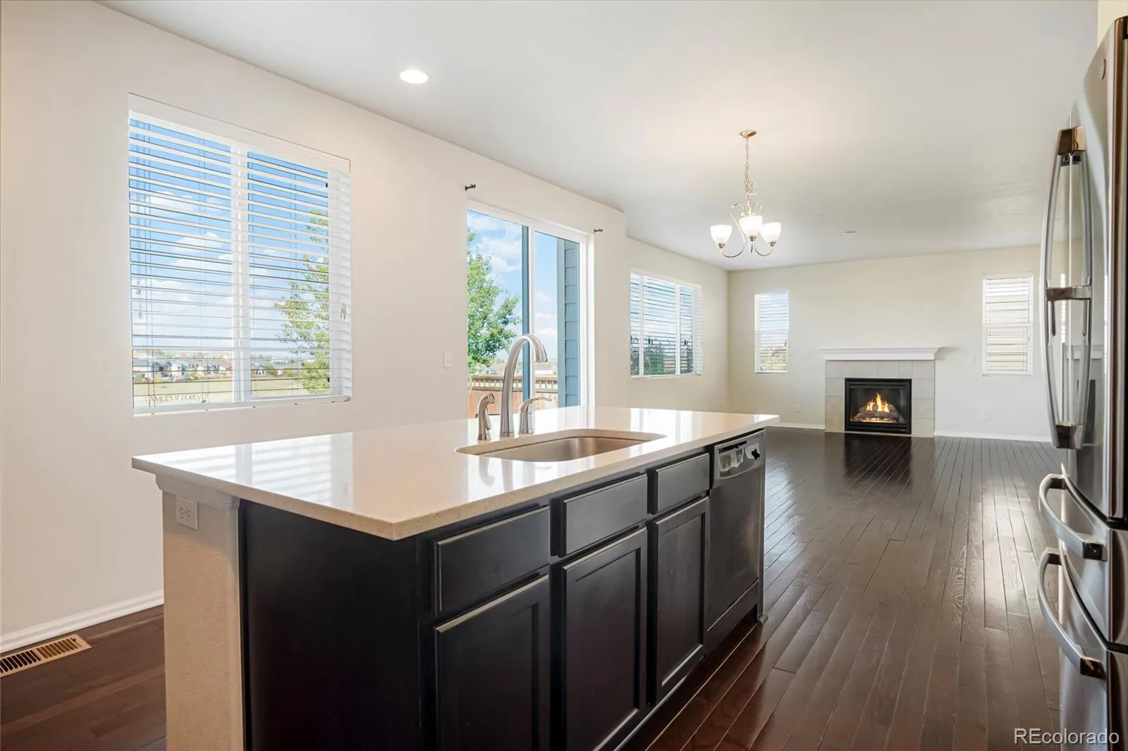 The gourmet kitchen features quartz countertops, GE appliances, double ovens, a five-burner gas cooktop, and a large island that flows into the living room with a cozy fireplace—ideal for entertaining or relaxing.