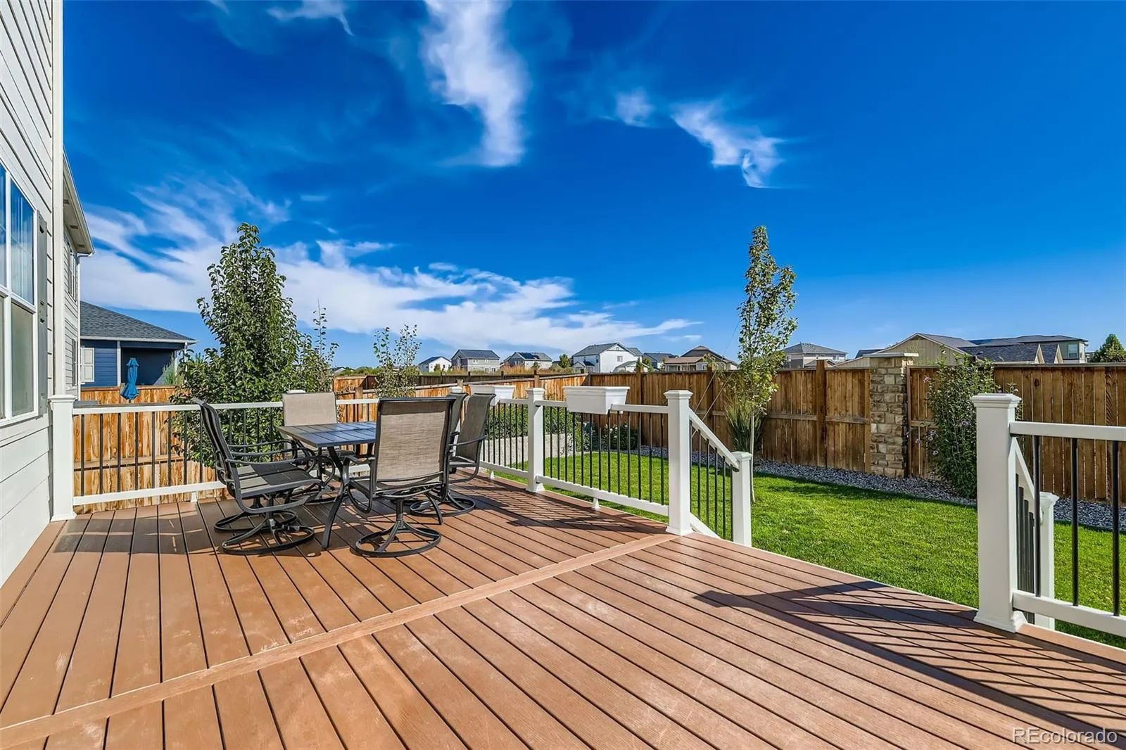 Welcome to this spacious and upgraded Holcombe model in the Lakeside Canyon community, a rare resale opportunity that offers better value than new construction. Set on a 6,325 sq ft lot, this 2,465 sq ft two-story home includes 4 bedrooms, 3 bathrooms, a dedicated main-level study, and a 3-car garage. Unlike new builds, this home already features a custom-built deck, saving thousands in post-close upgrades. Inside, the main floor showcases an open-concept layout with a great room and fireplace, bright dining nook, and a kitchen outfitted with quartz counters, a large island, stainless appliances, classic cabinetry with crown molding, and a walk-in pantry. Upstairs, you’ll find all four bedrooms, including a spacious primary suite with a walk-in closet and full bathroom. Two of the additional bedrooms also feature walk-in closets. A large laundry room completes the upper level. Smart home features include a video doorbell, smart locks, thermostat, lighting, and garage openers. Additional highlights include a tankless water heater, central A/C, radon mitigation system, double-pane windows, laminate wood flooring, and a professionally landscapeding. Located in the highly regarded St. Vrain Valley School District and easy access to I-25, this home combines comfort, space, and long-term value in a growing community. Don’t miss your chance to move into a like-new home without the wait or the extra costs.