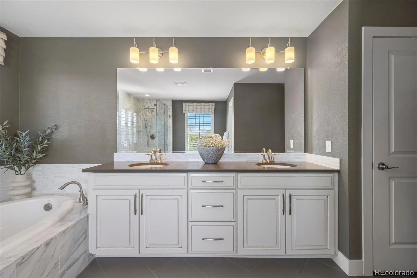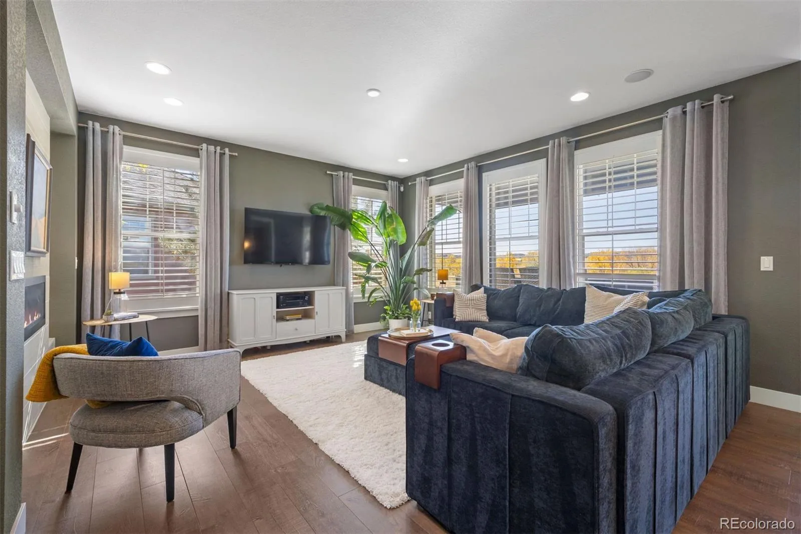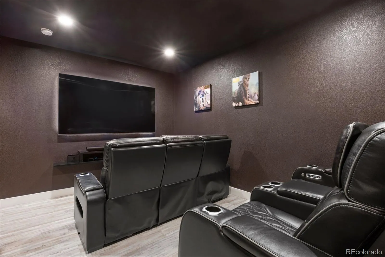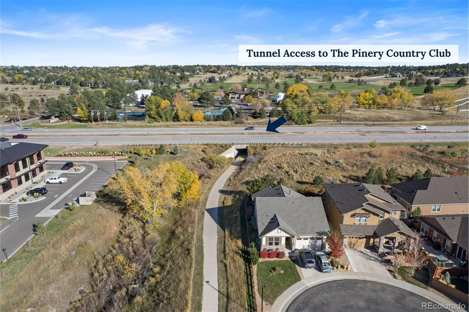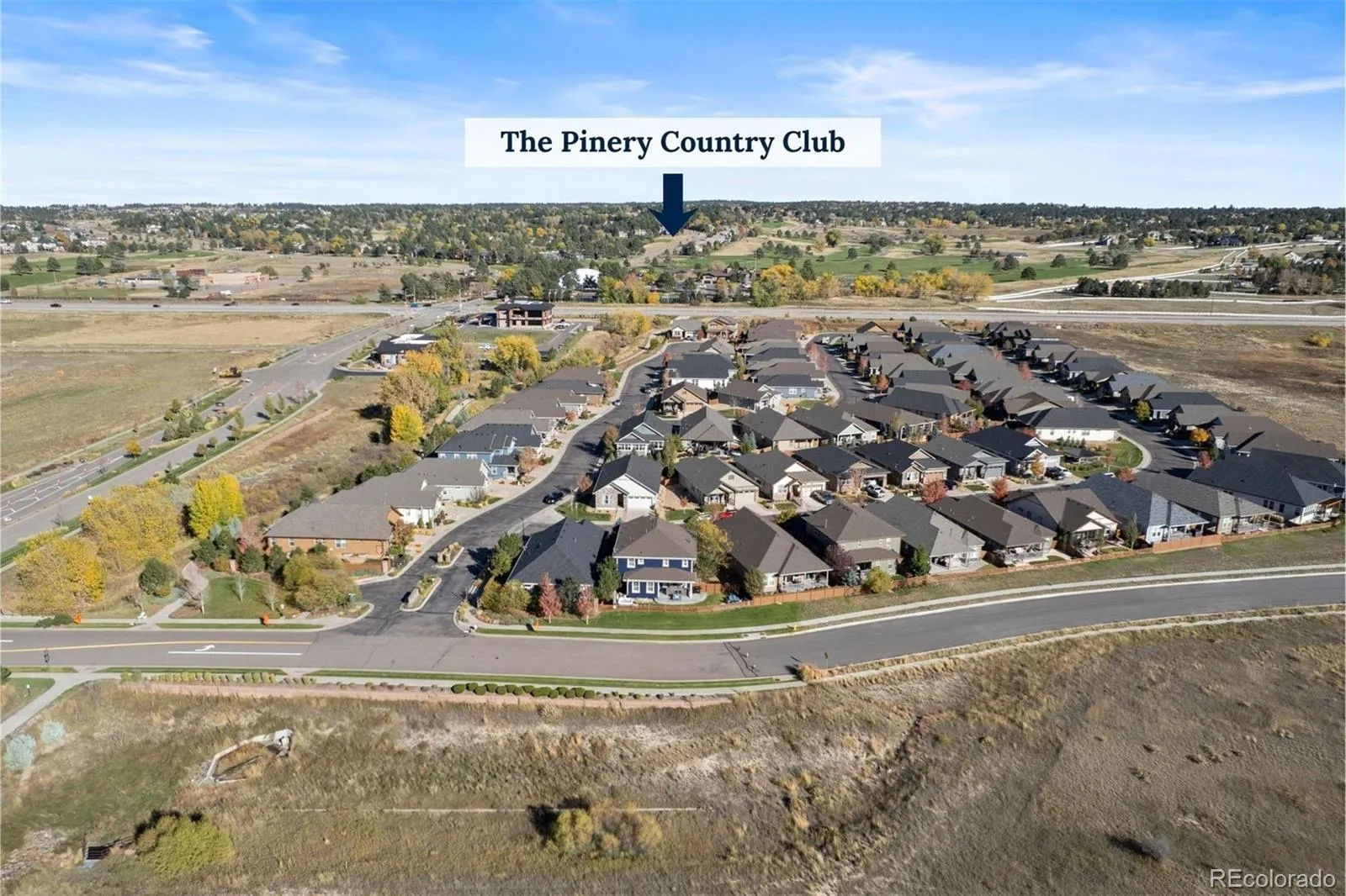 Wake up to mountain views and the serenity of open space just beyond your backyard in this stunning former model home located in Pinery West! This home blends luxury and livability, featuring a chef-inspired kitchen, dedicated office, theater room, 3-car garage, and unforgettable Colorado sunsets. The kitchen showcases upgraded cabinetry, quartz countertops, double ovens, gas cooktop, wine fridge, a large center island, and a walk-in pantry. It opens to the inviting living room with a dual-sided fireplace that extends into the show-stopping dining room anchored by a beautiful crystal chandelier. Upstairs, the spacious primary suite offers dual walk-in closets and a luxurious 5-piece spa-inspired bathroom. Two additional bedrooms, a loft, and the laundry room complete the upper level. Throughout the home, you’ll find built-in speakers, upgraded finishes, and a dual-zone HVAC system for year-round comfort. The finished basement is designed for entertainment and includes a theater room, home gym, full bathroom, and a large game area with custom bar. The insulated, heated 3-car tandem garage offers a hot and cold interior faucet and abundant storage. Outdoors, relax or entertain on the covered patio and enjoy the hot tub overlooking mature trees along the Cherry Creek Trail. Golf cart access connects directly to The Pinery Country Club just minutes from door to door. This exceptional home offers the very best in comfort, design, and lifestyle.