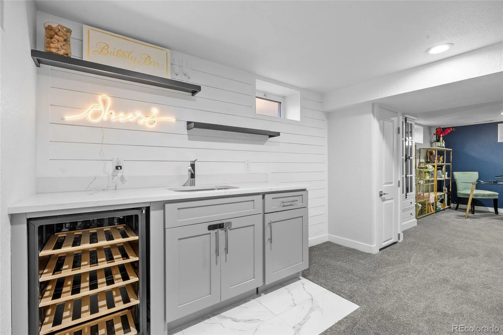 The finished basement offers two additional bedrooms, a full bathroom, and a comfortable living area. It also features a fully equipped wet bar with a built-in bar fridge.