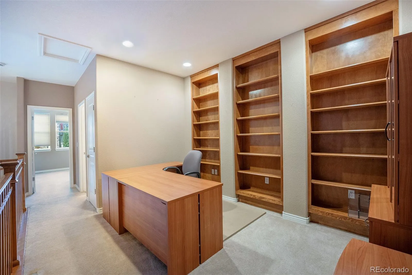 Upstairs includes a spacious secondary bedroom, full bath, and a versatile loft with built-ins for the home office plus additional living space. A spacious attached two-car garage plus unassigned guest parking nearby adds everyday convenience.