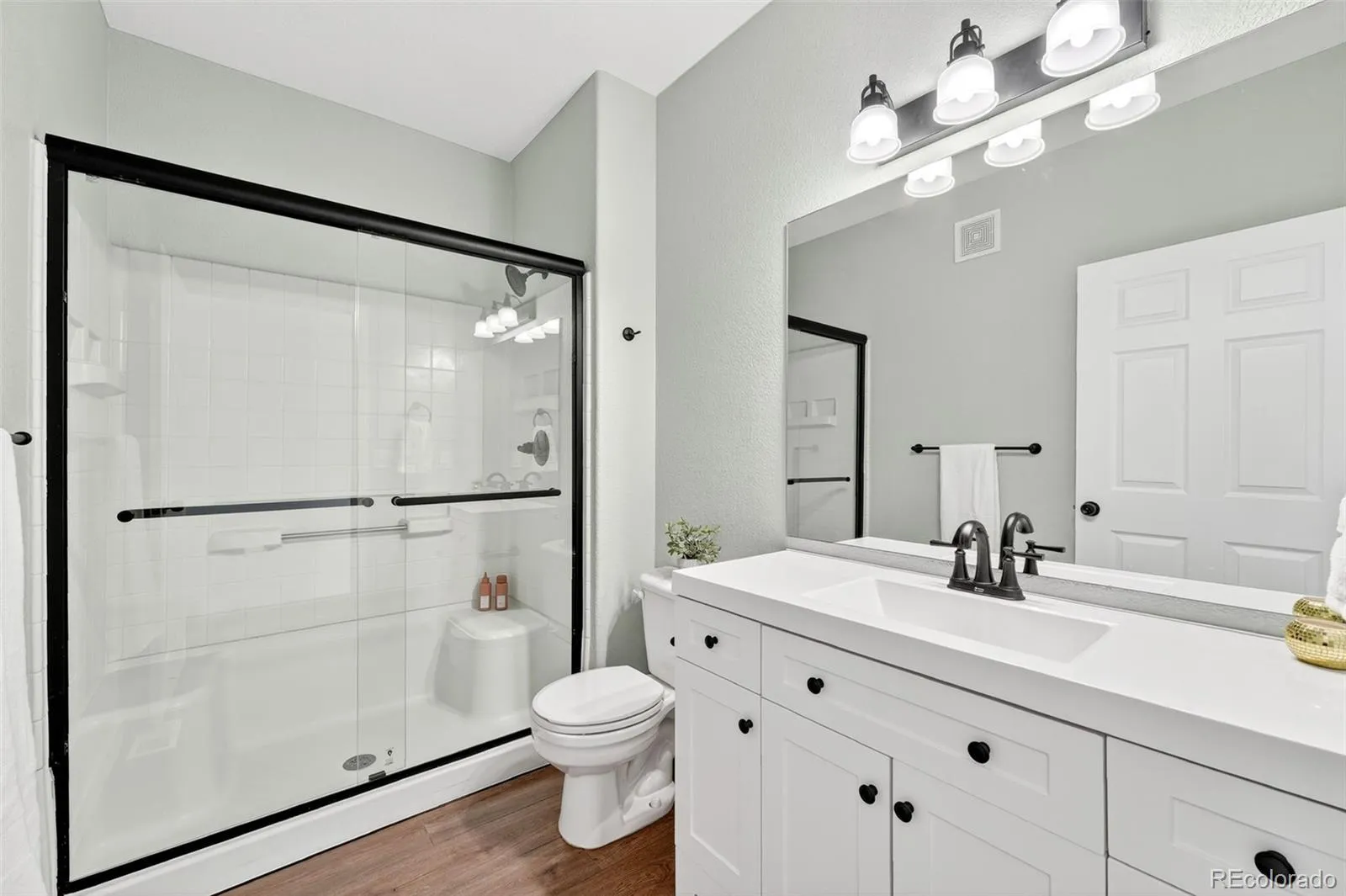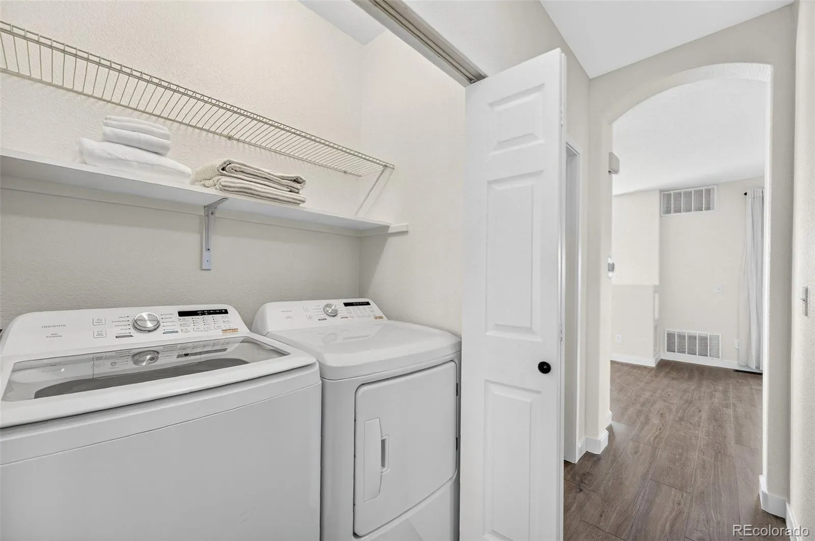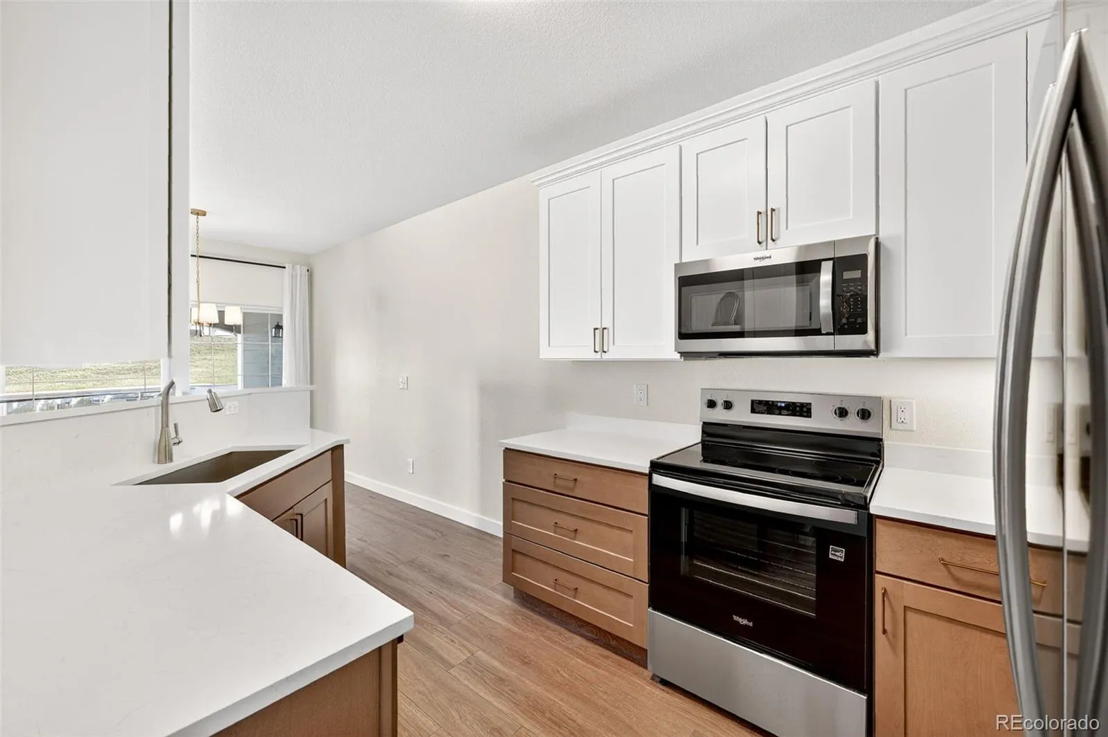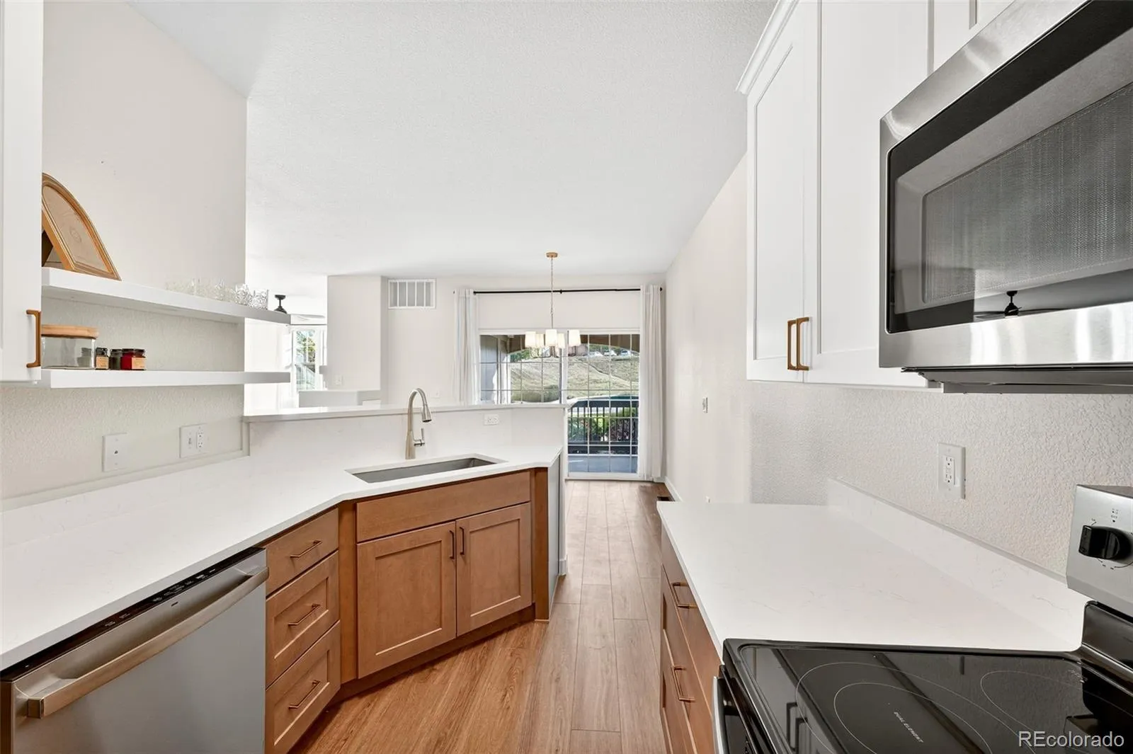 This is the one you’ve been waiting for! Fully renovated, sunny South-facing unit in coveted Fox Creek Condos. Open floor plan with generous living room, dining room & open kitchen – great for every day living & joyous gatherings. Cozy up to the gas fireplace – surrounded by built-ins, or enjoy an evening cooking for family and friends in the gourmet kitchen. High-end cabinets maximize storage space (including pantry), and there is ample prep space on the beautiful quartz counter tops. Luxurious single basin sink and open shelves add style and functionality. HW floors (luxury vinyl plank) throughout common spaces, and brand new carpet in both bedrooms. Spacious primary suite with walk-in closet, and large bathroom with double vanity. Second bedroom also generously sized. Hard to find, in-unit washer & dryer- as well as huge storage closet outfitted to be a work-from-home-space that’s easy to close-up and have ‘disappear’. As lovely as it is versatile, this unit lives larger than the sqft would suggest. Private patio, oversized 1 car garage (that fits most pick-up trucks) and 1 additional off-street parking space. Right on the Niver Open space connecting you to miles of trails. Walk to coffee shops, parks & restaurants. Easy HWY access connects you to the rest of the Metro! Truly a gem – this is one you won’t want to miss!