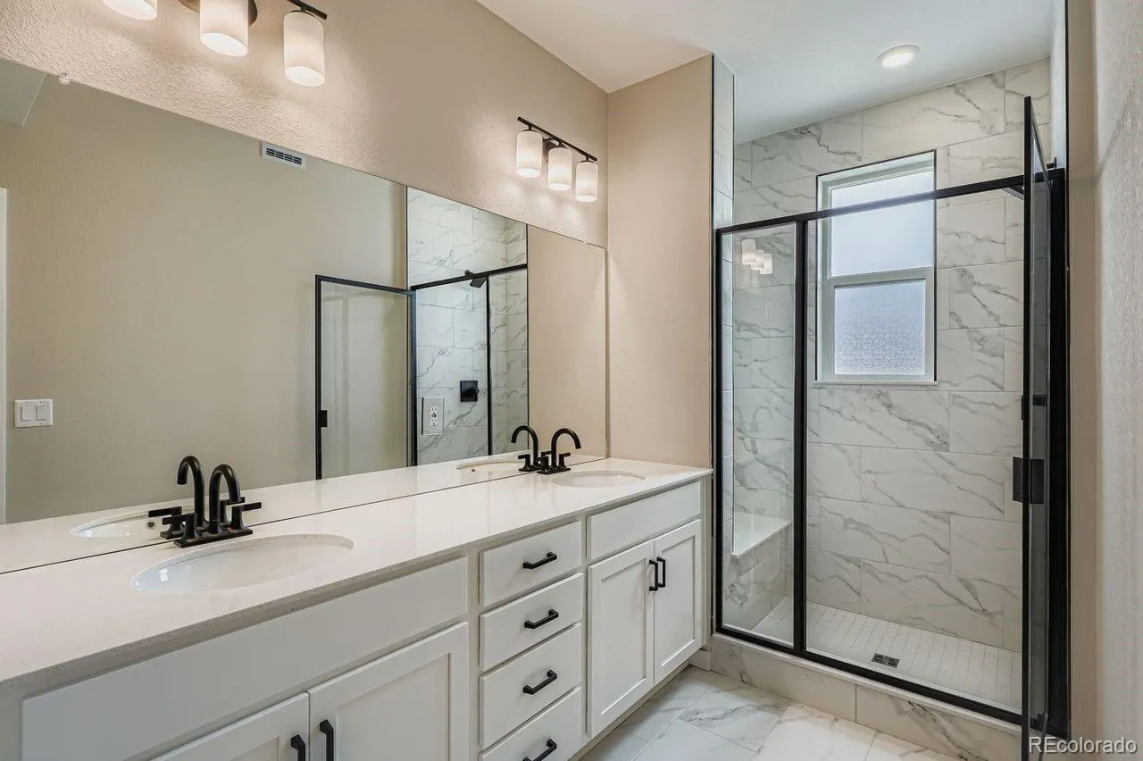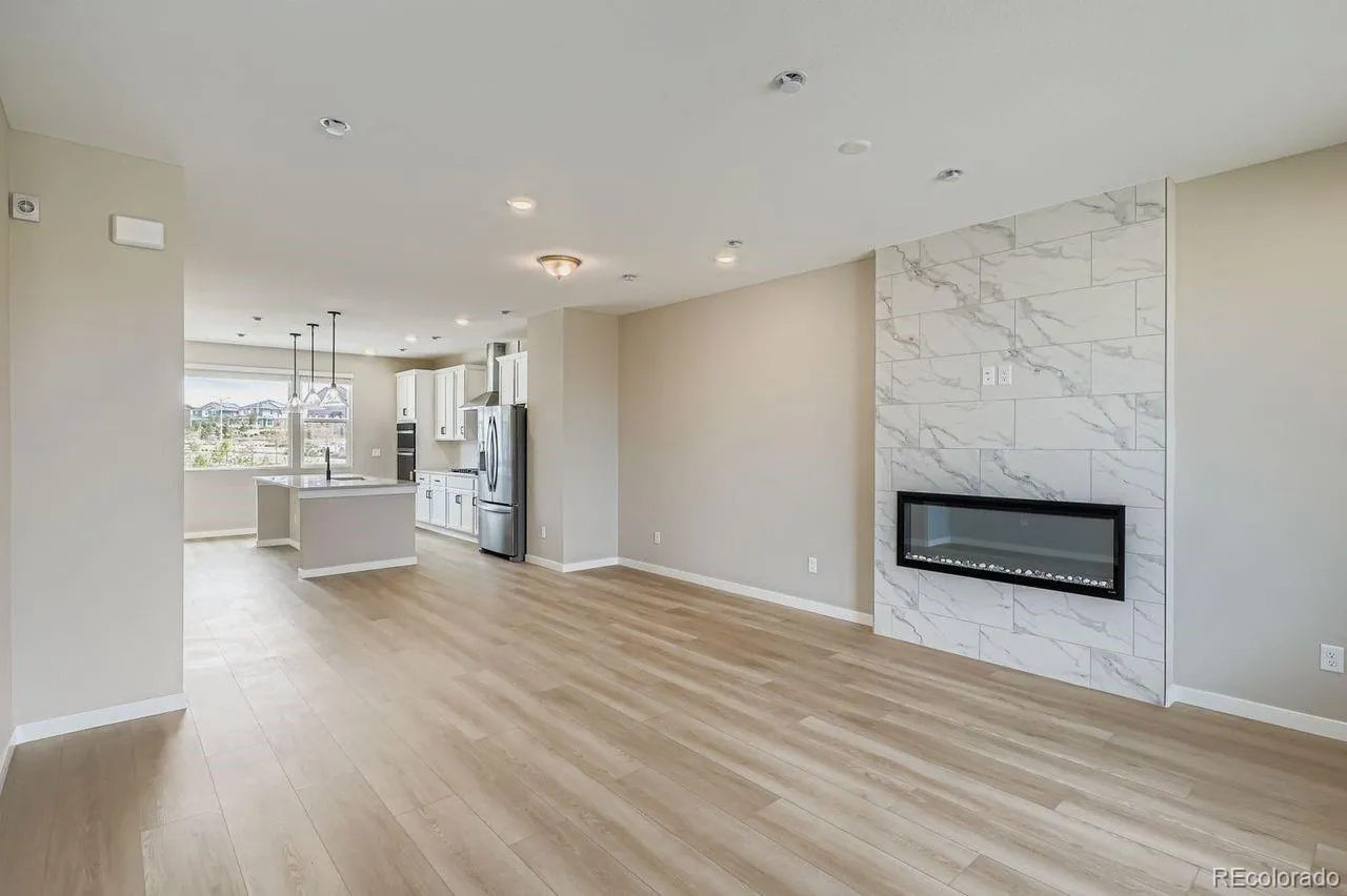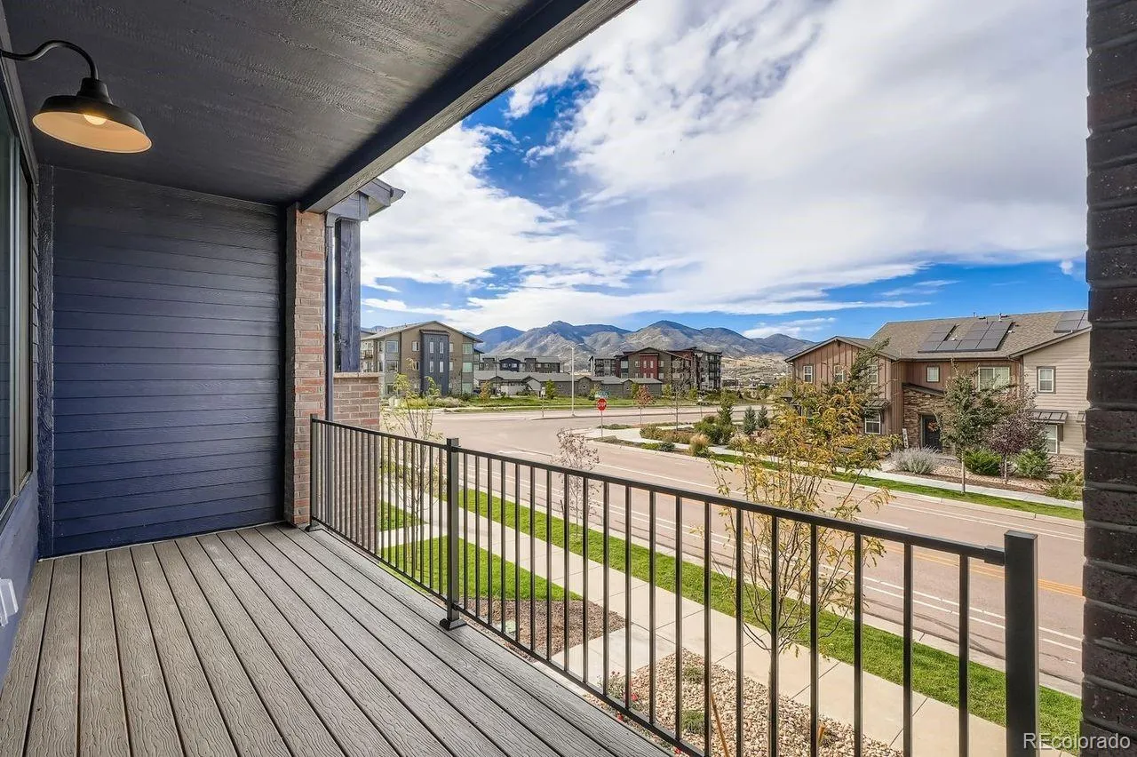 MOVE IN READY NOW!!! BEST VIEWS IN THE ENTIRE NEIGHBORHOOD!! Stunning 3-story townhome with ROOFTOP DECK in Prospect Village at Sterling Ranch offers luxurious living with spectacular mountain views! Enjoy the expansive great room with contemporary electric fireplace and soaring 9’ ceilings on both the main and upper levels creating a bright and airy living space. The stylish luxury kitchen features 42″ white cabinets, quartz countertops, tile backsplash, and premium stainless Whirlpool® appliances including 36″ gas cooktop, hood, and built-in microwave/oven. Relax in the luxurious owner’s suite featuring an oversized walk-in shower with a bench and a spacious walk-in closet with access to the upper level laundry room. Separate bedroom and full bath on the entry level provide privacy and flexibility for guests or a home office. High-quality finishes and attention to detail are evident throughout the home offering both elegance and functionality. Sterling Ranch offers a wealth of amenities, including parks, Pickleball, walking trails, a clubhouse with wine bar and brewery, and a state-of-the-art fitness center to enhance your lifestyle. This exceptional townhome is perfect for those who appreciate modern design, high-end finishes, and breathtaking mountain views. Schedule your showing today and experience unparalleled Colorado living!