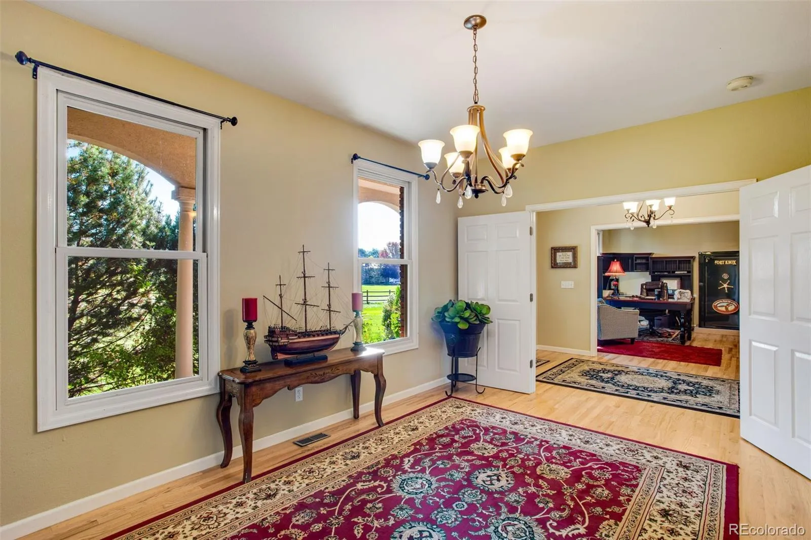 Welcome to your dream equestrian retreat-just 4 miles east of I-25, yet a world away in peace and possibility. Set on 7.32 irrigated acres with sweeping views of the Rocky Mountains, this property is designed for both serious horse enthusiasts and those seeking a tranquil lifestyle with room to roam. Ride at sunrise in the expansive 287′ x 155′ outdoor arena, or tend to your horses in the 2,000 sq ft shop barn, complete with a 500 sq ft finished office and an indoor mare loafing stall. You’ll also find an additional loafing shed, oversized outdoor turnout, smooth high-tensile horse-friendly fencing, welded pipe corrals, and lush pasture-ready for your herd. The 3,683 sq ft home blends functionality with refined comfort. From the moment you enter, you’ll find thoughtful touches-an executive front office, formal dining room, and a fully remodeled kitchen with granite slab counters, stainless steel appliances, gas range, and double ovens. The main floor also boasts a spacious laundry room and a luxurious primary suite with retreat area, private patio access, walk-in closet, and a spa-like 5-piece bath. Upstairs, a graceful catwalk leads to three generously sized bedrooms, including one with its own ensuite bath. Outside, enjoy a large covered front porch and a backyard designed for entertaining-complete with pergola, built-in BBQ, gas firepit, and plumbing for a hot tub. Mature landscaping, a full sprinkler and drip system, and a circular drive round out this exceptional property. Call today for a full list of features, floor plan, or to schedule your private tour.