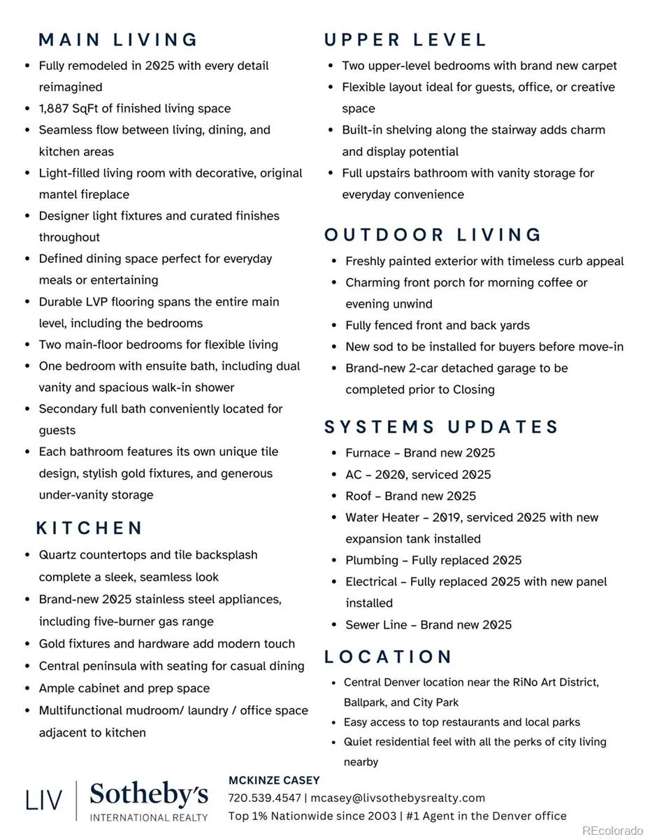 A soulful reinvention of a Denver classic, this home blends elevated living with timeless character in one of the city’s most connected neighborhoods. Fully remodeled in 2025, this four-bedroom, three-bath home, complete with an additional dedicated office, features a sought-after layout that is hard to find in this area. The main floor flows with ease – a light-filled living area, a defined dining space, and a kitchen with brand-new stainless steel appliances, a five-burner gas range, and an inviting eat-in peninsula. Two main-floor bedrooms include one with an ensuite bath featuring a dual vanity and walk-in shower, and another with a full bath on the same level. Each bathroom offers curated tilework, stylish fixtures, and ample vanity cabinet storage. Upstairs, two additional bedrooms provide flexibility for guests, creative space, or a calm retreat, while built-in shelving along the stairway offers a flexible space for a home library or curated display. Outside, the freshly painted exterior and charming front porch create polished curb appeal, complemented by a fully fenced front and back yard and an under-construction two-car garage, set to be completed prior to Closing. Ideally situated near the RiNo Art District, Ballpark, and City Park, the home offers easy access to Denver’s best while providing a quiet retreat. Stylish, modern, and entirely renewed, this is city living redefined. Major system upgrades include: brand-new furnace (2025), A/C (2020) serviced in 2025, HVAC ducting (2025), roof (2025), full plumbing and electrical replacement with new panel (2025), brand-new sewer line (2025), front door and windows (2025), front and rear fencing (2025), and water heater (2019) serviced and updated in 2025 with a new expansion tank.
