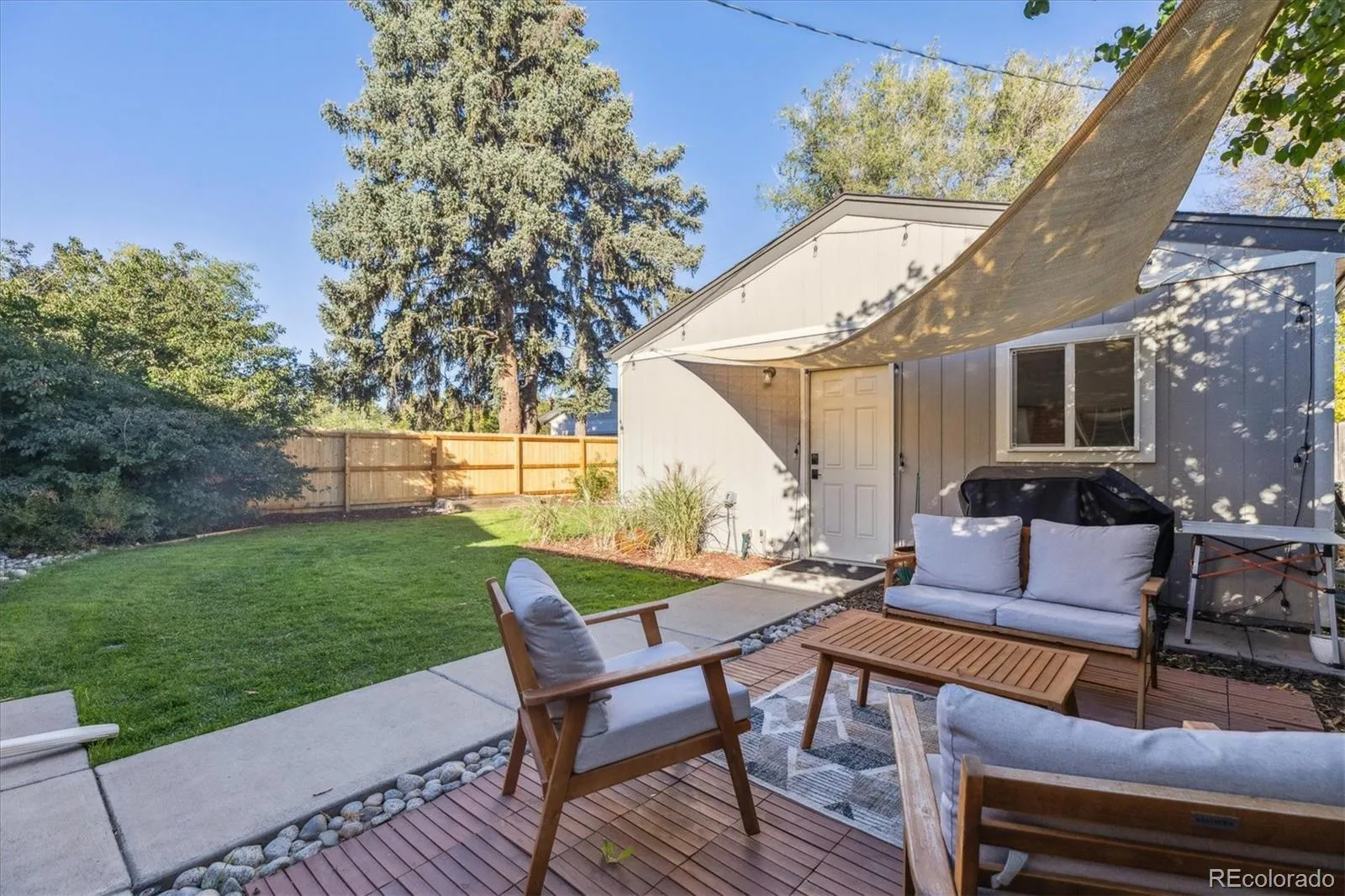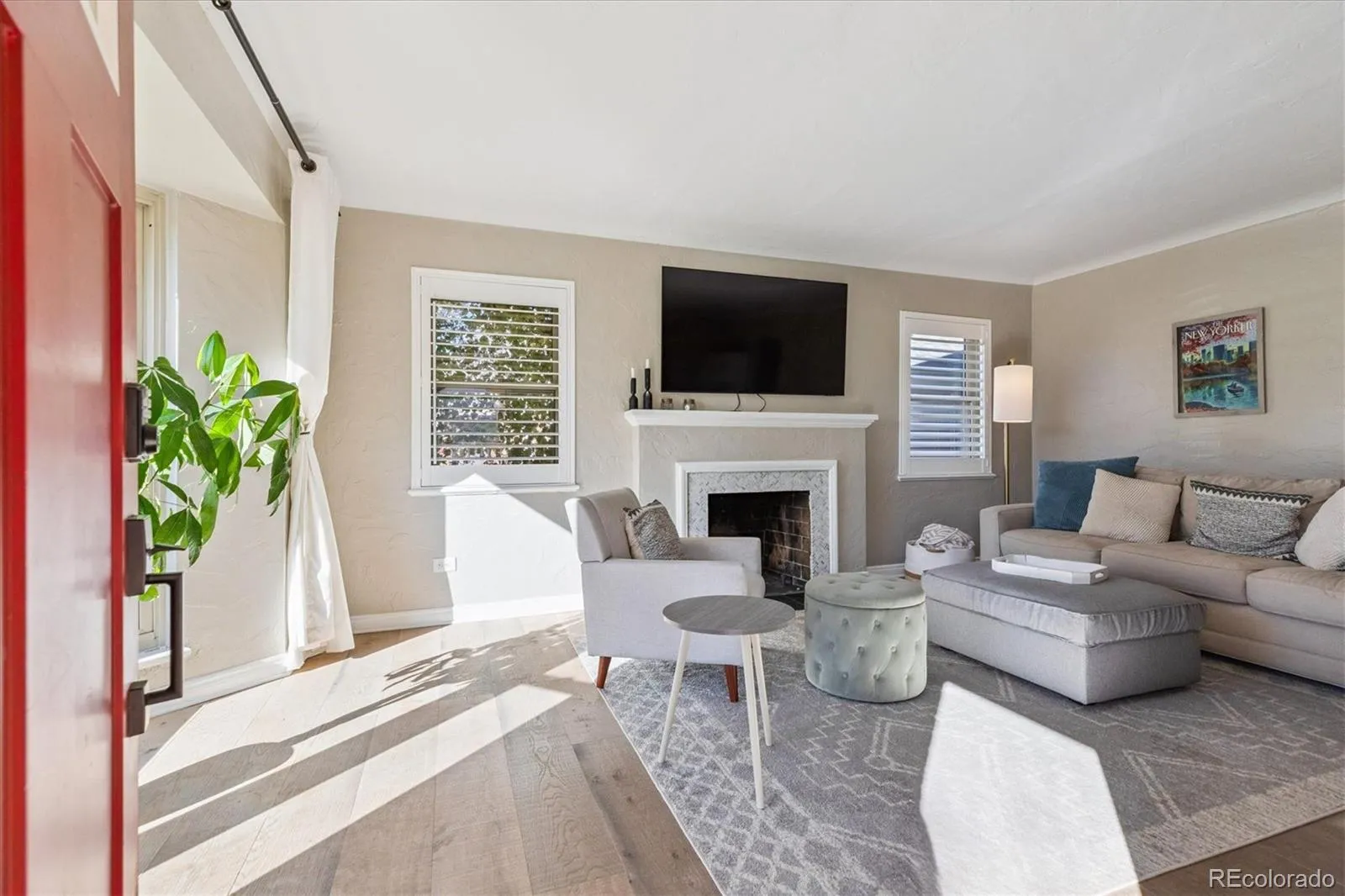 Welcome to this beautifully remodeled Park Hill Tudor, set back from the street on a large lot surrounded by mature landscaping and colorful perennials. Inside, timeless 1940s character blends seamlessly with modern sophistication—featuring elegant bay windows, engineered wood floors, plantation shutters, and a striking tiled fireplace. The open kitchen offers soft-close cabinetry, marble countertops, and premium KitchenAid appliances. The central main area offers two bedrooms and a full bath, plus beyond the kitchen, an addition boasts another bedroom, office, and half-bath. Downstairs, the basement serves for additional living space with a fourth bedroom and a remodeled 3/4 bath. The laundry/utility room offers a new water filtration system. Out back, the private backyard lives large with a patio, professional landscaping, new fence, and a detached 2-car garage with independent HVAC! The attached carport out front means this home features 3 covered parking spots, plus additional areas for storage. This home has been well maintained and cared for, Most major systems have been updated within the last decade, and the roof was replaced in 2023. Located just blocks from some of the best Park Hill has to offer including schools, shops and restaurants.