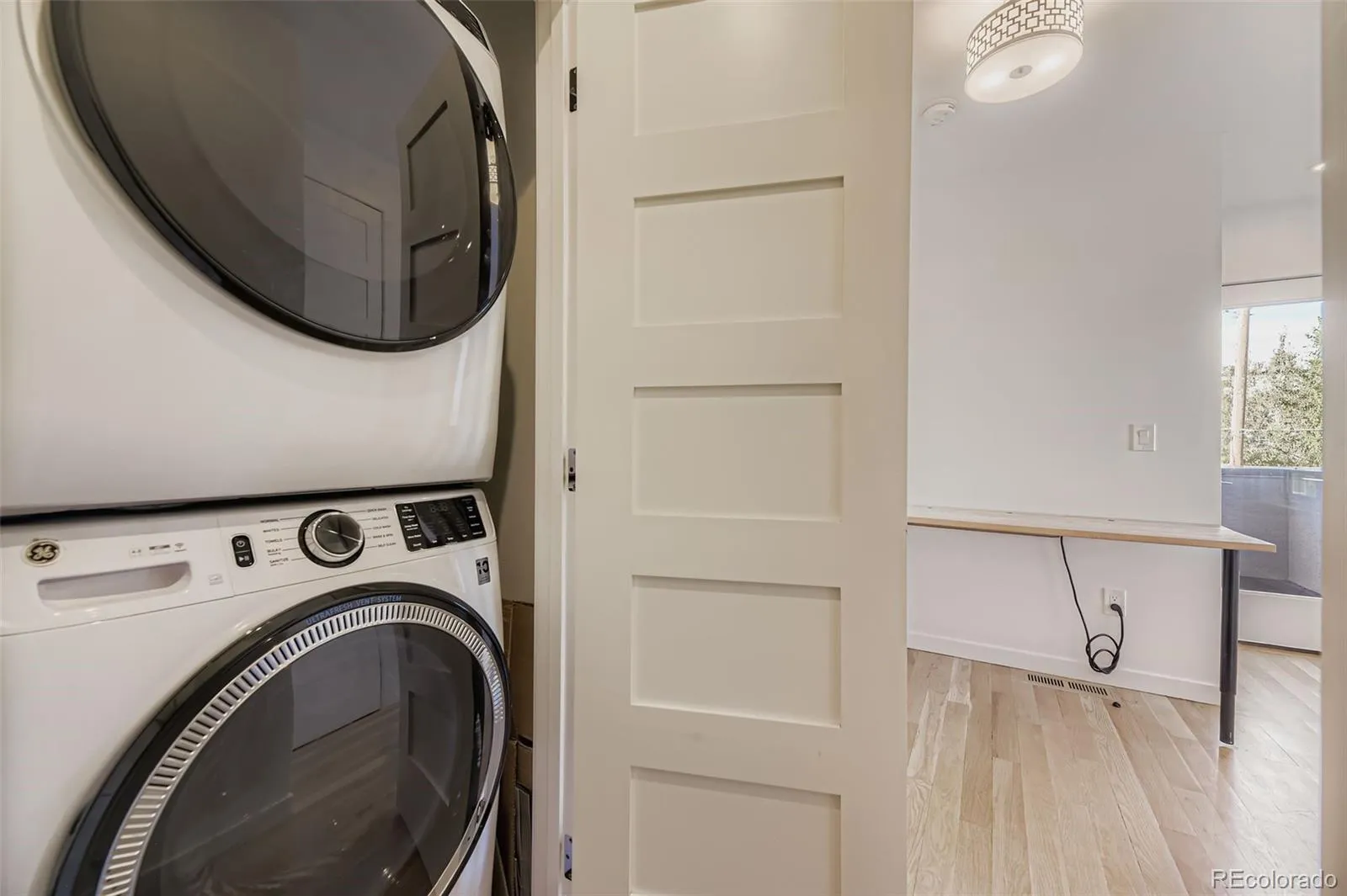 The open kitchen offers quartz countertops, premium appliances, and great storage. Upstairs includes an office nook, laundry, and the primary suite. The top-of-the-line washer and dryer (less than one year old) stay with the home.