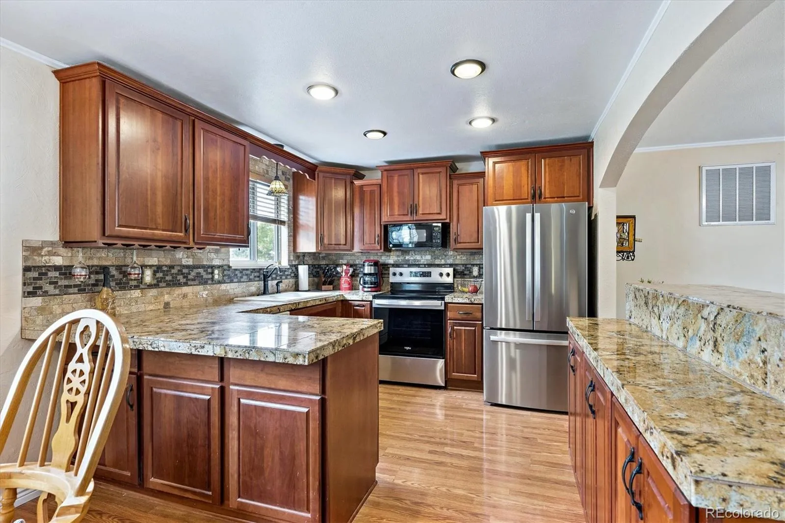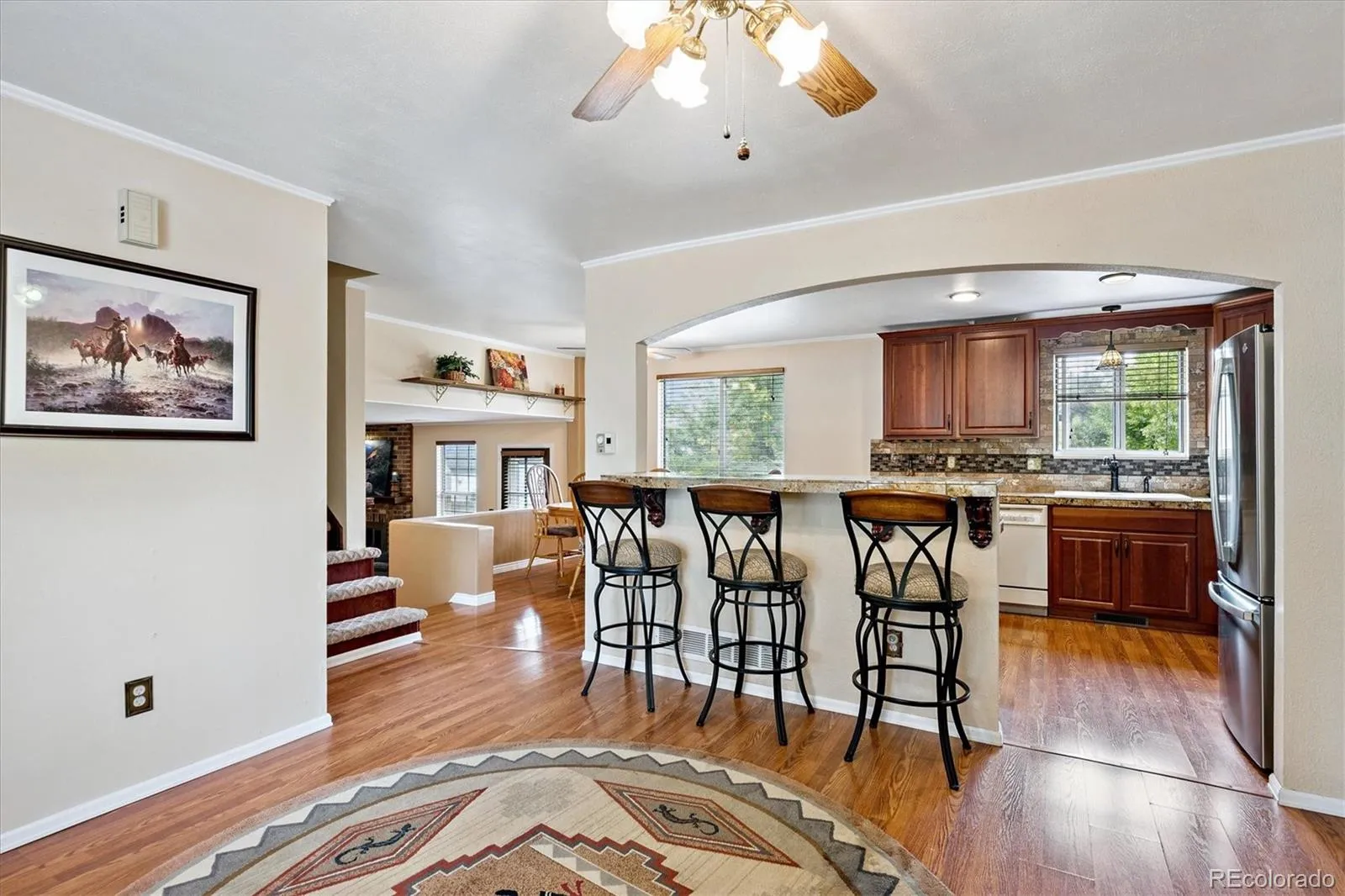 Tucked away on a generous corner lot in the heart of the beloved Smoky Hill neighborhood, this 3-bedroom, 3-bathroom charmer is part of the highly acclaimed Cherry Creek School District and is ready to welcome you home! From the moment you arrive, the lush, lovingly landscaped front yard offers standout curb appeal — the kind that makes you smile every time you pull into the driveway. Inside, you’ll find a classic tri-level layout with just the right mix of modern updates and timeless comfort. The heart of the home? A bright and welcoming eat-in kitchen with breakfast bar, beautiful updated custom cabinets, cheerful windows, timeless granite countertops, and plenty of storage — perfect for pancake breakfasts or after-school snacks. Two cozy and versatile living areas give you room to spread out. The upper level is light, open, and inviting — while the lower level features a cozy brick fireplace flanked by built-in bookshelves just waiting for your favorite family photos, vintage vinyl’s, or well-loved books. It’s the ultimate spot for movie nights, game days, or fireside chats. Upstairs, the primary suite offers a private retreat with a private 3/4 bath, while two additional spacious bedrooms bring flexibility for family, guests, or a sunny home office. Step outside and let the memories begin — this backyard was made for backyard barbecues, birthday parties, or peaceful mornings with a cup of coffee. With multiple seating areas, garden beds, and a fenced yard full of potential, it’s your own slice of heaven. Complimentary amenities through Smoky Hill Metropolitan District and Front Range Recreation- include the Clubhouse, Park, Playground, Pool, Tennis, Basketball, & Pickleball Courts. Nestled in a friendly Centennial community close to parks, schools, shopping, and dining, this home offers the ideal mix of comfort, connection, and classic charm. It’s not just a house — it’s the setting for your next great chapter. So go ahead, cue the theme song… this is the one.