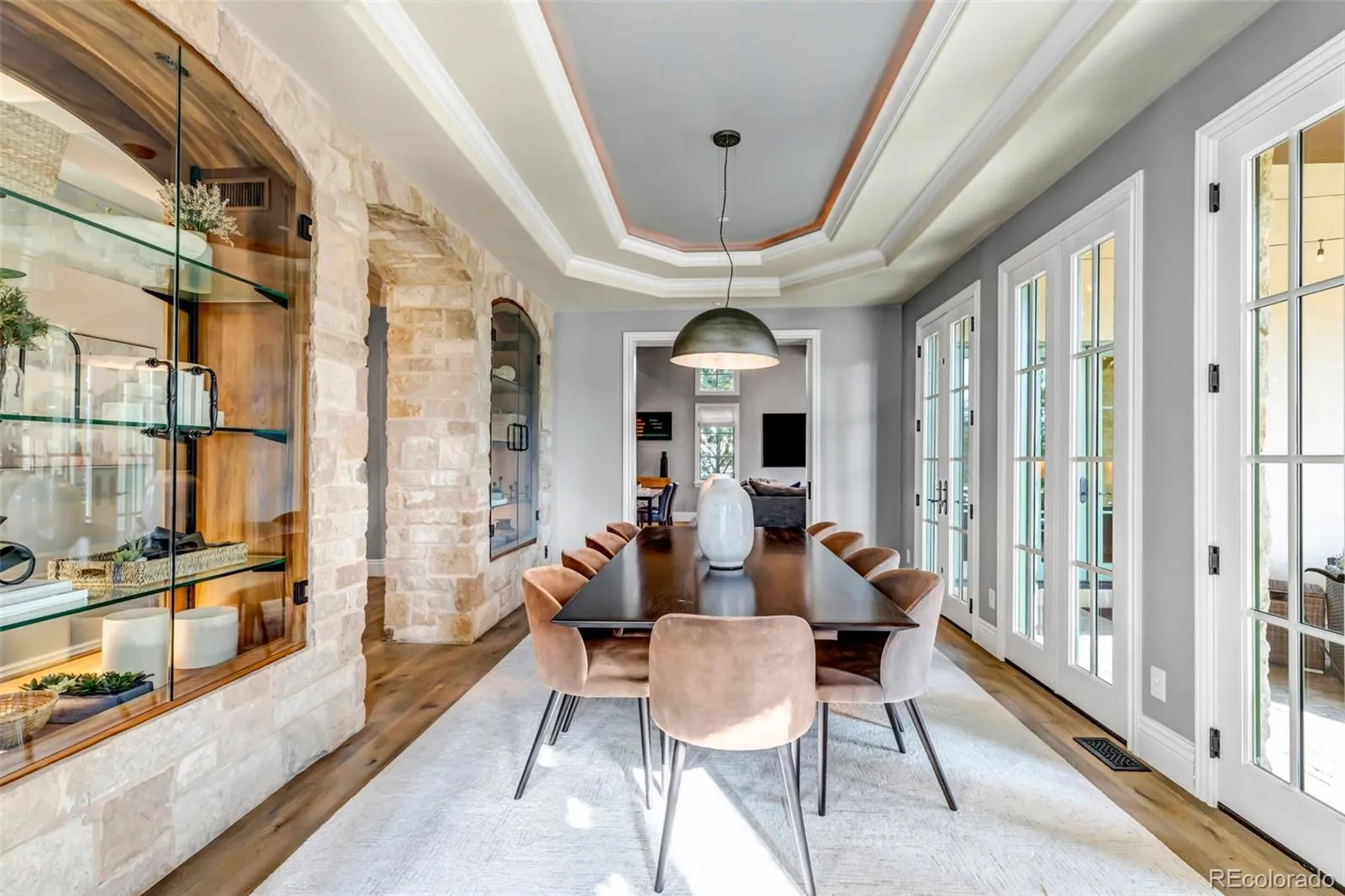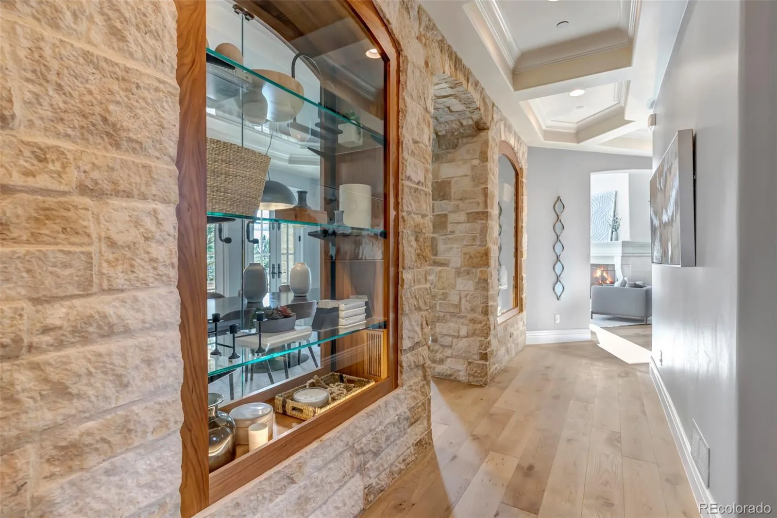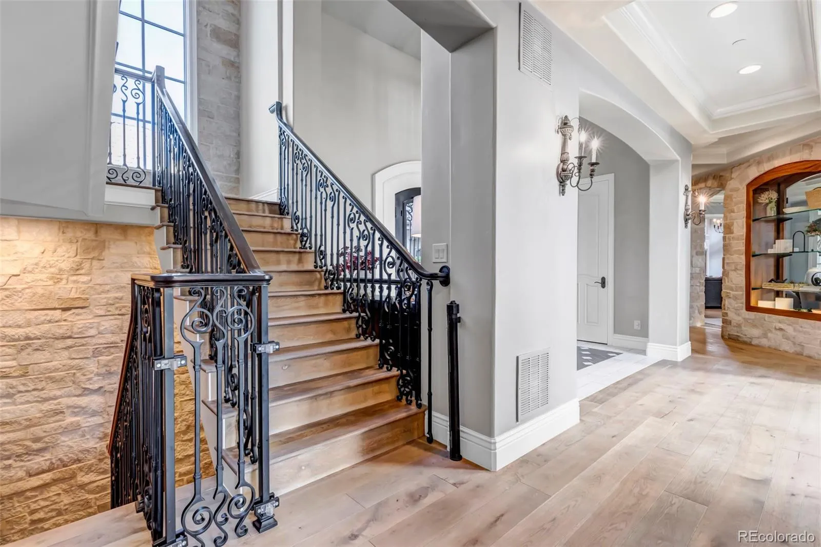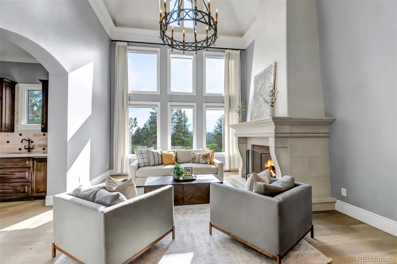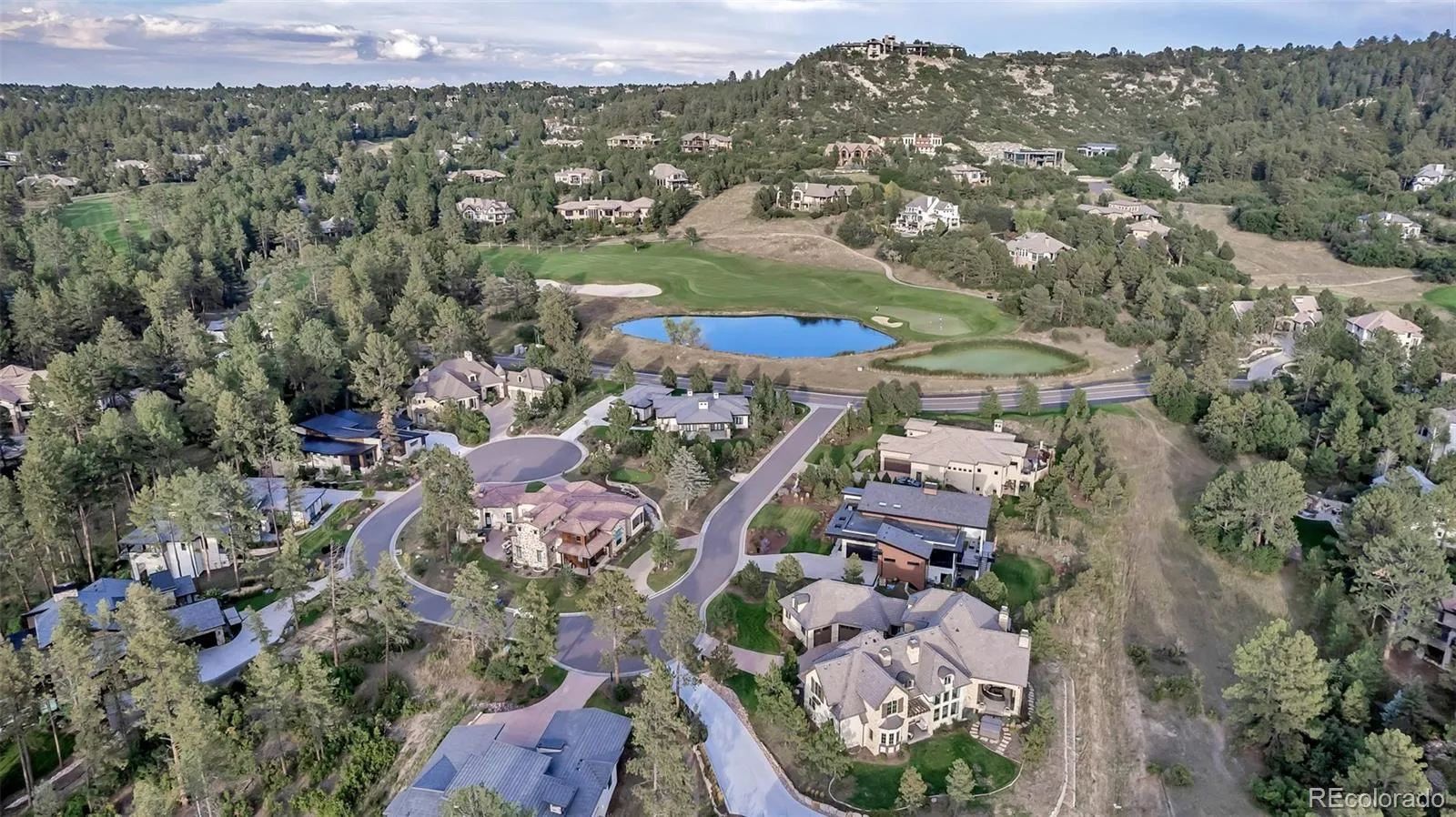 Discover luxury living in this updated residence located on a quiet cul-de-sac in Castle Pines Village. Enjoy prime proximity to world-class golf courses, scenic parks, playgrounds, tennis, pickle ball, winding trails, and resort-style pools—perfect for an active, serene lifestyle. The custom stone exterior embodies contemporary french chateau design, iron doors at the grand entry, stained glass windows, and charming iron window flower boxes. The well landscaped and flat backyard is very usable, and backs to open space with wooded areas and mountain views. Both the family room and dining room open to the private covered patio with a built-in fireplace and stone mantle, gas grill, and pre wired hot tub space. An additional patio is accessible from study and primary. This custom floorplan includes en-suite baths for each bedroom, two offices with custom wood shelving, and a sprawling 3,400 sq ft recently custom-finished basement. Soaring 14-foot ceilings and custom wood beams define the open kitchen/great room. The gourmet kitchen stands out with a butler’s pantry, La Cornue Chateau gas range, and all high end finishes. A mudroom with dog wash adds to the convenience. The impressive main floor primary suite is a sanctuary: including fireplace, an oversized luxury bath with steam shower, two-story seasonal closet featuring custom iron railing and winding staircase, plus built-in secondary laundry. A cozy study with fireplace and built-ins completes the main level. The stunning basement was recently improved with: full wet bar with wine coolers, fridge, ice maker, dishwasher, and barstool seating overlooking the family room and entertainment space. A state-of-the-art custom home theater with smart/premium AV electronics and tiered seating; en-suite bedroom; dedicated gym with bathroom; and custom gaming room ideal for teens online gaming or a podcast studio. This rare find blends style, functionality, and outdoor living in one of Colorado’s most popular neighborhoods.