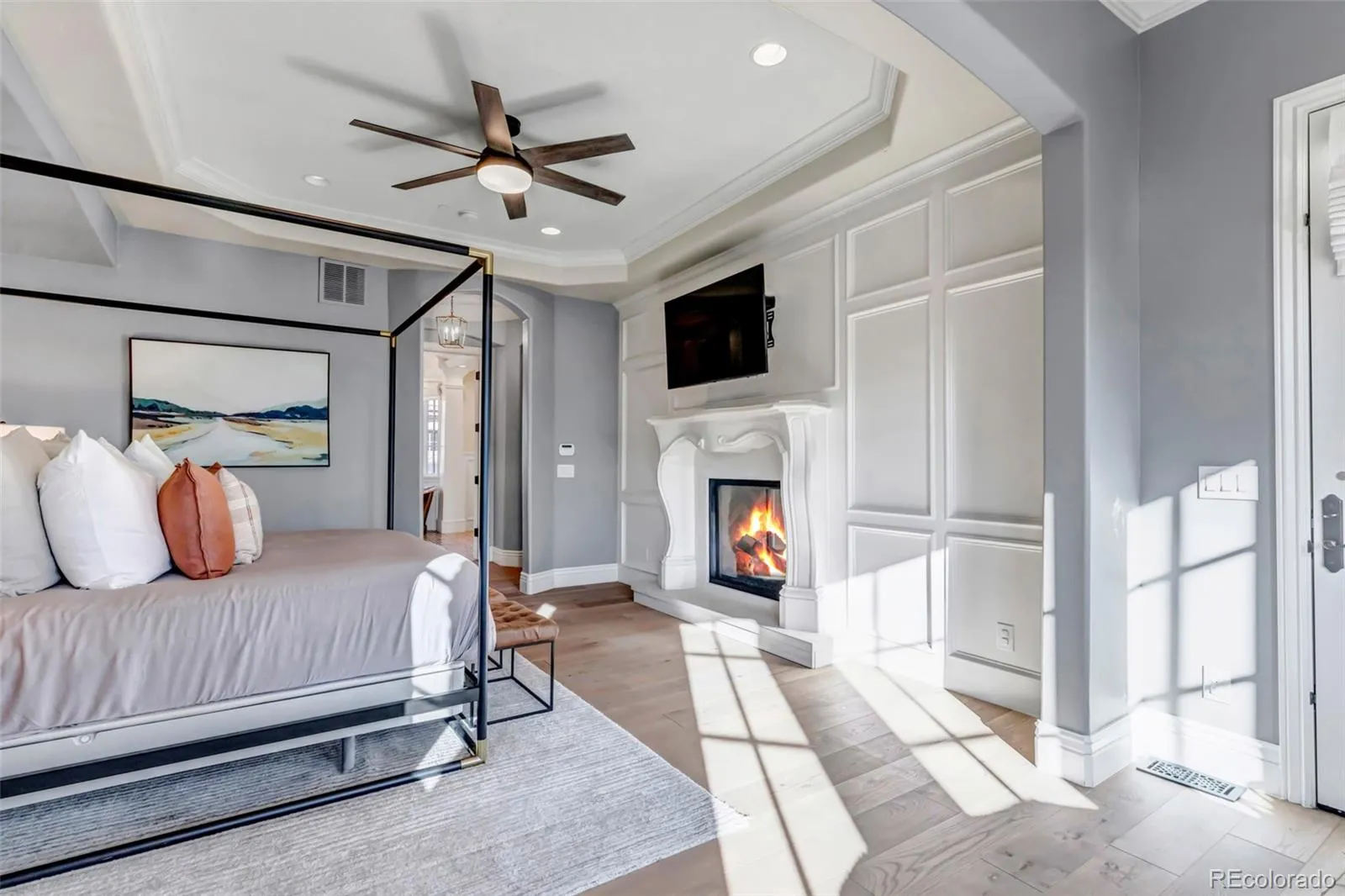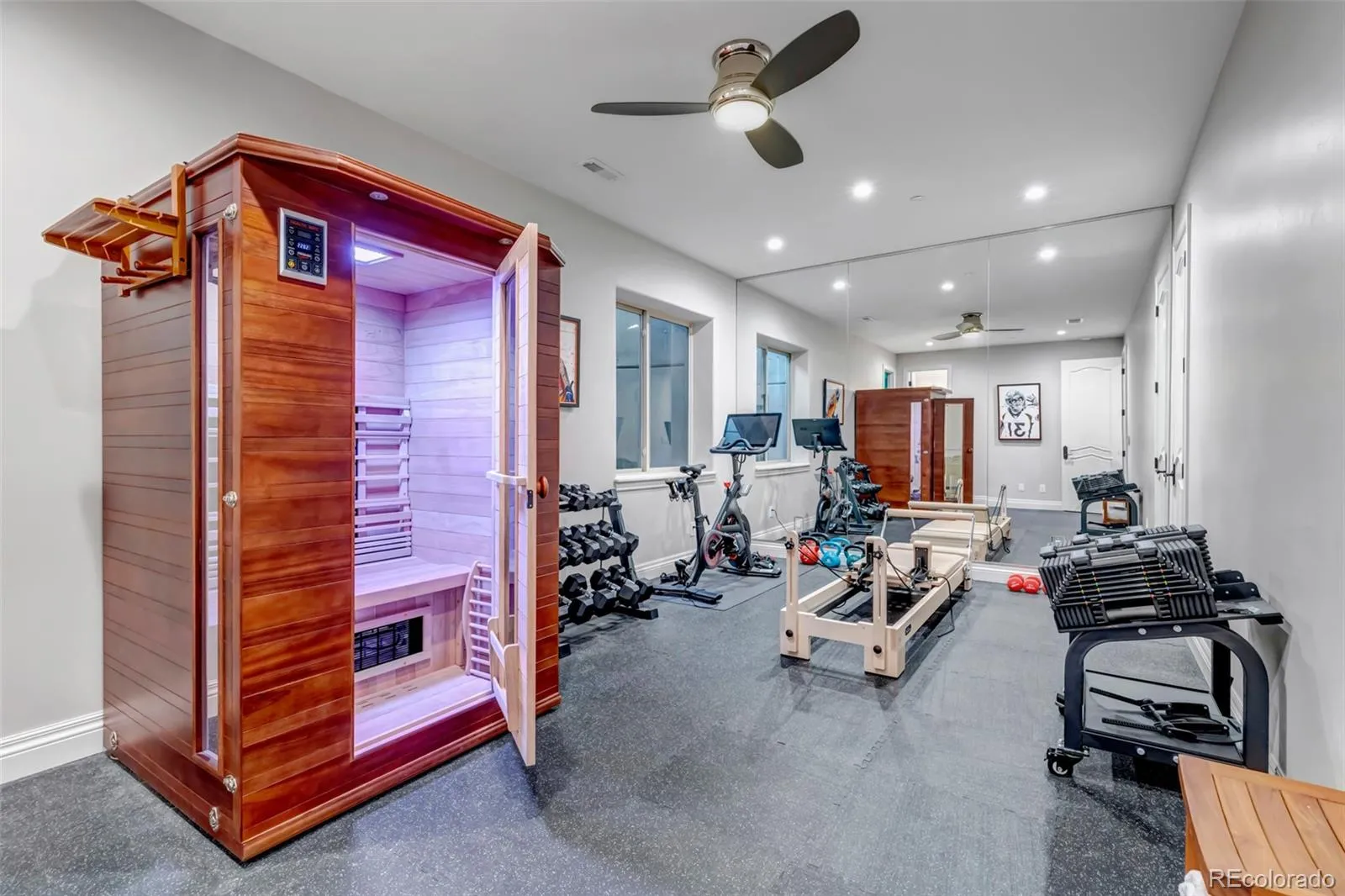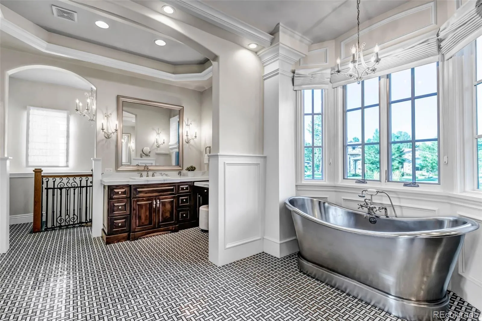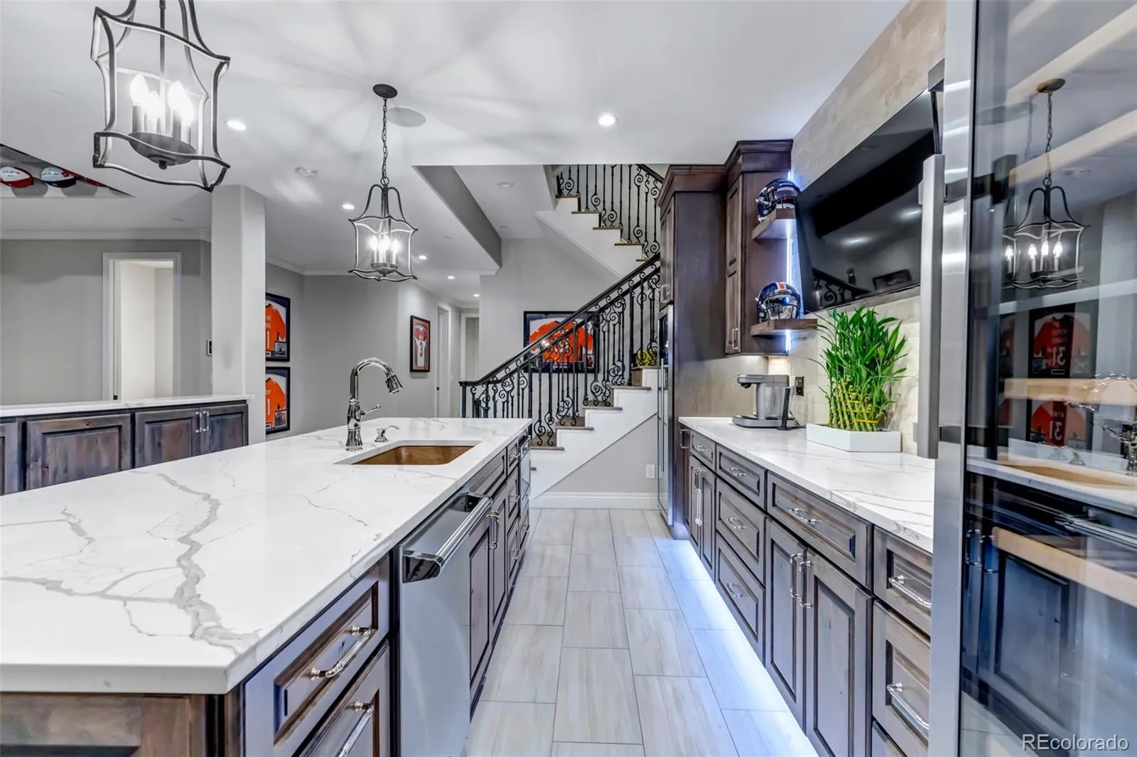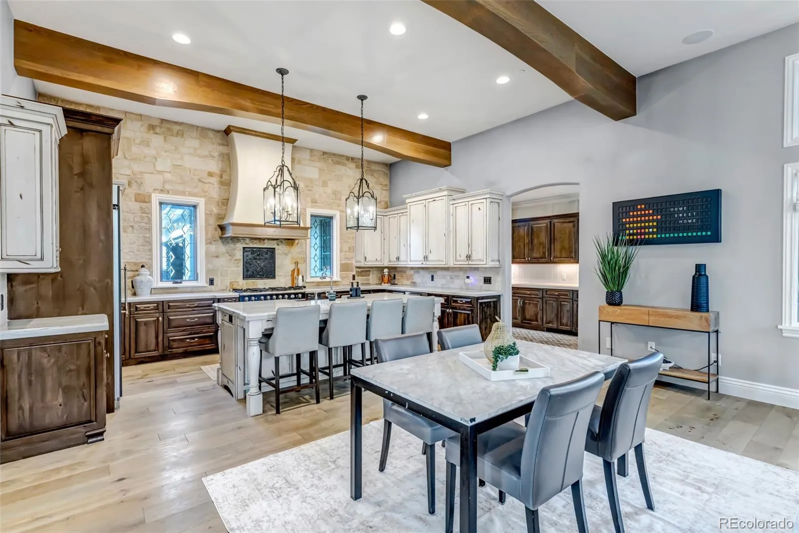 Discover luxury living in this updated residence located on a quiet cul-de-sac in Castle Pines Village. Enjoy prime proximity to world-class golf courses, scenic parks, playgrounds, tennis, pickle ball, winding trails, and resort-style pools—perfect for an active, serene lifestyle. The custom stone exterior embodies contemporary french chateau design, iron doors at the grand entry, stained glass windows, and charming iron window flower boxes. The well landscaped and flat backyard is very usable, and backs to open space with wooded areas and mountain views. Both the family room and dining room open to the private covered patio with a built-in fireplace and stone mantle, gas grill, and pre wired hot tub space. An additional patio is accessible from study and primary. This custom floorplan includes en-suite baths for each bedroom, two offices with custom wood shelving, and a sprawling 3,400 sq ft recently custom-finished basement. Soaring 14-foot ceilings and custom wood beams define the open kitchen/great room. The gourmet kitchen stands out with a butler’s pantry, La Cornue Chateau gas range, and all high end finishes. A mudroom with dog wash adds to the convenience. The impressive main floor primary suite is a sanctuary: including fireplace, an oversized luxury bath with steam shower, two-story seasonal closet featuring custom iron railing and winding staircase, plus built-in secondary laundry. A cozy study with fireplace and built-ins completes the main level. The stunning basement was recently improved with: full wet bar with wine coolers, fridge, ice maker, dishwasher, and barstool seating overlooking the family room and entertainment space. A state-of-the-art custom home theater with smart/premium AV electronics and tiered seating; en-suite bedroom; dedicated gym with bathroom; and custom gaming room ideal for teens online gaming or a podcast studio. This rare find blends style, functionality, and outdoor living in one of Colorado’s most popular neighborhoods.