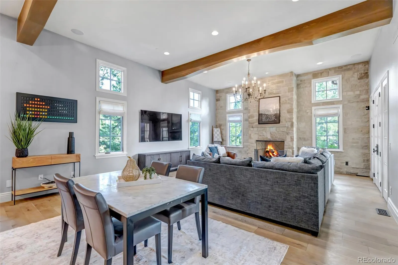 Discover luxury living in this updated residence located on a quiet cul-de-sac in Castle Pines Village. Enjoy prime proximity to world-class golf courses, scenic parks, playgrounds, tennis, pickle ball, winding trails, and resort-style pools—perfect for an active, serene lifestyle. The custom stone exterior embodies contemporary french chateau design, iron doors at the grand entry, stained glass windows, and charming iron window flower boxes. The well landscaped and flat backyard is very usable, and backs to open space with wooded areas and mountain views. Both the family room and dining room open to the private covered patio with a built-in fireplace and stone mantle, gas grill, and pre wired hot tub space. An additional patio is accessible from study and primary. This custom floorplan includes en-suite baths for each bedroom, two offices with custom wood shelving, and a sprawling 3,400 sq ft recently custom-finished basement. Soaring 14-foot ceilings and custom wood beams define the open kitchen/great room. The gourmet kitchen stands out with a butler’s pantry, La Cornue Chateau gas range, and all high end finishes. A mudroom with dog wash adds to the convenience. The impressive main floor primary suite is a sanctuary: including fireplace, an oversized luxury bath with steam shower, two-story seasonal closet featuring custom iron railing and winding staircase, plus built-in secondary laundry. A cozy study with fireplace and built-ins completes the main level. The stunning basement was recently improved with: full wet bar with wine coolers, fridge, ice maker, dishwasher, and barstool seating overlooking the family room and entertainment space. A state-of-the-art custom home theater with smart/premium AV electronics and tiered seating; en-suite bedroom; dedicated gym with bathroom; and custom gaming room ideal for teens online gaming or a podcast studio. This rare find blends style, functionality, and outdoor living in one of Colorado’s most popular neighborhoods.