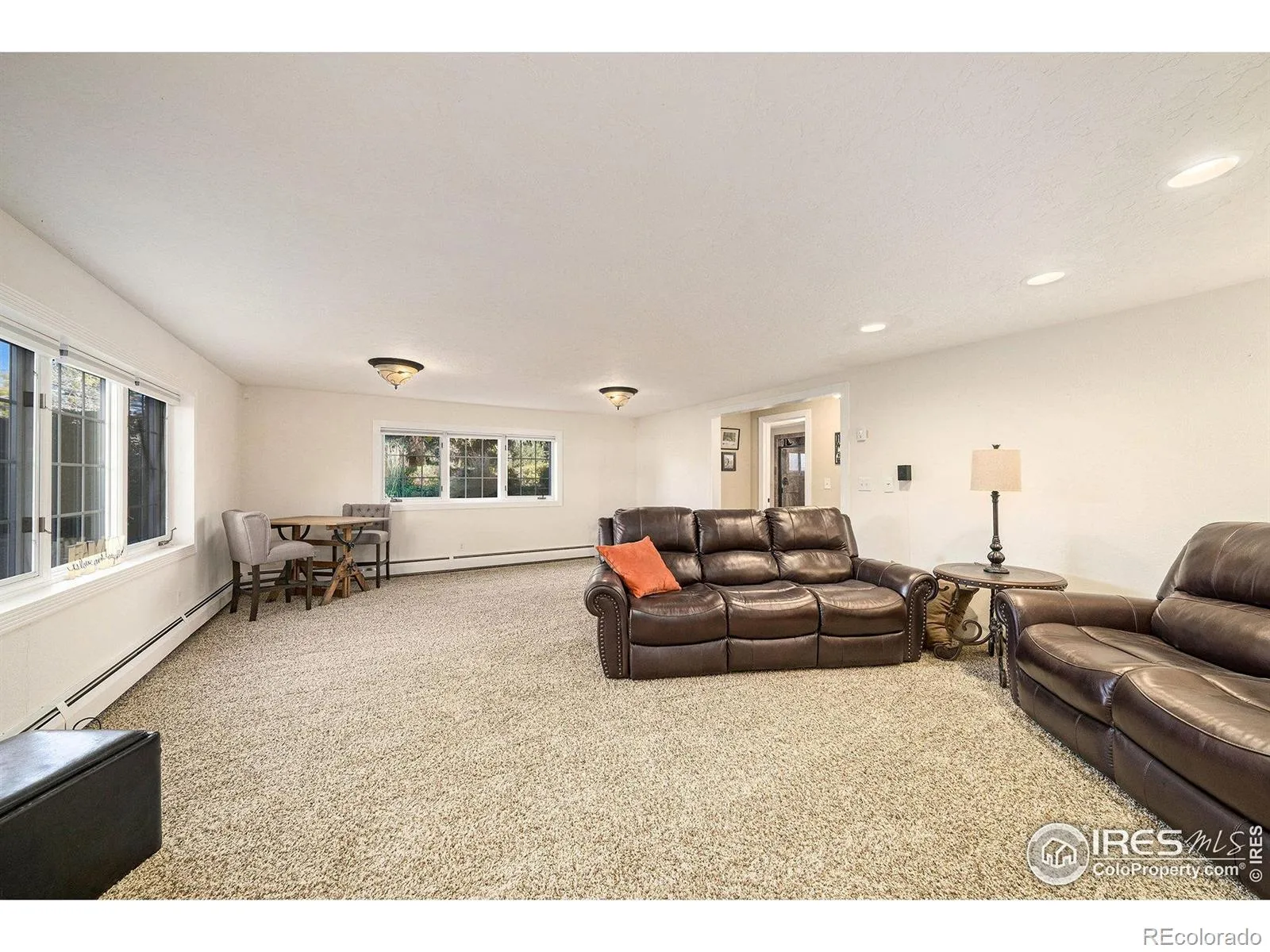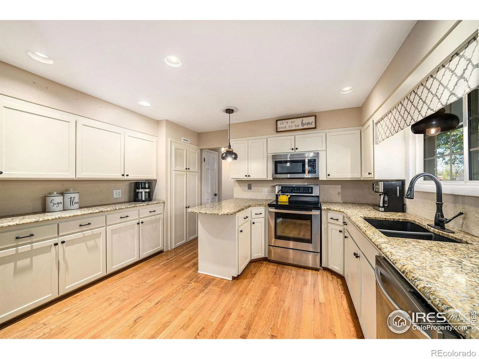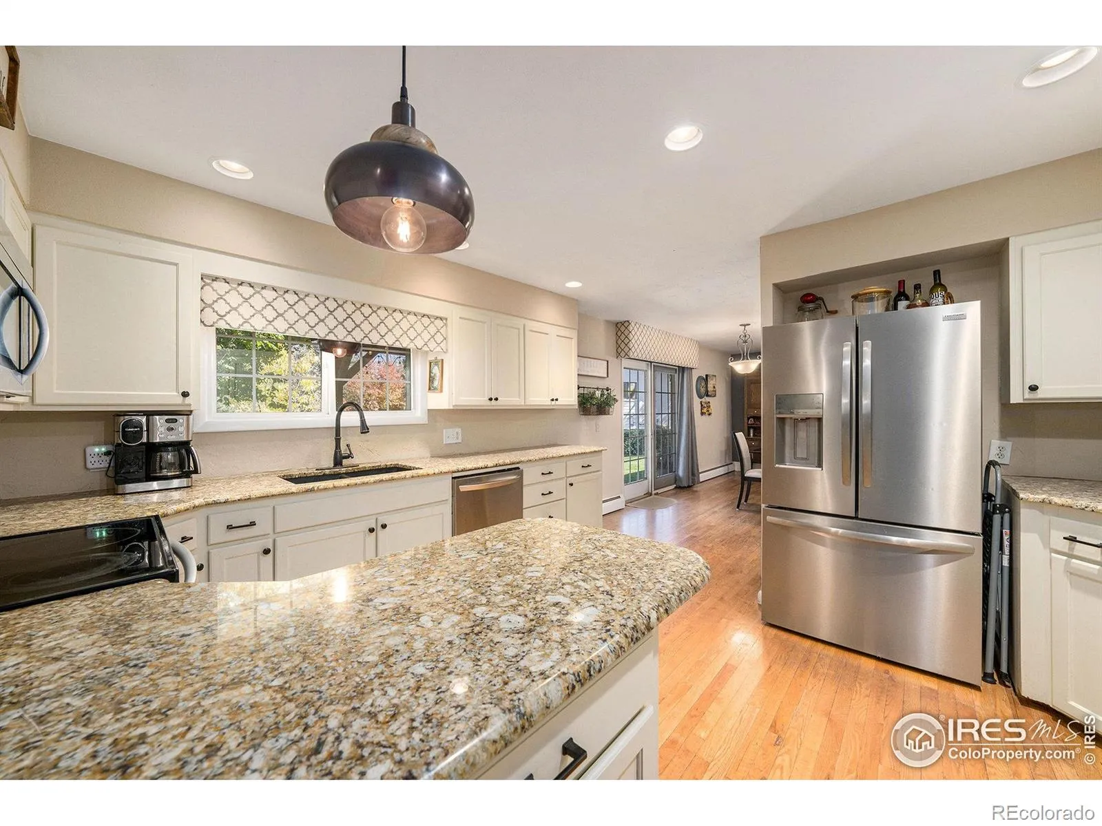 Beautiful Hilltop ranch home ready and waiting for you! No HOA or Metro! NEW energy efficient furnace and tankless water heater just installed. This 4 bedroom, 3 bath property is nestled on a .4 acre corner lot with stunning landscaping. The backyard retreat includes a new spacious covered patio, a fire pit area, and a soothing “Falls Only” water feature, included with the property. Inside enjoy a gorgeous large living room with signature ceiling texture and a cozy fireplace. The cheery kitchen and dining room boast wood floors, and the kitchen features granite countertops, ample storage, and stainless steel appliances including a new 2025 refrigerator. The updated laundry room is conveniently located on the main floor and includes a 3/4 bathroom. Three bedrooms and a full bathroom complete the main floor. The renovated garden level basement has space to spare with a large family room and a primary suite that includes a walk-in shower, double sinks, and a large walk-in closet. The oversized two car garage with a workbench has a 50 amp RV plug-in that can easily convert to an EV charger. Multi-gen living option with three bedrooms and two bathrooms on the main floor, along with a primary suite on the lower level. This lovely property is in a serene neighborhood adjacent to the Country Club golf course – not to be missed!