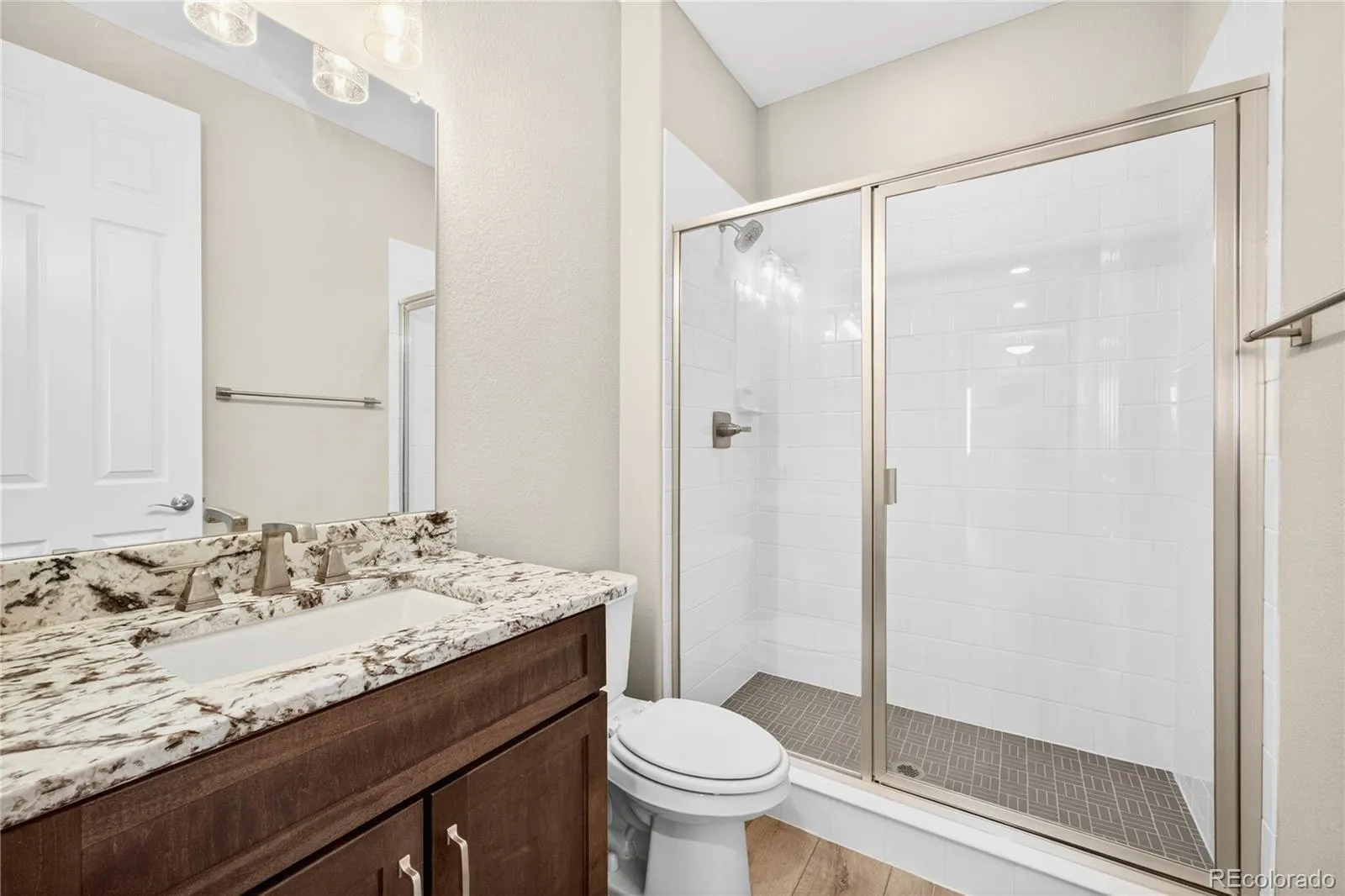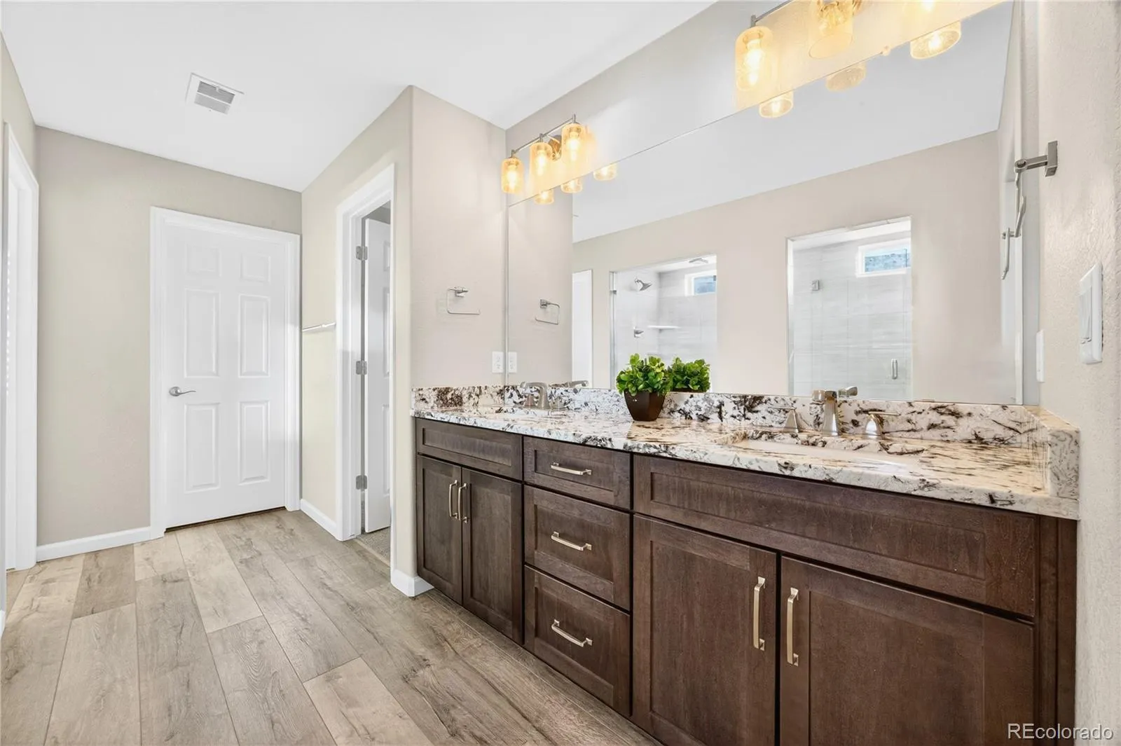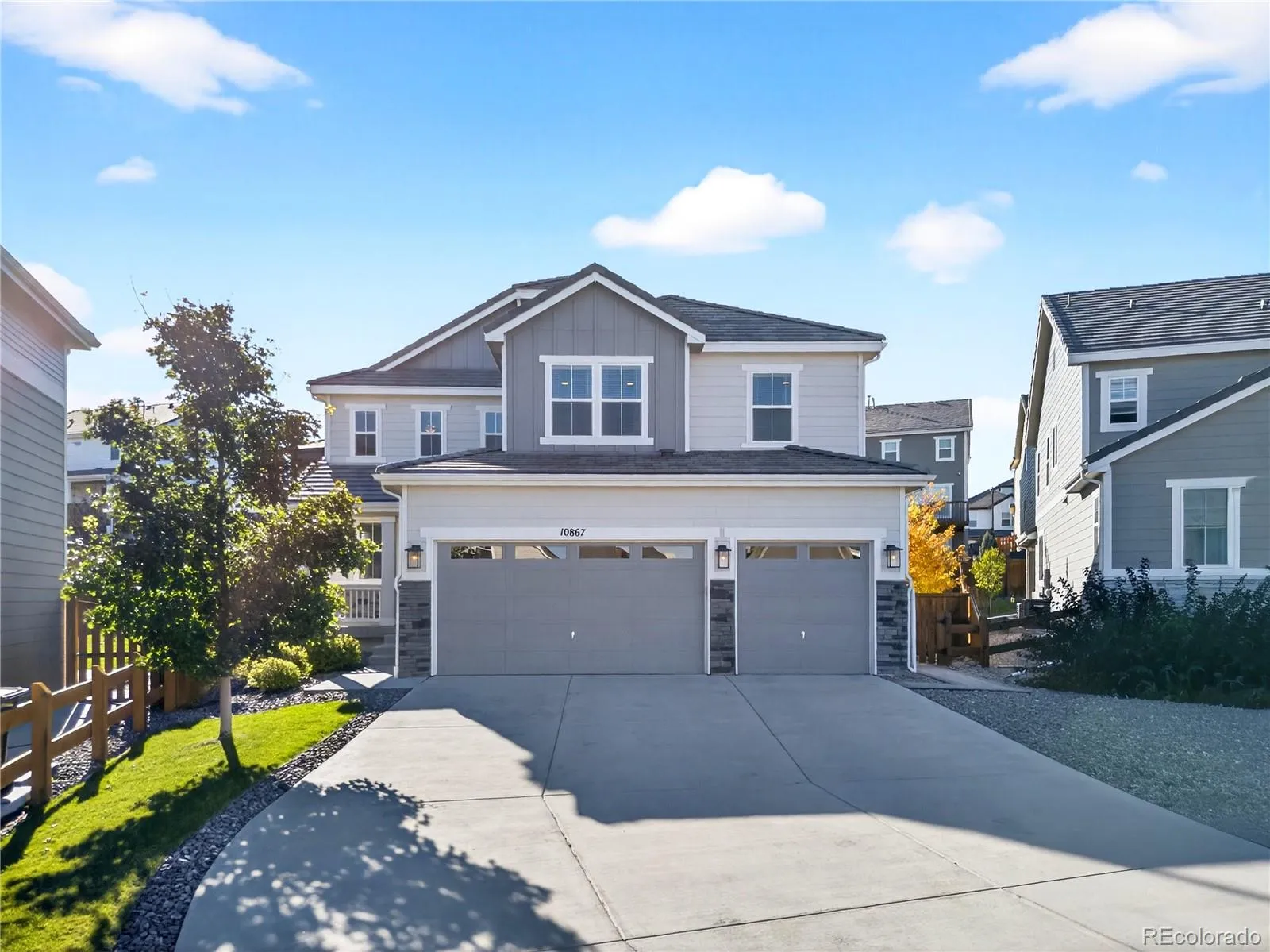 This impeccably maintained 5 bedroom, four bath home with finished basement is sure to impress. Step into the formal entry and the formal dining room (ceiling fan ready) is to your left. To the right is a coat closet, entrance to the basement, the 3 car garage (WiFI capable openers), main floor bedroom and a full bathroom. Continue in to the open concept kitchen with granite countertops, high end stainless steel appliances, & attached sunroom that has a custom glass sliding door with dog door. The kitchen opens to a bright living room featuring a gas fireplace, 5.1 (5 speakers & a sub) wired surround sound, and accordion doors (with wireless remote shades) to the professionally landscaped back yard with wifi enabled sprinkler system. The covered patio boasts a built in gas grill, granite counters & a gas line for your summer bbq. Upstairs you will find the primary suite, laundry, large loft, as well as three other bedrooms. There is a full bathroom in the hall with a double vanity separate from the toilet and tub/shower, and the primary suite has a HUGE walk in shower, two walk in closets as well as a double vanity and tray ceiling. All thermostats throughout the house are smart thermostats. Head downstairs to the finished basement featuring a huge great room, as well as another bedroom with an egress window and attached jack and Jill style 3/4 bathroom. The basement also has a storage room as well as the utility room. Custom window coverings stay with the home. Close to shopping, 470, and I25 for a fast commute.