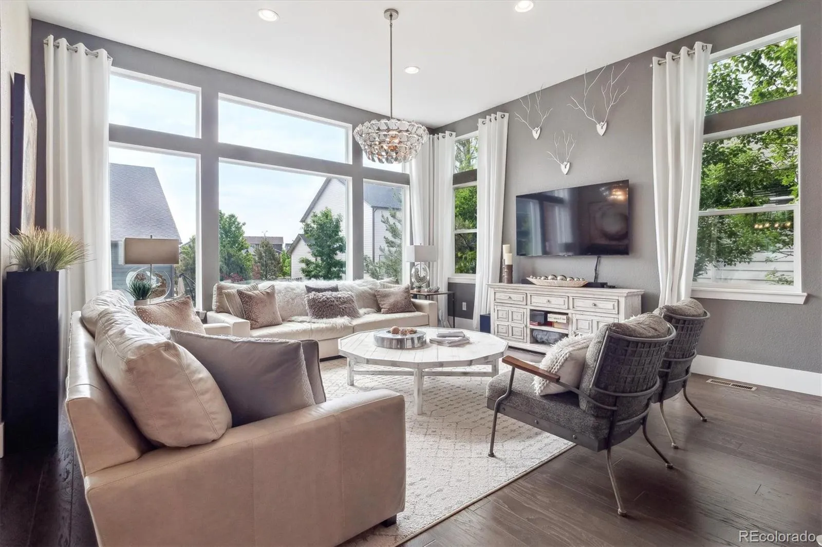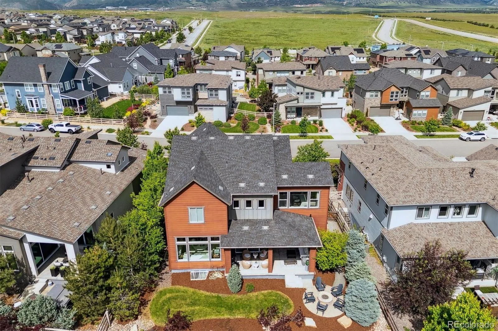 Rare Former Popular Wonderland “Oriole” Model Home. Step into this 5 bed, 5 bath home with a 3 car tandem garage— where luxury meets lifestyle in the heart of Sterling Ranch. With almost 4800 finished sq. feet, and over $300K in upgrades, this striking 5-bedroom home boasts 3-level, grand entry staircase with mountain views through a wall of windows, 12′-14’ ceilings, soaring windows, 8′ doors, dark wood flooring, custom barn doors, expansive walls of glass (over 35′ of sliding glass) that connect indoor and outdoor living, and a gourmet kitchen with granite counter tops, stainless appliances, sleek white cabinets, large pantry and center island, designed to entertain. The private owner’s suite on its own wing, features a HUGE bathroom with a freestanding tub, oversized 100′ sq. foot shower, and custom closet the size of most bedrooms. Additionally on the upper level, a dedicated loft/play area, 3 additional bedrooms with walk-in closets, 3 full baths and laundry room with mountain views. The newly finished basement features a huge living area, wet bar, additional bedroom and a 3/4 bath. This great home also has 2 new A/C Units, and a newer roof. Open all the sliding glass to enjoy those fine Colorado days and evenings in your professionally landscaped, fenced yard with a gas fire pit. Located in the Douglas County School district, this community also features, coffee shop, brewery, trails, parks, community events, a club house and pool all within walking distance. Do NOT Miss this great home schedule your showings today.