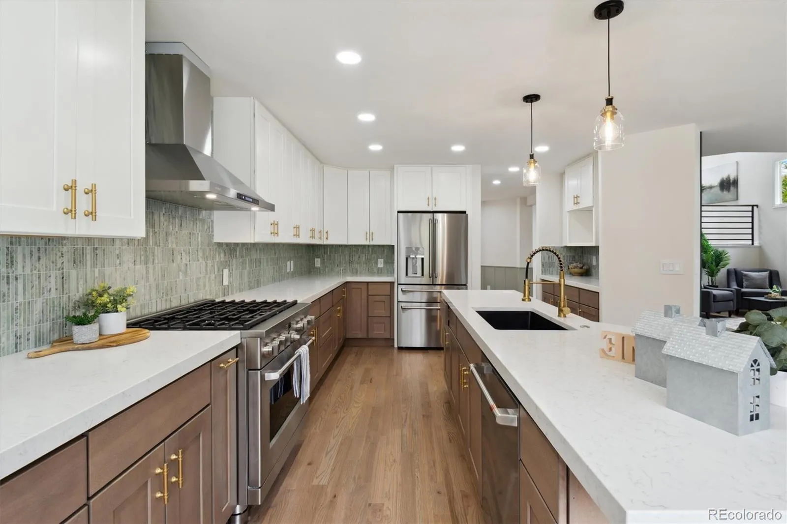 The chef’s kitchen is a showpiece, boasting 42-inch custom cabinetry, thick quartz countertops, and premium Café appliances. The seamless flow between the kitchen, dining area, living room, and back deck creates an inviting environment for both entertaining and everyday living.