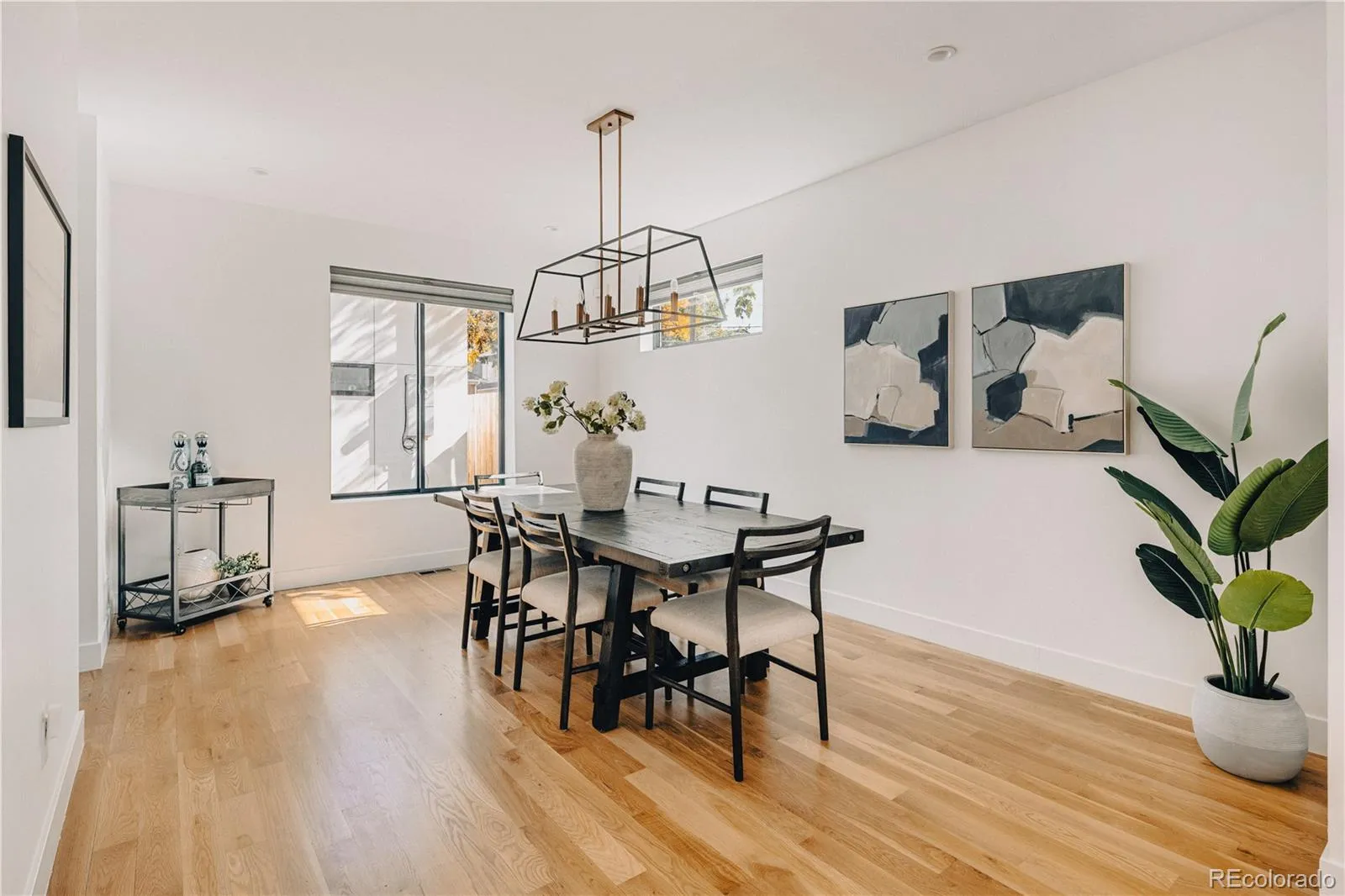 Nestled on a tree-lined block steps from Tennyson Street and Berkeley Lake, this modern 3 bed / 3 bath home (just under 3,000 sq ft; 2022 build) blends clean design with effortless livability. A charming front porch and fenced yard welcome you inside to a main level that runs the length of the home—wide-open, bright, and airy thanks to expansive windows. The living room centers on a sleek fireplace and flows to an eat-in kitchen with quartz counters, generous cabinet storage, island seating, and a true coffee bar. A discreet mud room and tucked-away powder bath complete the level. Connected side and back yards offer room to play, garden, or entertain.