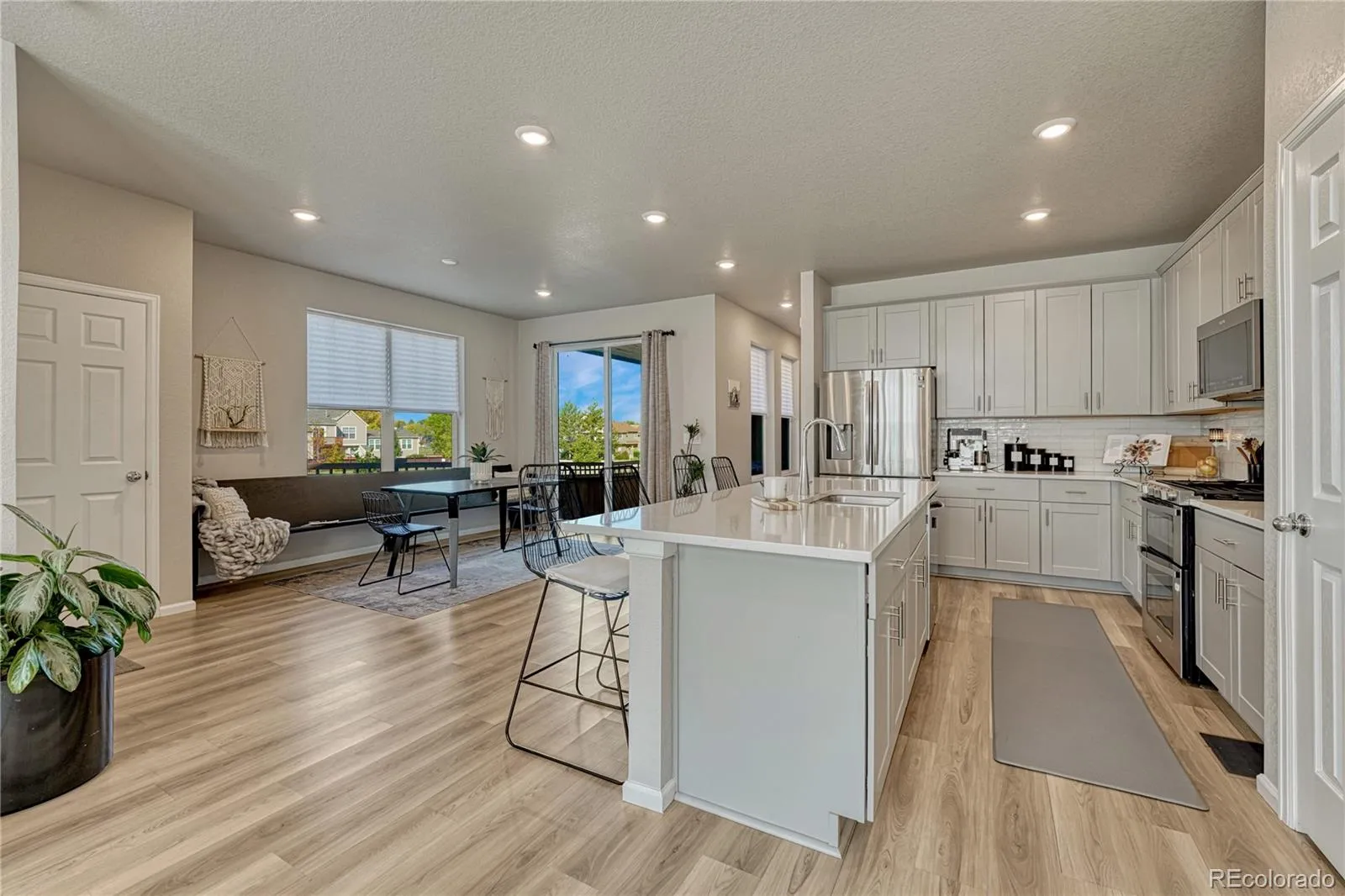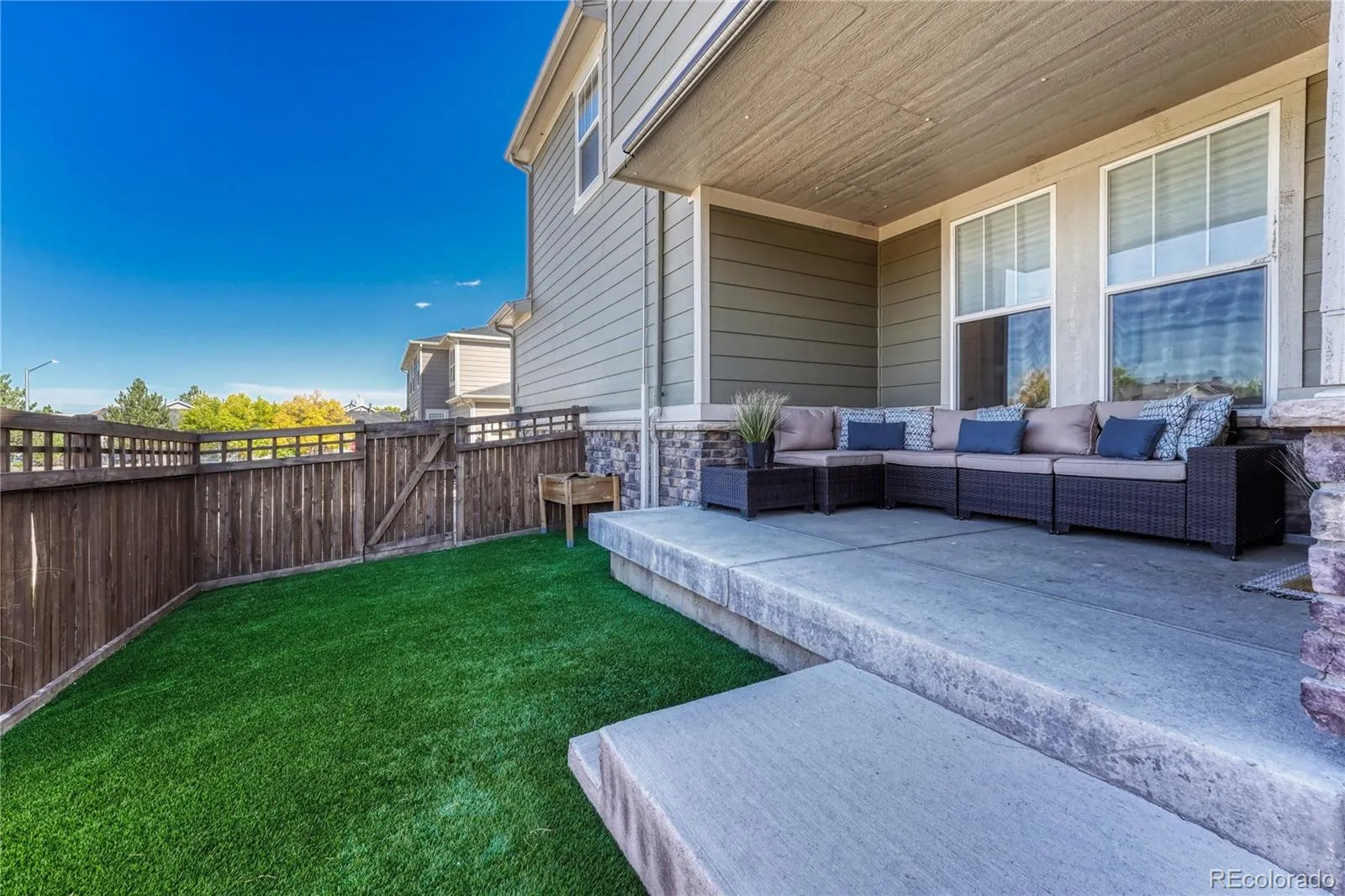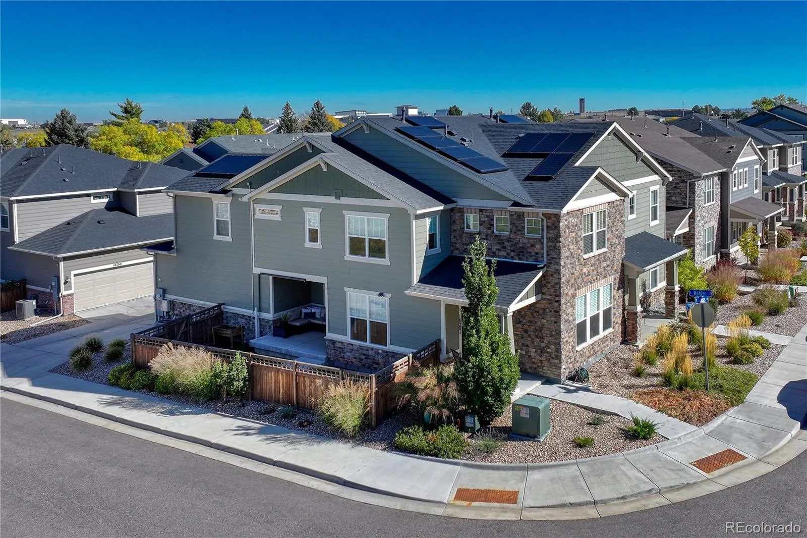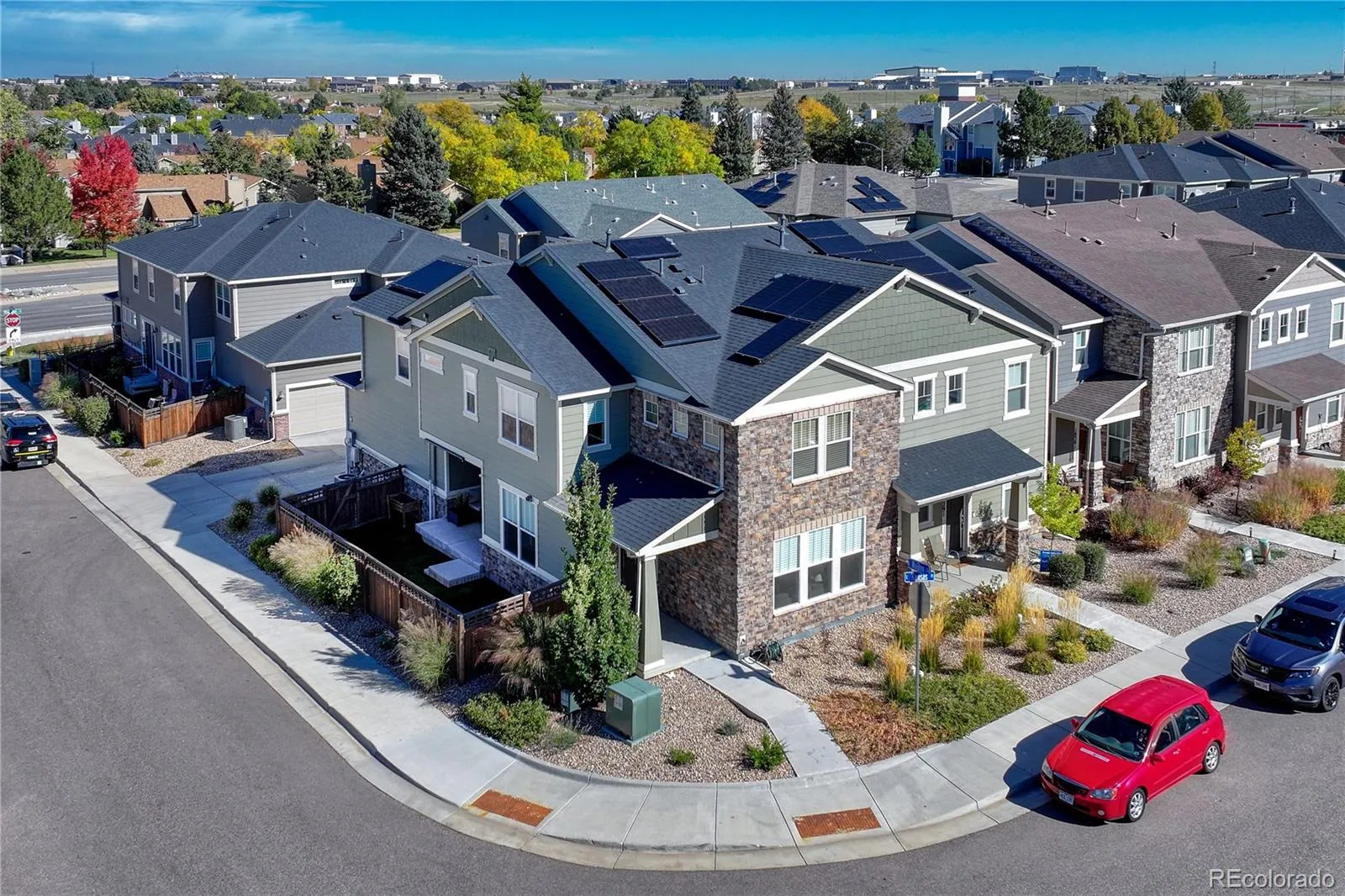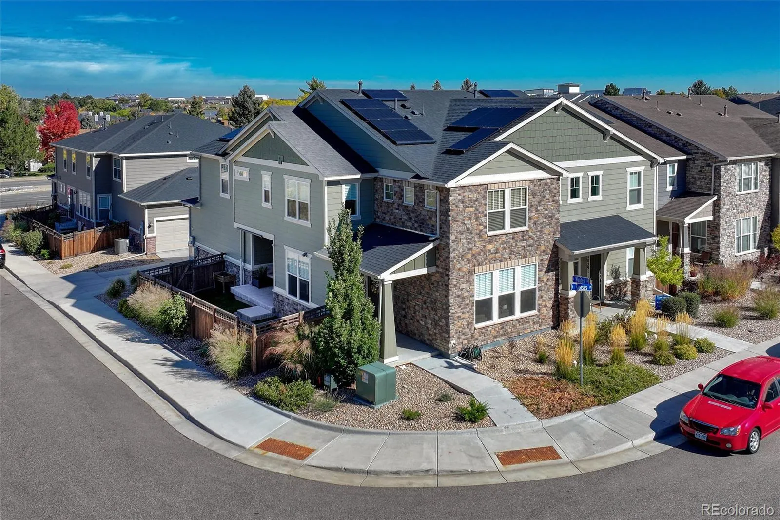 Nestled on a premium end-unit corner lot, this nearly new 2021 energy efficient paired home offers an ideal location, abundant natural light, and low-maintenance living. Tall ceilings, big windows, and an open-concept main level create a bright and welcoming atmosphere from the moment you step inside. Enjoy the benefits of the energy efficient building components and the cost saving feature of seller owned solar panels. WOW! A huge saving going forward! The spacious living room flows to a dedicated dining area and a beautifully upgraded kitchen featuring stainless steel appliances including a gas range, plus a large center island with bar seating for casual meals and gathering. Luxury vinyl plank flooring runs throughout the main level for a modern, cohesive look. Step outside from the dining room to enjoy a covered side patio and an easy-care turf yard, providing the perfect spot to relax or entertain without the upkeep. A convenient half bath, mud room off the garage, and an attached oversized garage add everyday functionality. Upstairs you’ll find a generous primary suite with a large walk-in closet and an adjoining bath offering plenty of space to get ready in comfort. A versatile loft provides room for an office, play area, or home fitness. Two additional bedrooms, full bathroom plus the upstairs laundry complete the upper level. With its corner placement for privacy, abundant sunlight, thoughtful layout, energy efficiency and move-in-ready finishes, this home delivers the perfect blend of style, convenience, and location. Right next to Buckley Space Force Base. Steps away from dining. Easy and convenient access to DIA. Explore more through the virtual tour: https://18281ekansasplace.com/.
