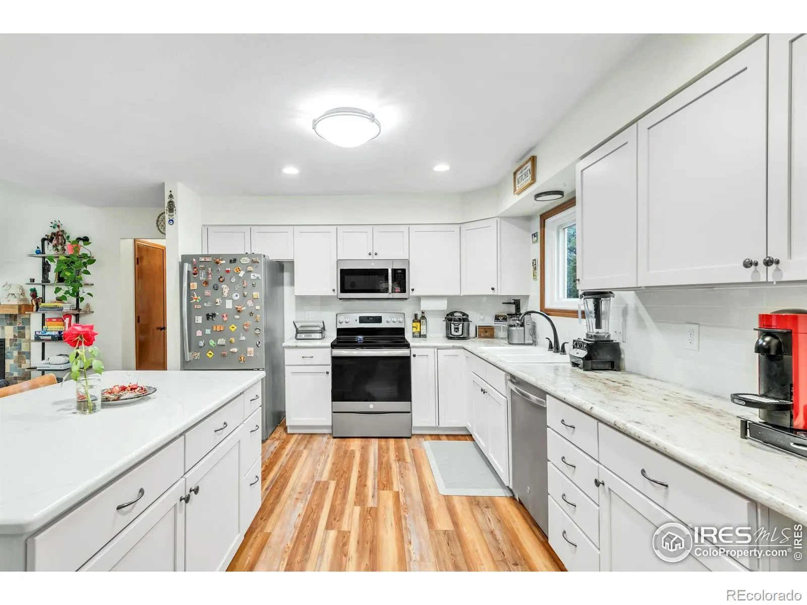 Beaming with warmth and comfortable, modern living, this remodeled brick ranch in Sun Valley offers timeless comfort and style. Set on a generous lot, this home welcomes residents with vaulted ceilings, abundant natural light and a thoughtfully designed, open layout flowing with LVP flooring. The living room’s tiled fireplace creates a cozy focal point, while the sun-drenched dining nook connects seamlessly to a beautifully renovated kitchen featuring newer stainless steel appliances, a center island and ample cabinetry. The sizable primary suite boasts dual closets, complemented by a versatile secondary bedroom perfect for guests or a home office. Two updated bathrooms feature modern tiles and fixtures. Outside, the expansive backyard invites entertaining and relaxation with a sprawling patio, established fruit trees, rose garden and evergreens. Designed for effortless living, this refreshed home delivers peace of mind with newer, high-quality windows and a hail-resistant roof. It perfectly blends those modern upgrades with the comfort of single-level living, all situated in a quiet, established Longmont community and complemented by an oversized two-car garage.