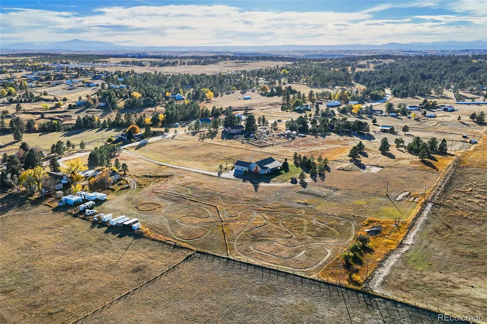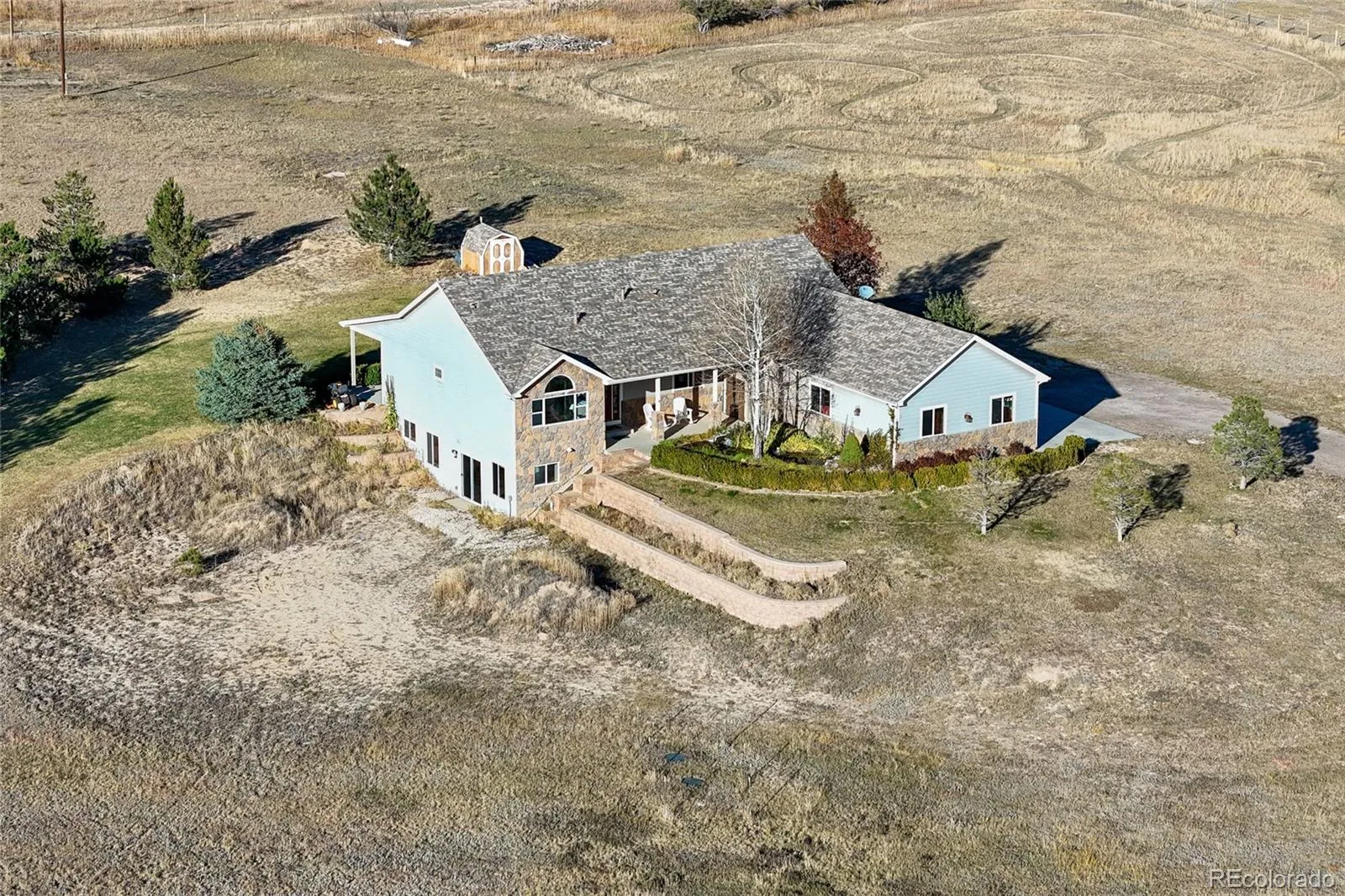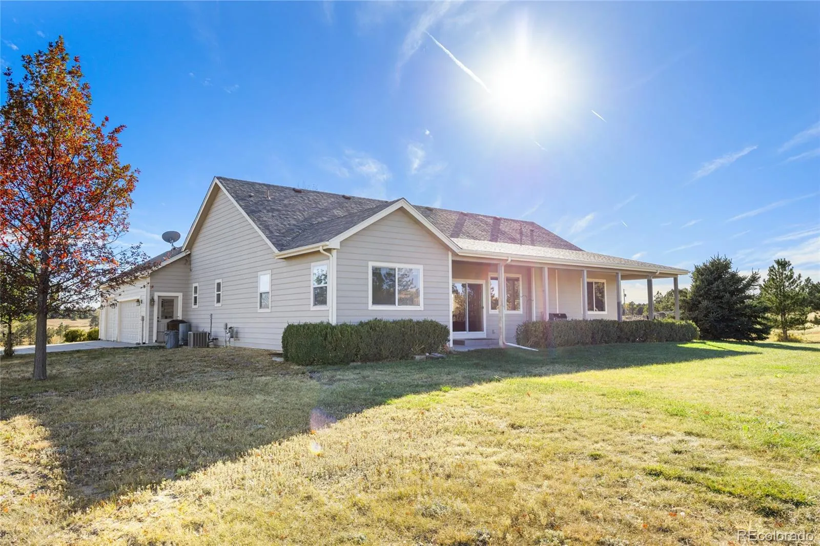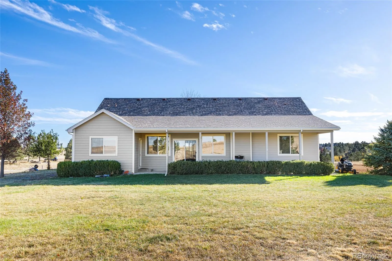 Welcome to your peaceful country retreat in beautiful Elizabeth, Colorado! Nestled on nearly 6 gently rolling acres with mature trees and open meadow views, this inviting ranch-style home perfectly blends comfort, charm, and wide-open living. A lovely water feature with shimmering goldfish greets you upon arrival, setting the tone for the serenity that awaits. Inside, discover an entertainer’s dream, a spacious, open family room flowing seamlessly into the dining area and large kitchen with abundant cabinetry, a bright breakfast nook, and gleaming hickory floors throughout the main living areas. The main floor also features a sunny home office, a generous mudroom off the garage, and two bedrooms, each with ensuite baths, plus a convenient powder room. The finished basement adds exceptional versatility with two additional bedrooms, a full bath, a wet bar, and expansive open areas ideal for recreation, fitness, or hobbies. Enjoy peaceful mornings on the covered back patio, breathtaking sunsets, and plenty of room for animals, gardening, or simply soaking in the quiet beauty of country life — all just minutes from town. Schedule your private showing today and be home for the holidays!