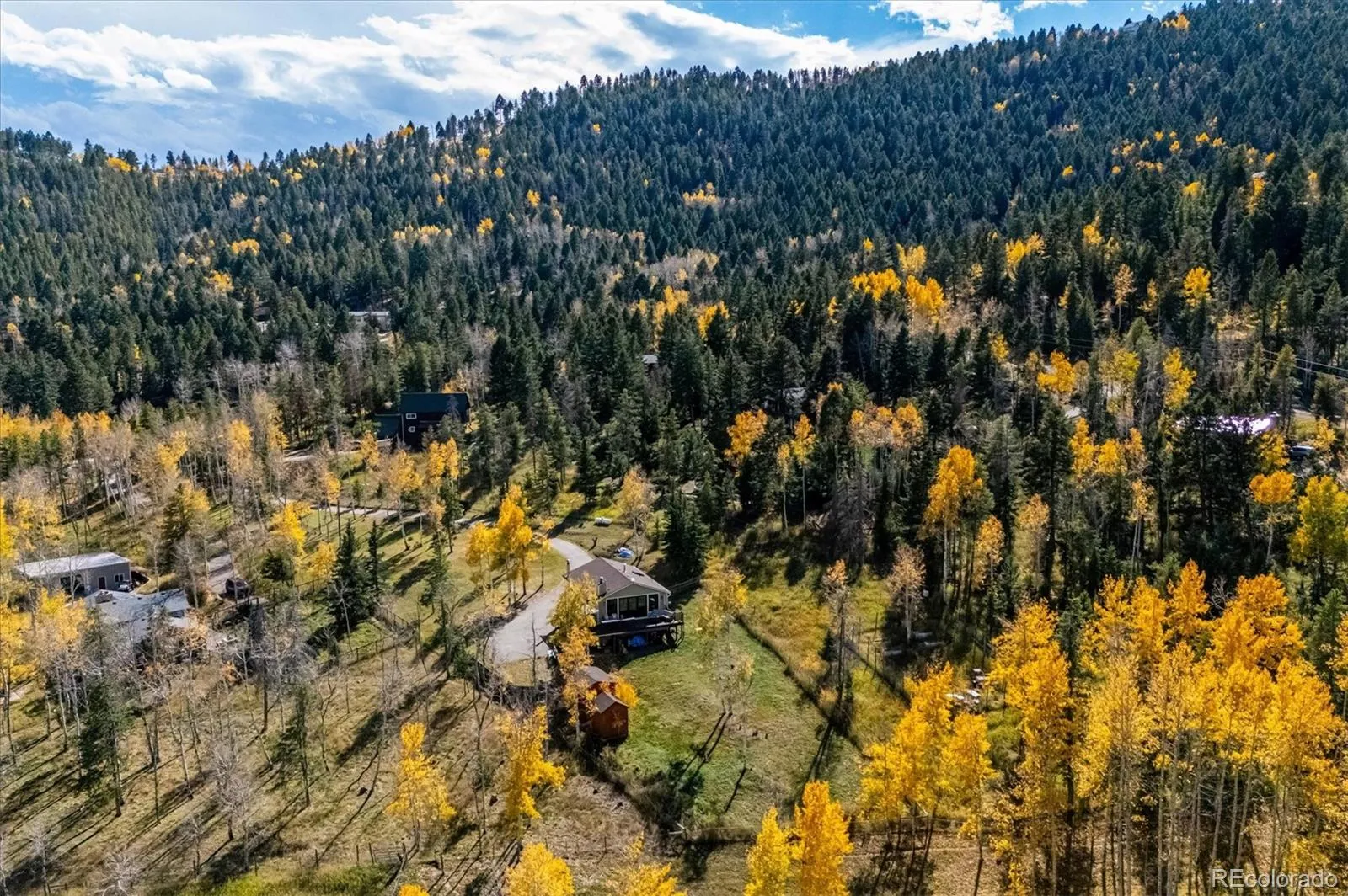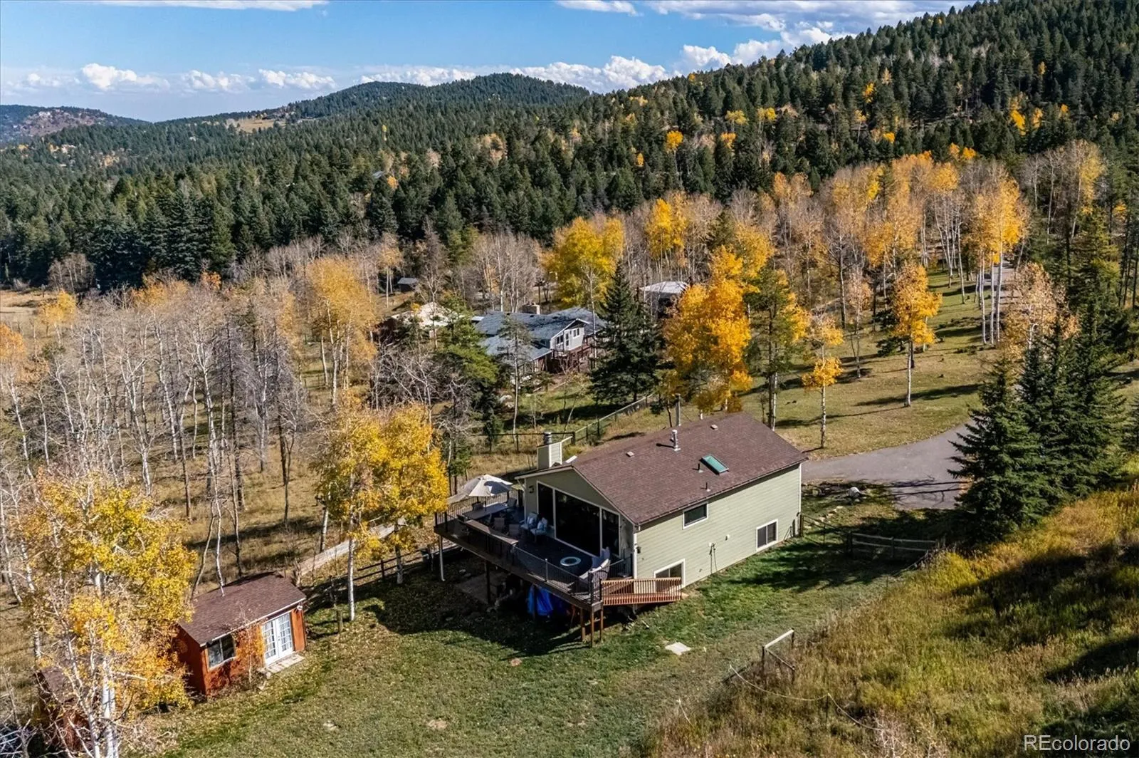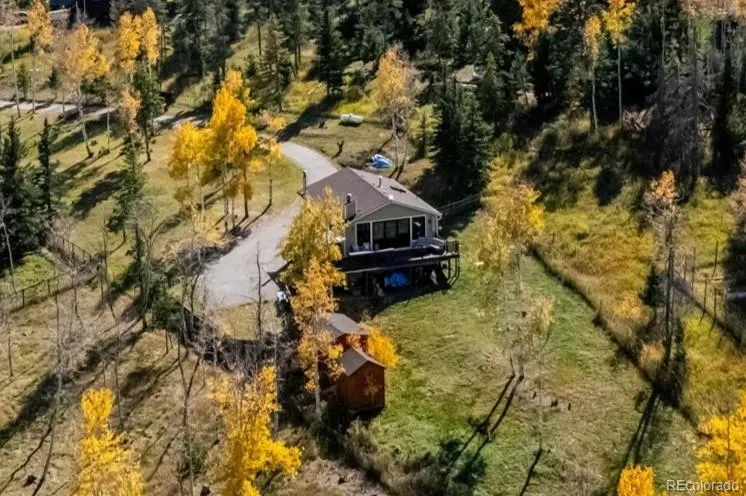 Nestled among the Aspens in the highly sought-after community of Silver Ranch Estates, this stunning home offers the perfect blend of comfort, style, and breathtaking natural beauty. Located on a quiet cul-de-sac, you’ll enjoy peace, privacy, and unmatched 360-degree mountain views that make this property truly one of a kind. The bright, open-concept kitchen is ideal for entertaining, featuring a spacious island, stainless steel appliances, soft-close cabinetry, granite countertops, a charming farmhouse sink, and plenty of natural light. The adjacent great room showcases soaring tongue-and-groove vaulted ceilings and a cozy, yet expansive atmosphere perfect for gatherings or quiet evenings. Open the impressive wall of glass bi-fold doors to seamlessly extend your living space onto the expansive deck—perfect for taking in the views or enjoying Colorado’s fresh mountain air. When the weather turns, head downstairs to the covered patio with a rain-free roof system, allowing you to stay outside and dry no matter the forecast. Warm up during snowy winter nights by one of the two highly efficient wood stoves, which also help significantly reduce heating costs. Additional energy-efficient features include new windows upstairs, a tankless hot water heater, and ceiling fans throughout. This home was built with long-term durability in mind, featuring impact-resistant shingles and cement board siding—features that may qualify for reduced homeowner’s insurance premiums. The domestic well (with both UV and canister filters) is permitted for watering a horse or small livestock. Additional features include a reverse osmosis water purification system, paved driveway, and a spacious shed/workshop for all your toys. Don’t miss this unique opportunity to own a piece of mountain paradise. Schedule your private showing today!