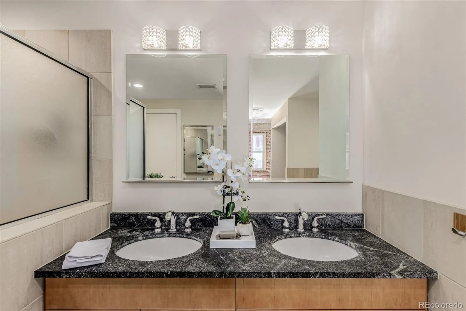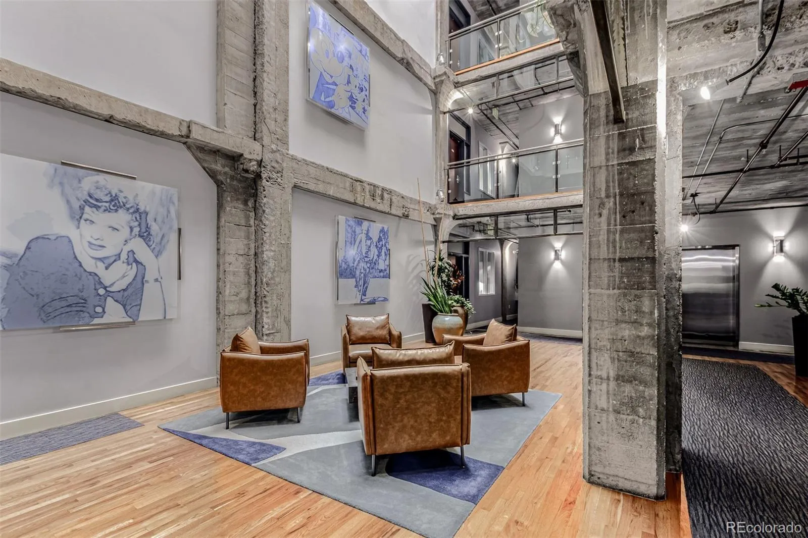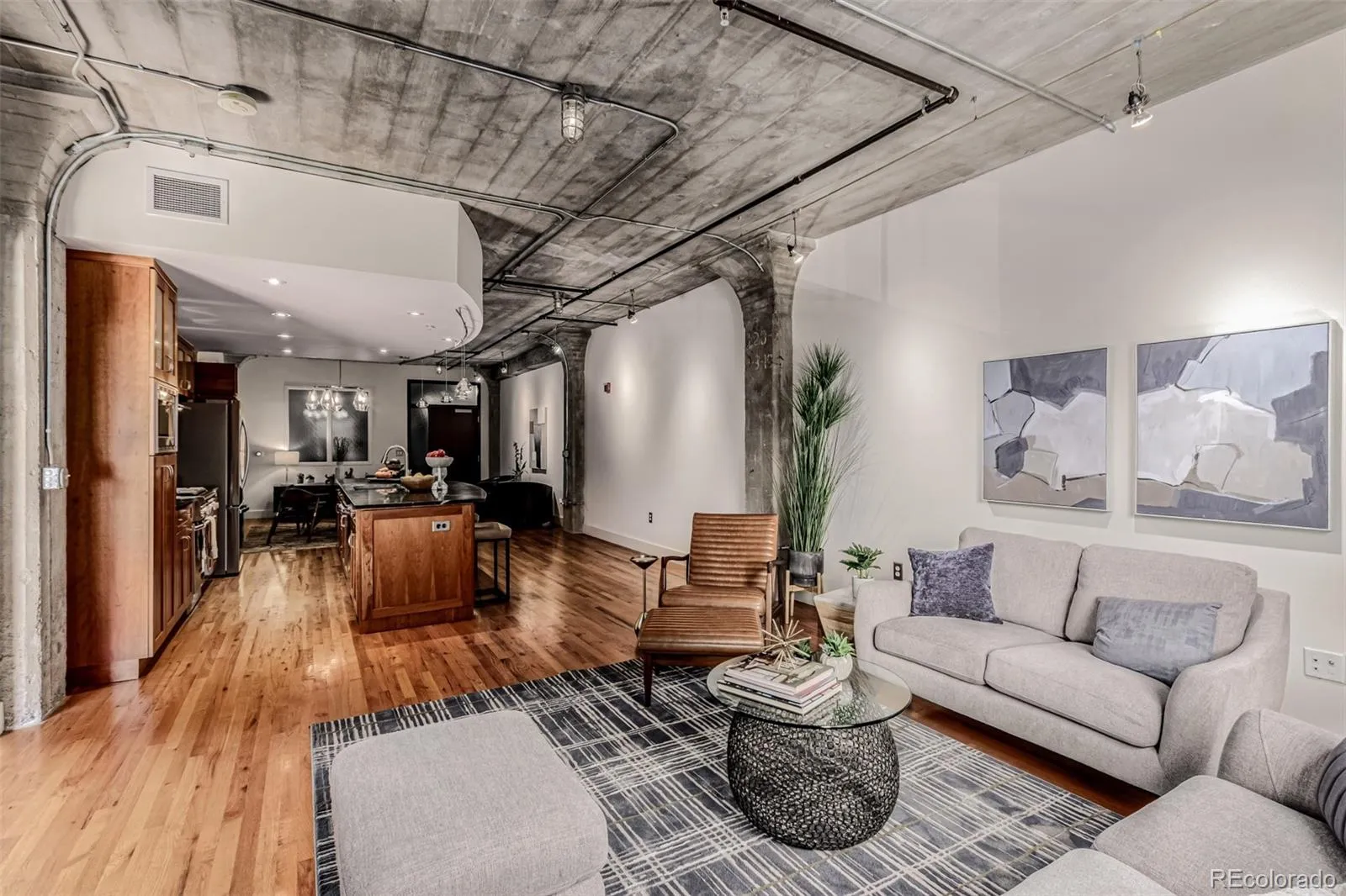 Stunning historic loft in the heart of LoDo! This residence combines character and modern comfort with exposed brick & concrete, high ceilings, and hardwood floors throughout. The spacious eat-in kitchen features a full subway tile backsplash, under-cabinet lighting, Soapstone countertops, and stainless-steel appliances including a refrigerator, gas range with hood, dishwasher, microwave, and beverage refrigerator. Enjoy both a casual dining area and a formal dining space ideal for entertaining. The living room showcases a custom contemporary metal and wood built-in entertainment center. Both bedrooms are fully enclosed — a rare feature in a loft — offering privacy and quiet. The primary suite includes a luxurious 5-piece bath and two closets, while the second bedroom suite is perfect for guests or a home office. Additional highlights include a side-by-side washer and dryer, two deeded parking spaces, and a personal storage unit. Amenities include central interior courtyard flooded with natural light and a common area roof top deck with BBQ grill, dining table and striking views! Experience the best of downtown living with this stylish and well-appointed LoDo loft in a prime location near Union Station, light rail, Riverfront Park, bike paths, restaurants, DCPA & more.