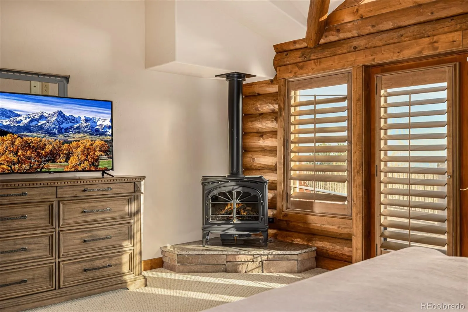 Three of the bedrooms feature en-suite baths, including a spacious primary suite with a spa-like five-piece bath and private balcony. A lower-level media room with theater seating offers a cozy escape for movie nights or game days. Additional features include a wired backup generator, private well, propane heat, and high-speed internet—ensuring both comfort and convenience in a self-sufficient mountain setting.