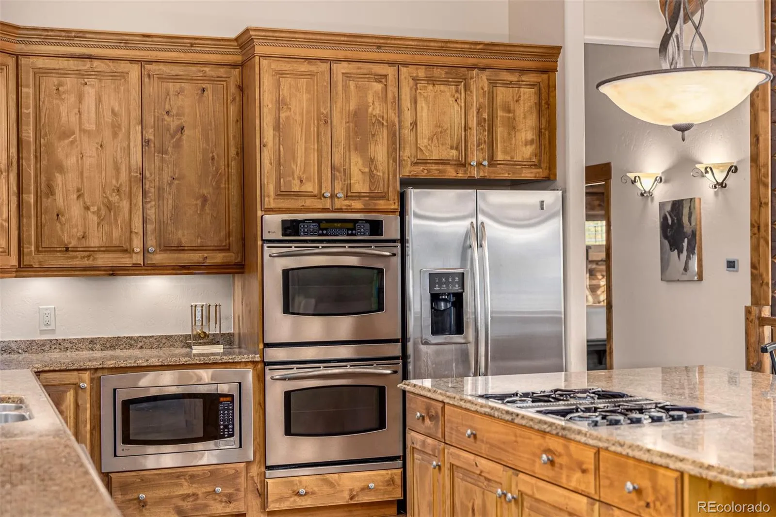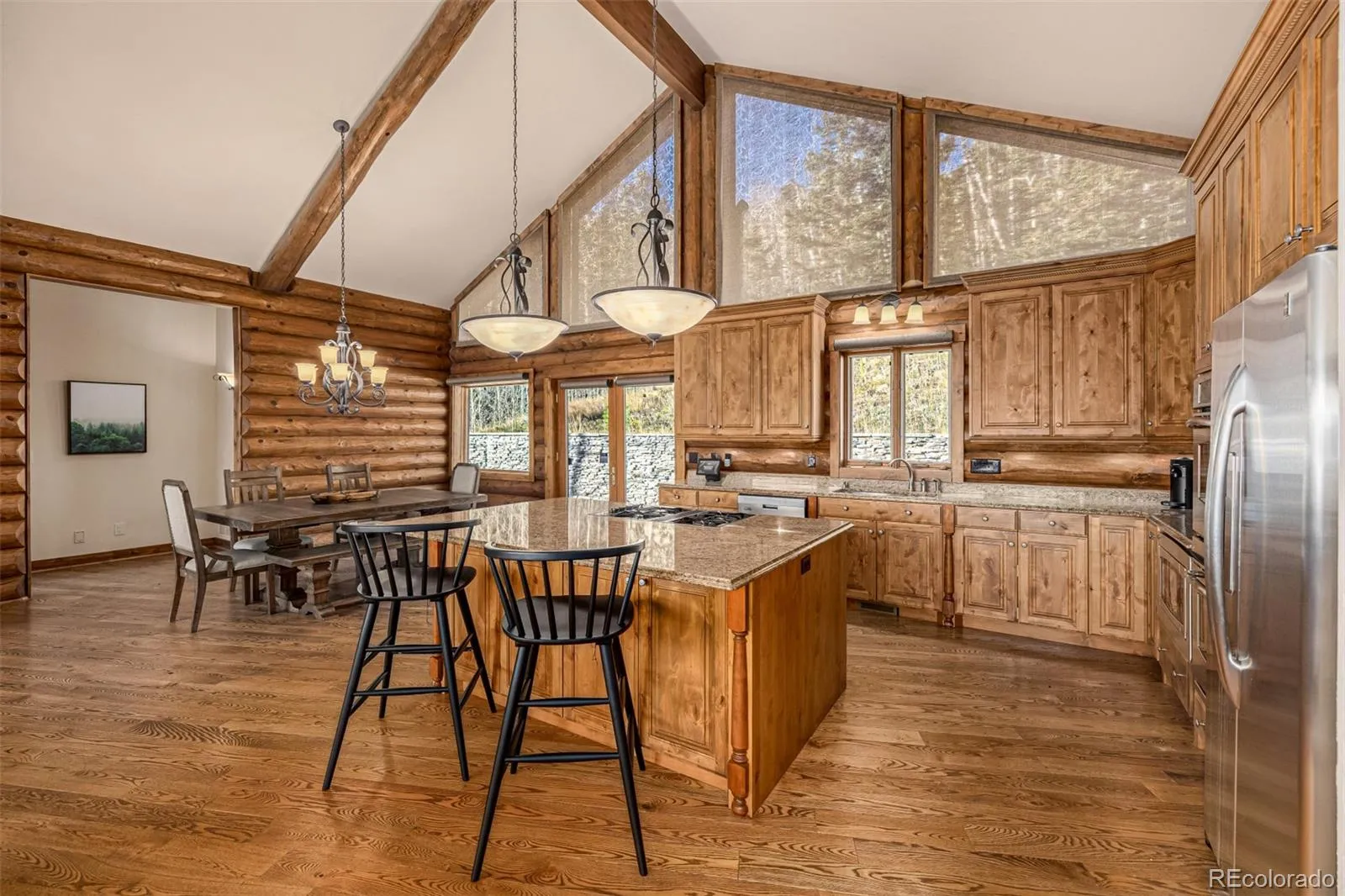 The chef’s kitchen is outfitted with knotty alder cabinetry, granite countertops, a gas range, and generous prep space—opening seamlessly to the dining area and great room. Multiple access points lead to expansive decks and outdoor living areas, perfect for entertaining or enjoying the sunrise with coffee in hand.