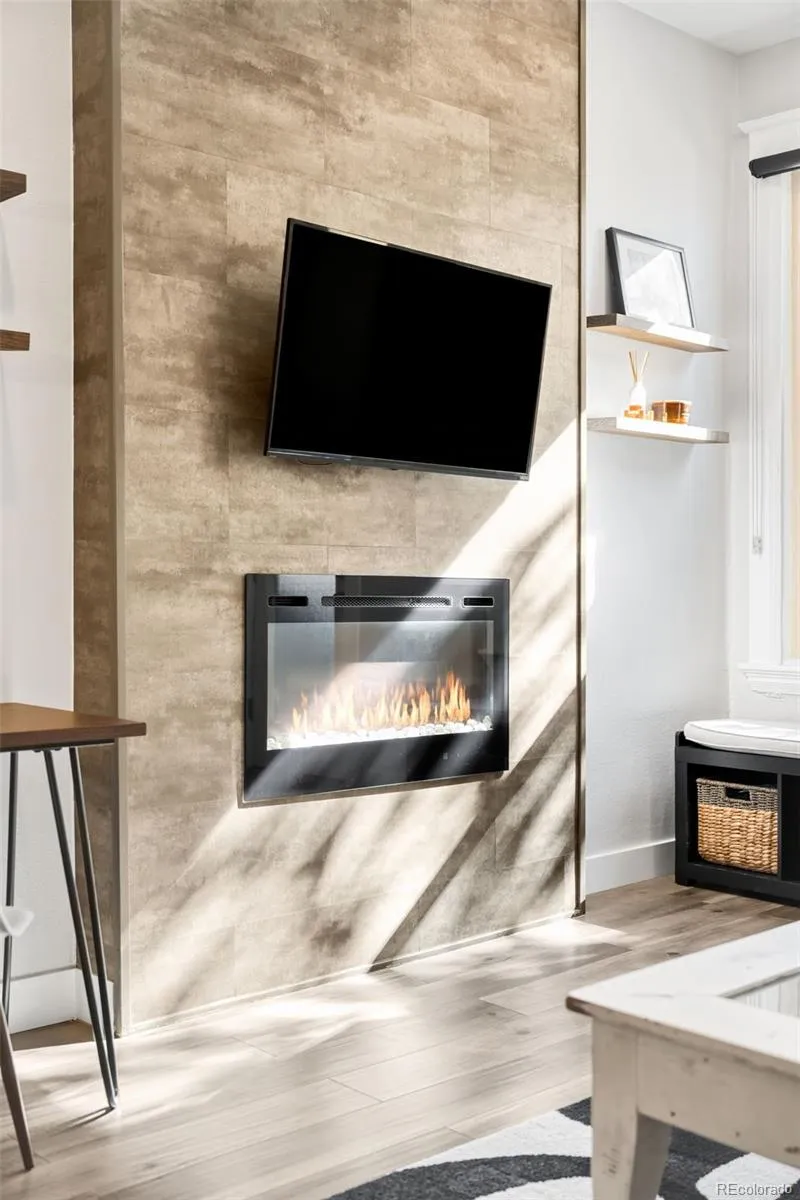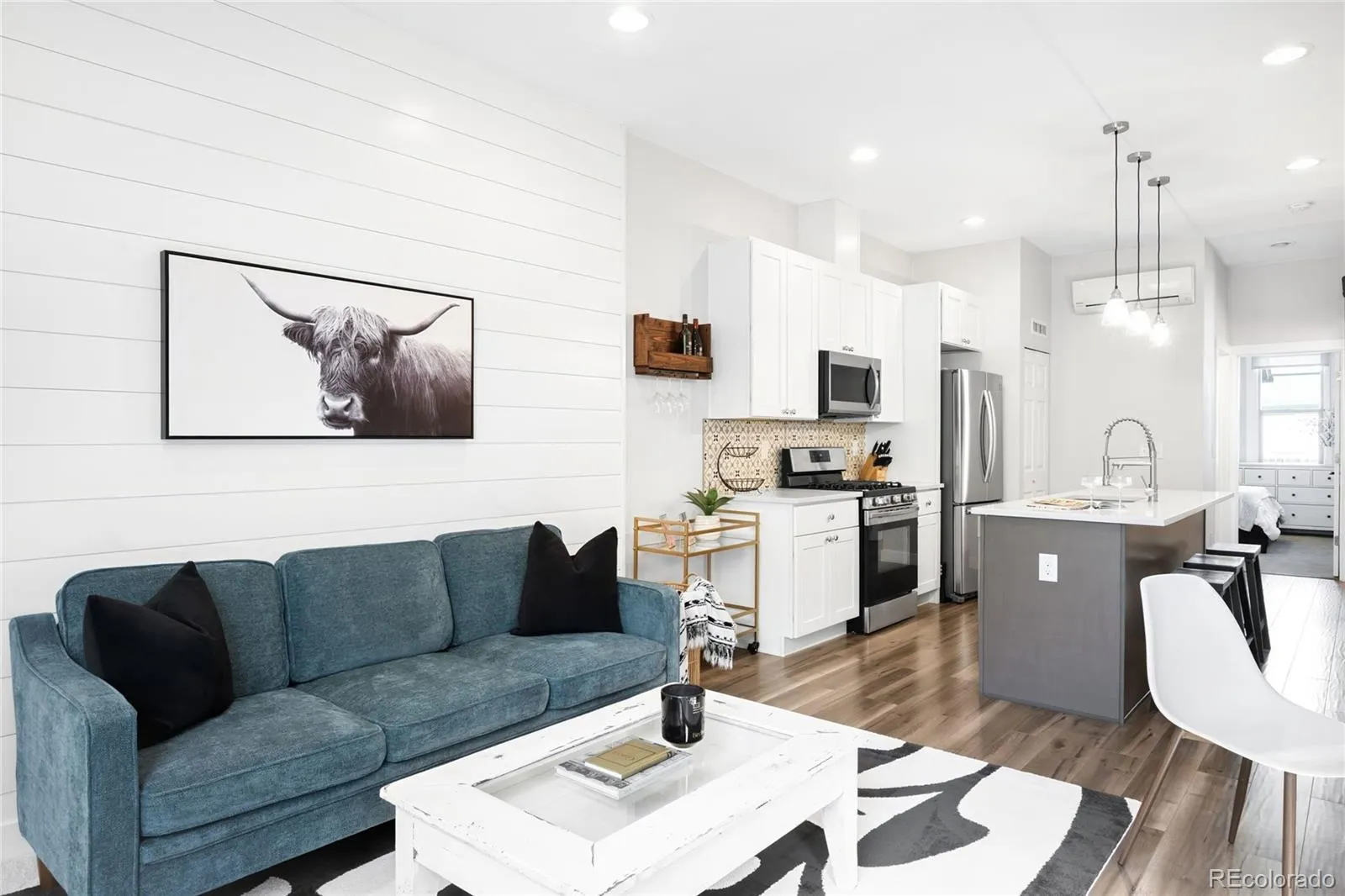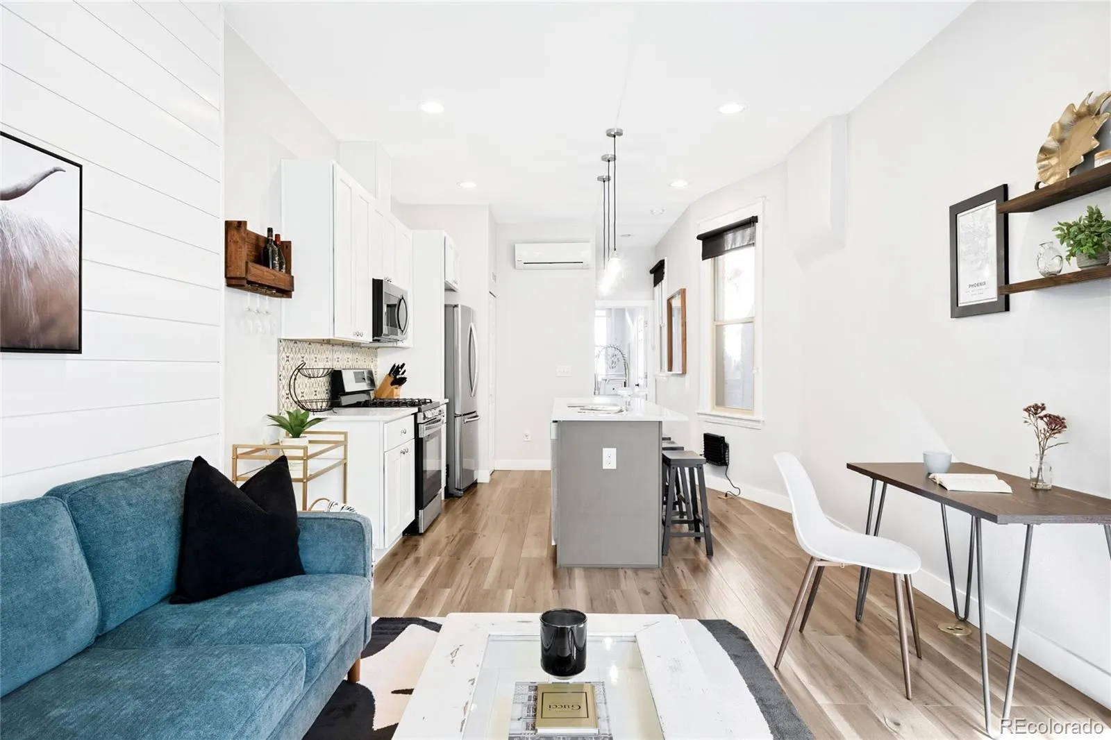 This historic townhome near Denver’s vibrant RiNo and Whittier neighborhoods showcases timeless character with thoughtful updates. Tall 10-foot ceilings create a bright, airy atmosphere, while a floor-to-ceiling gas fireplace anchors the open-concept living area in modern sophistication. The kitchen maximizes space with a center island with seating, updated appliances and refined finishes — ideal for everyday living and entertaining alike. The bedroom is a cozy escape with ample closet space and a nearby bathroom with sleek, updated finishes. Comfort meets efficiency with separate AC units, a tankless water heater, and newly updated systems including sewer and electrical panels. Enjoy effortless indoor-outdoor living with a cozy, private backyard, all within a park-facing setting and no HOA (party wall agreement). Featuring new flooring, fresh tile work, and in-unit laundry, this home offers modern ease in one of Denver’s most dynamic locations.