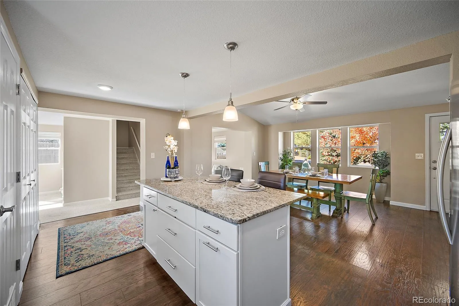 Step inside to an open, inviting floor plan with rich natural light, updated finishes, and warm vinyl floors that flow through the kitchen and dining area. The spacious kitchen features stainless steel appliances, granite countertops, a breakfast bar, and plenty of storage.
