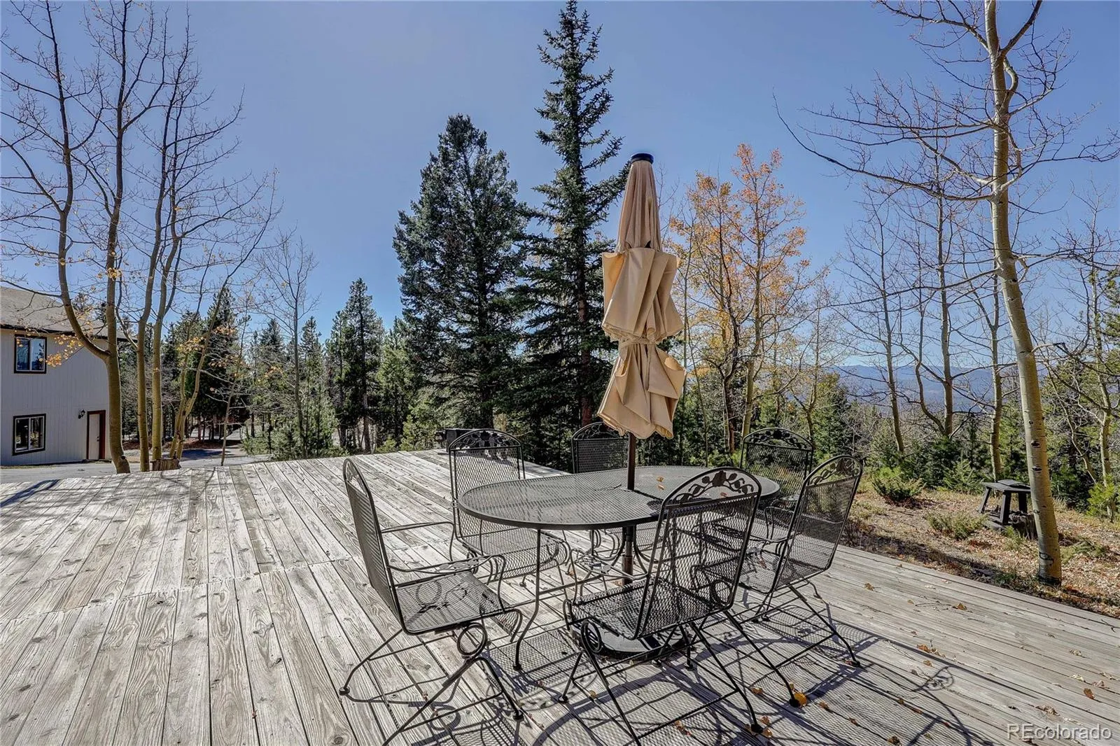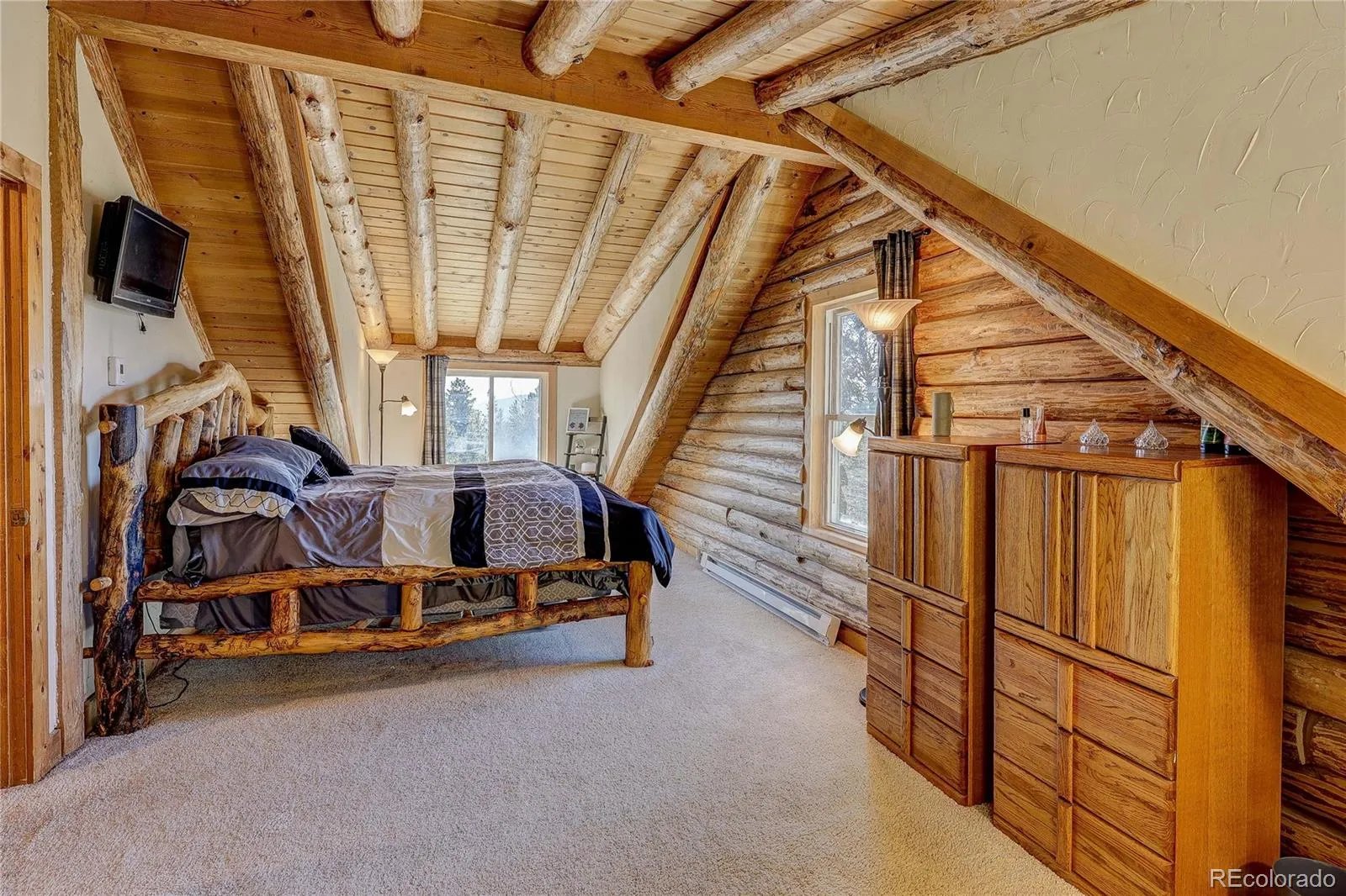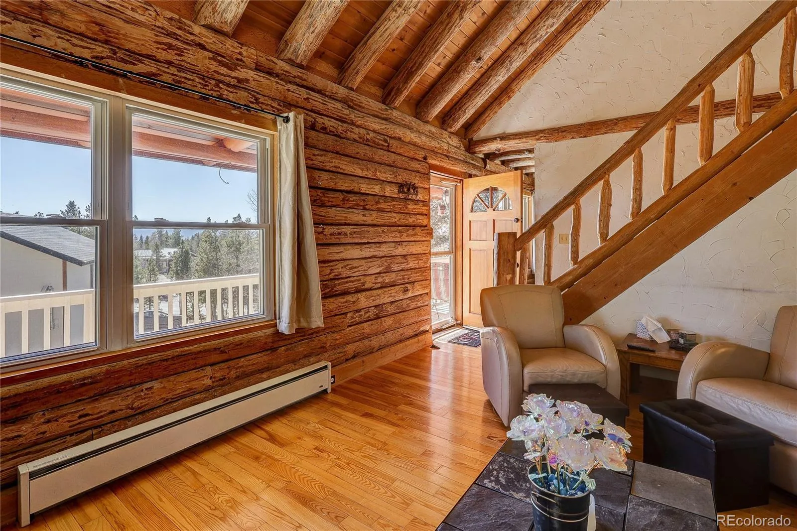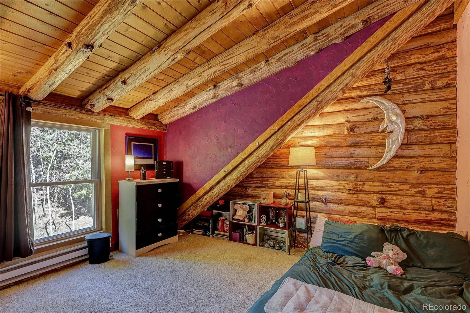 Beautiful log home with panoramic views! Pride of ownership with thoughtful updates and meticulous maintenance. A sunny, South facing, paved driveway with beautiful aspen trees welcome you to this immaculate 4 bedroom, 3 bathroom home, on 2+ acres with picturesque views of Staunton State Park, plus more! There is an amazing, finished living space above the garage that could be ideal for an office, workshop, yoga or dance studio, etc.! The space above the garage includes a pellet stove and a closet. This charming mountain home’s high end features include a Coleman Generator Powermate 6250 Watts, a 1-year old roof, and Champion Windows with warranty. The bright living room features a vaulted ceiling and one of the home’s two additional pellet stoves, creating a cozy space. The inviting dining area adjacent to the kitchen is perfect for easy living and entertaining. The kitchen also includes its own balcony. Enjoy the magnificent mountain views from the deck accessible from the living area. The main floor also includes a bedroom, and an updated ¾ bathroom. The walk-out lower level features the bright family area with a pellet stove, and access to the large patio. The lower level also includes a bedroom with beautiful built-in shelving and a walk-in closet, an updated ¾ bathroom, and the utility/laundry area. The upper-level features two additional bedrooms, including the primary room, and a full bath. Immerse yourself in the Colorado lifestyle on your large patio, with a stunning atmosphere and abundant wildlife. Close to 285 for convenience, 1 minute to the local firehouse, and the school bus picks up at the end of the driveway. Welcome to your Colorado dream home!