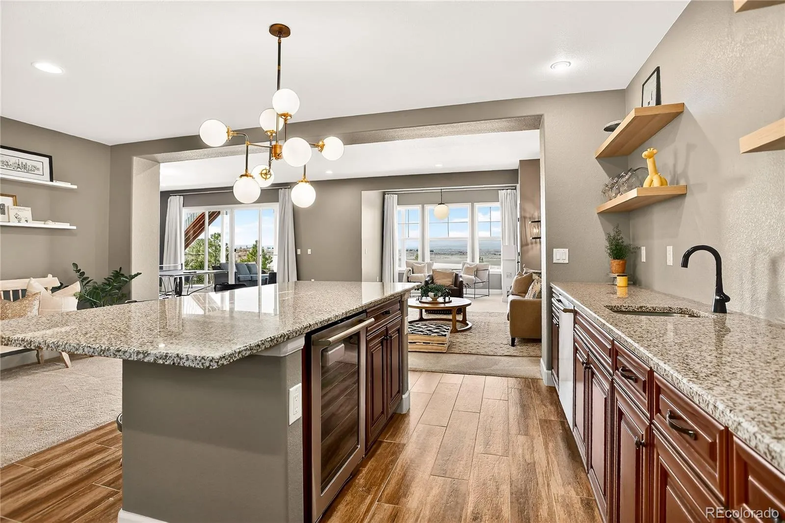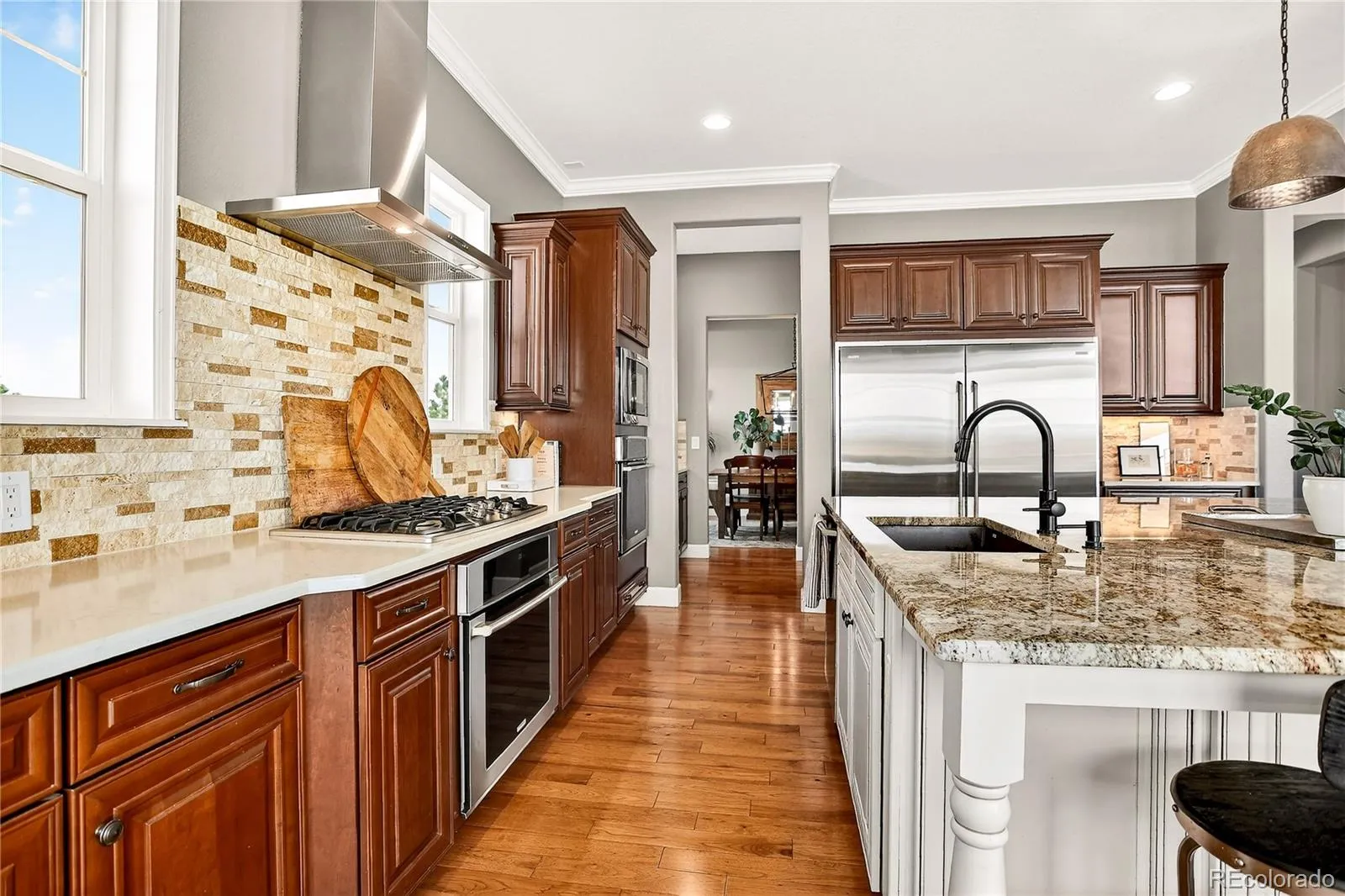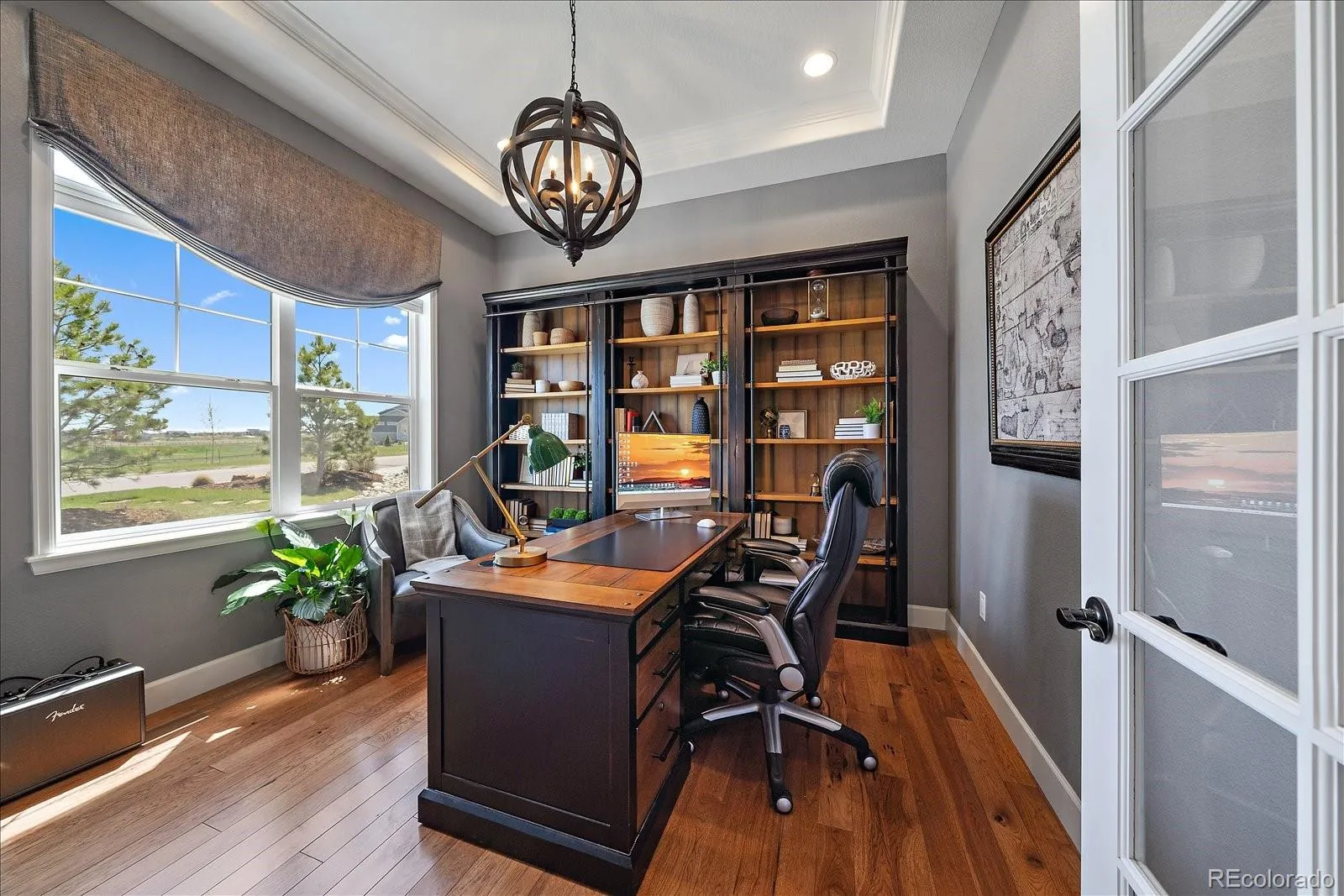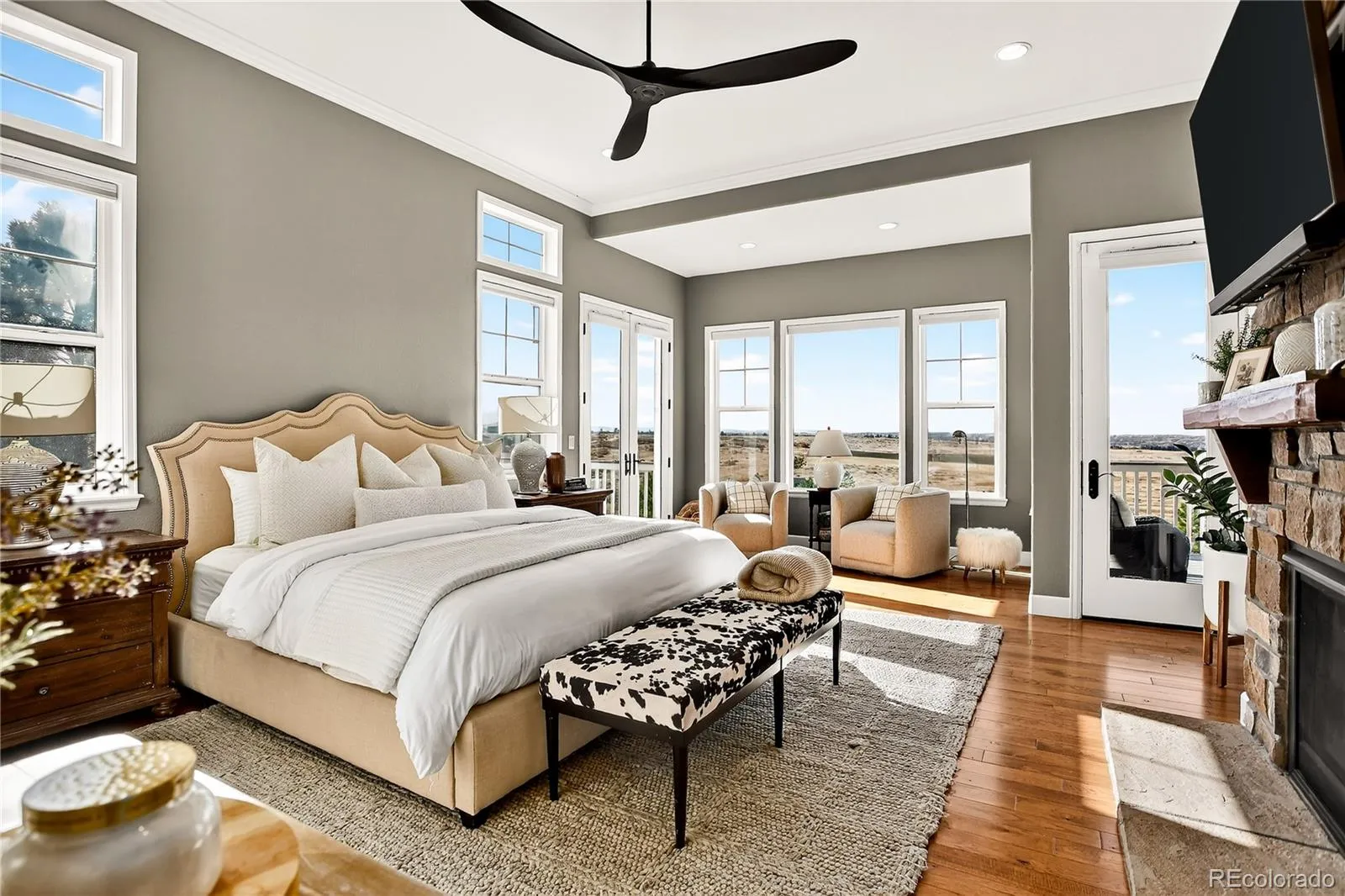 Introducing 8980 Red Primrose where breathtaking mountain views, endless open space and elegant design come together on a sprawling 3-acre estate bordering Parker & feeding into highly-rated Parker schools. This 6,500 sq. ft. walk-out ranch blends elevated style with functional luxury offering incredible indoor & outdoor living spaces designed to impress at every turn. Step inside to find a thoughtfully crafted floorplan & timeless finishes that immediately set the tone for gracious living. The gourmet kitchen is a showpiece, complete with high-end appliances, a massive center island & a spacious walk-in pantry. The adjoining great room with coffered ceilings & rustic stone fireplace opens to a wall of windows that perfectly frame sweeping Front Range views – a daily reminder of why Colorado is so special. The primary retreat is a true sanctuary, featuring French doors that lead to a private deck, a cozy fireplace & a spa-worthy en-suite with dual vanities, a stunning hammered copper soaking tub & walk-in shower. The custom closet connects directly to the laundry room for everyday ease. Two additional bedroom suites, a dedicated home office, a versatile bonus room with French doors to a private patio & a well-planned mudroom with built in storage complete the main level. The finished walk-out basement mirrors the beauty above offering 3 additional bedrooms, 2 baths, a media room wired for multiple screens, a well-appointed bar & a spacious rec room opening yet another outdoor entertaining area. Whether hosting summer barbecues, watching the sun set over the Rockies or tending to the fenced garden, this backyard oasis offers a level of privacy & tranquility that’s hard to match. Car enthusiasts will love the oversized 4-car garage, providing ample room for vehicles, tools & toys. With its unparalleled mountain views, easy access to Parker’s amenities, and luxury finishes throughout, this property offers a rare opportunity to experience Colorado living at its finest.