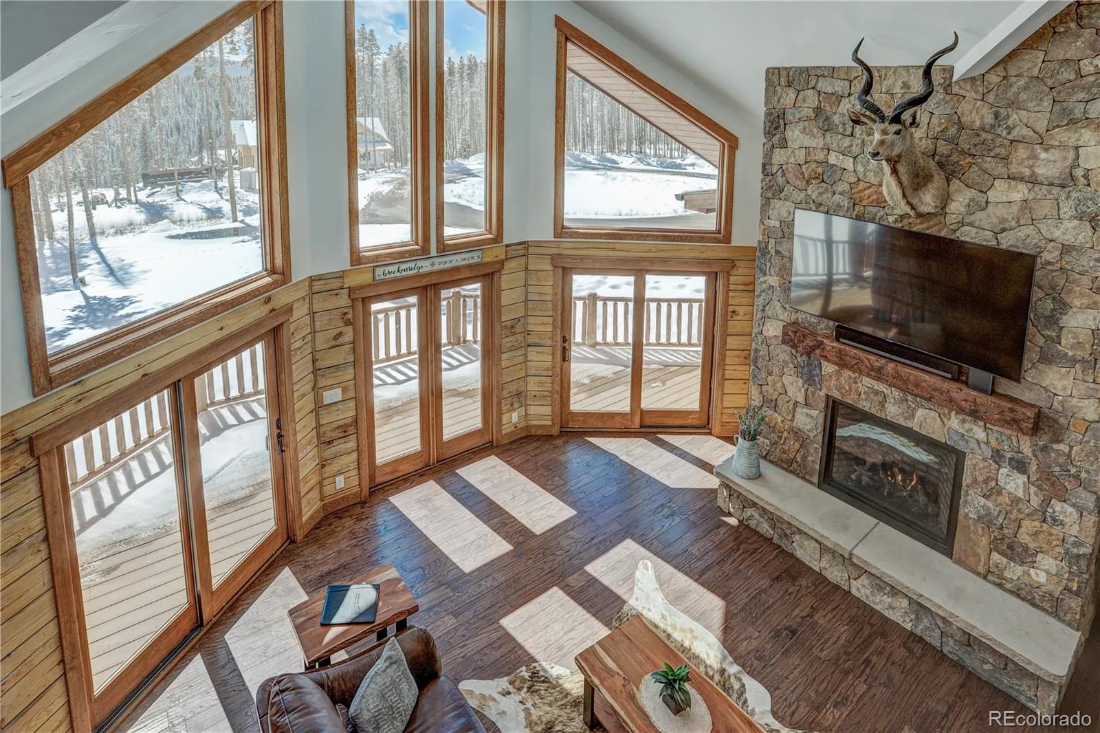 Discover the ultimate in mountain luxury Colorado log home perfectly positioned in Breckenridge’s coveted Peak 7 area. This beautifully crafted 5-bedroom, 4.5-bath retreat offers an ideal blend of rustic charm and modern comfort, designed to accommodate family and friends with ease. The stunning great room is a true centerpiece, featuring a floor-to-ceiling wall of windows that frame breathtaking views and fill the space with natural light. Gather around the impressive stone fireplace or step out onto the expansive wrap-around deck to enjoy the crisp alpine air. The open-concept kitchen is fully equipped for entertaining, offering premium finishes, abundant counter space, and seamless flow into the dining and living areas. With two inviting great rooms, a large loft, and a spacious media room with a built-in bar, there’s room for everyone to relax or play. Three bedrooms are ensuite! Enjoy peace and privacy surrounded by forested beauty, yet remain just a 12-minute drive to downtown Breckenridge and world-class skiing. A two-car garage, ample storage, and a long driveway offer convenience and space for all your mountain gear. The home comes furnished, move-in ready, and designed for year-round enjoyment!