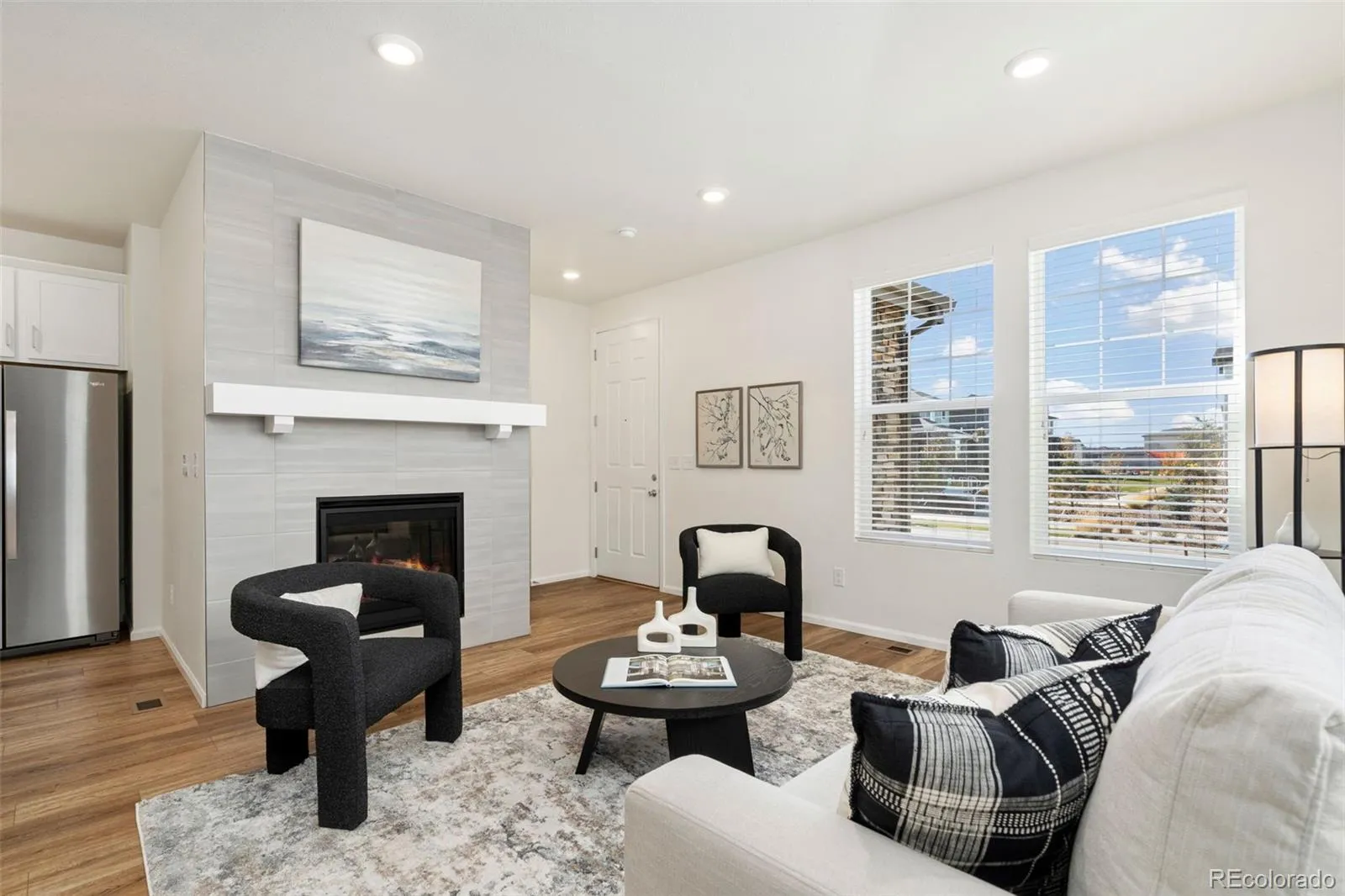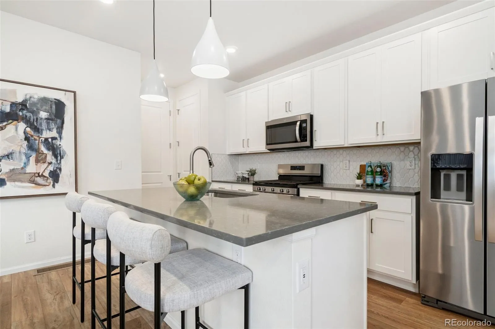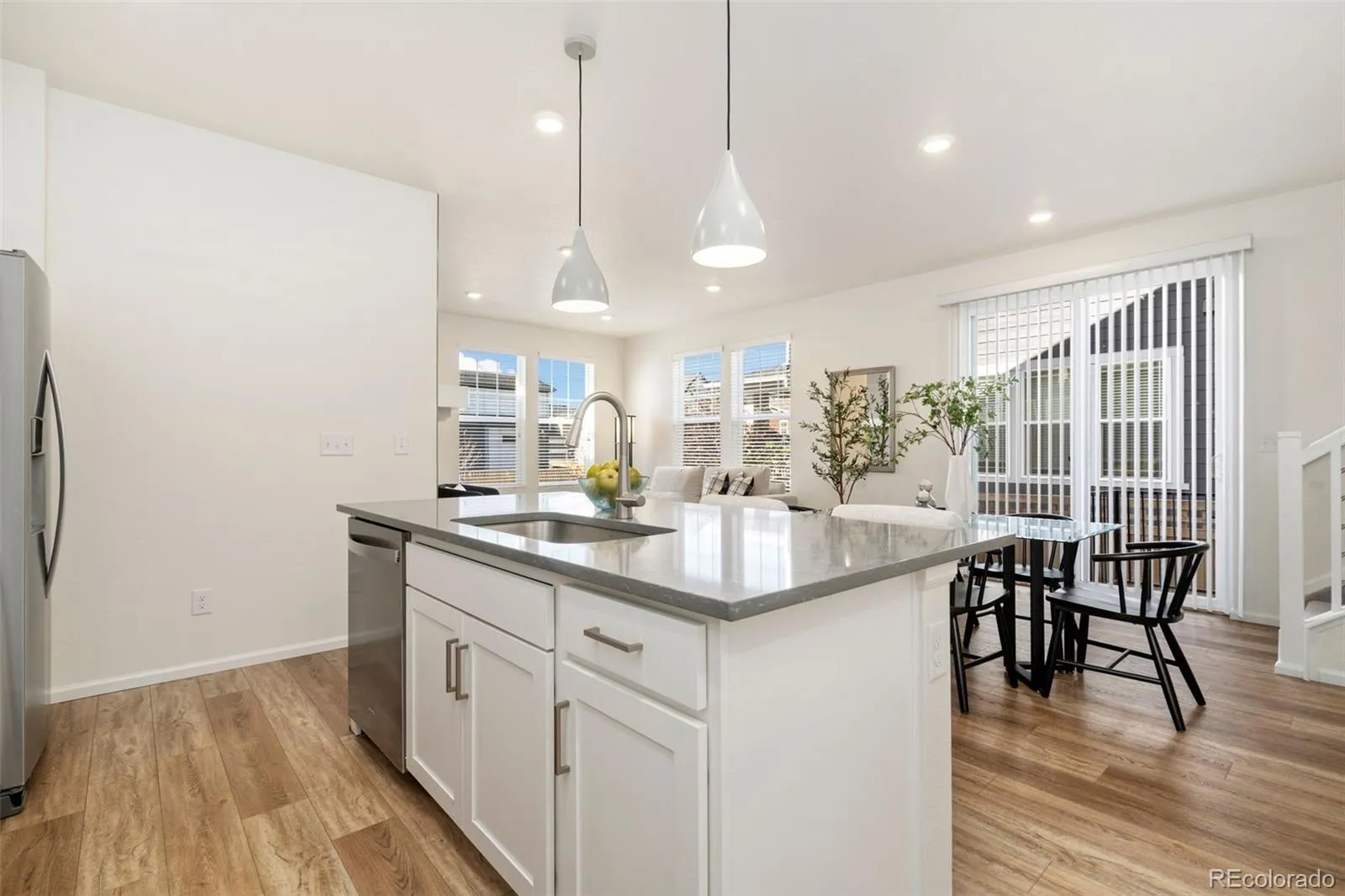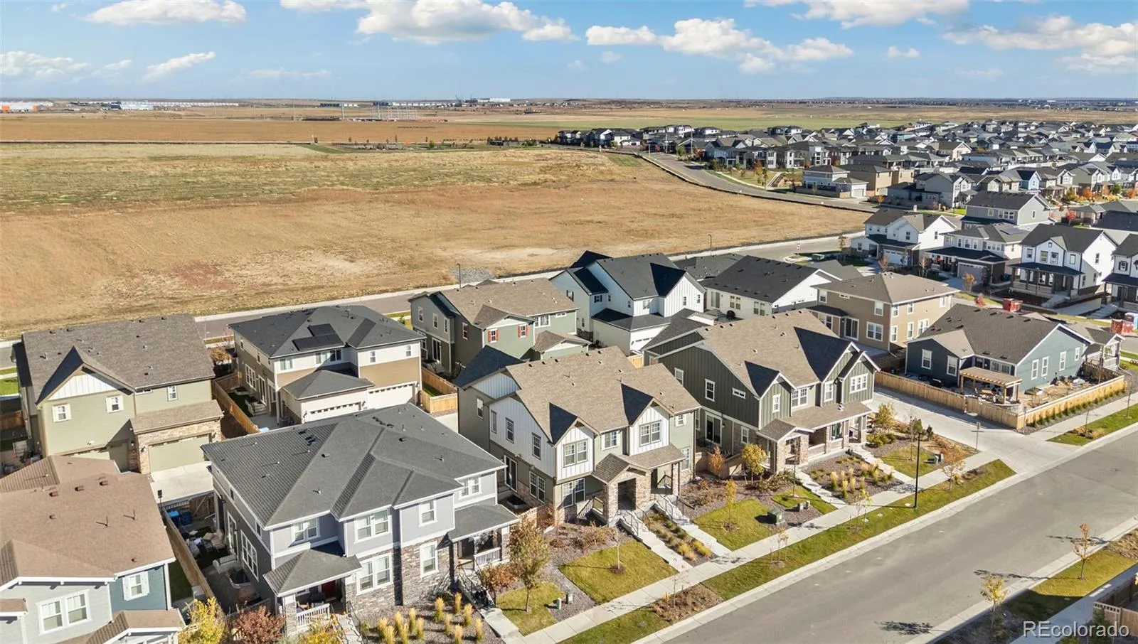Nearly new three-bedroom, three-bath home located in the sought-after Painted Prairie community near Denver International Airport. This residence showcases an open floor plan with the refined details of modern construction, including subway tile backsplash, granite countertops, wood flooring, and custom lighting throughout. Large Picture windows invite an abundance of natural light, creating a bright and inviting atmosphere.